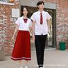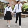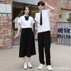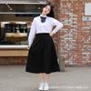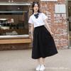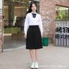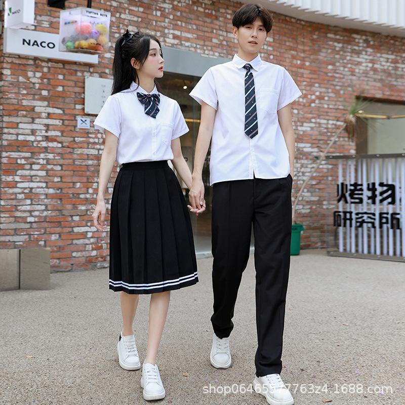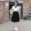 Girls short sleeves + black pleated midi skirt + black tie, Girls short sleeves + black skirt + black tie, Gir...
