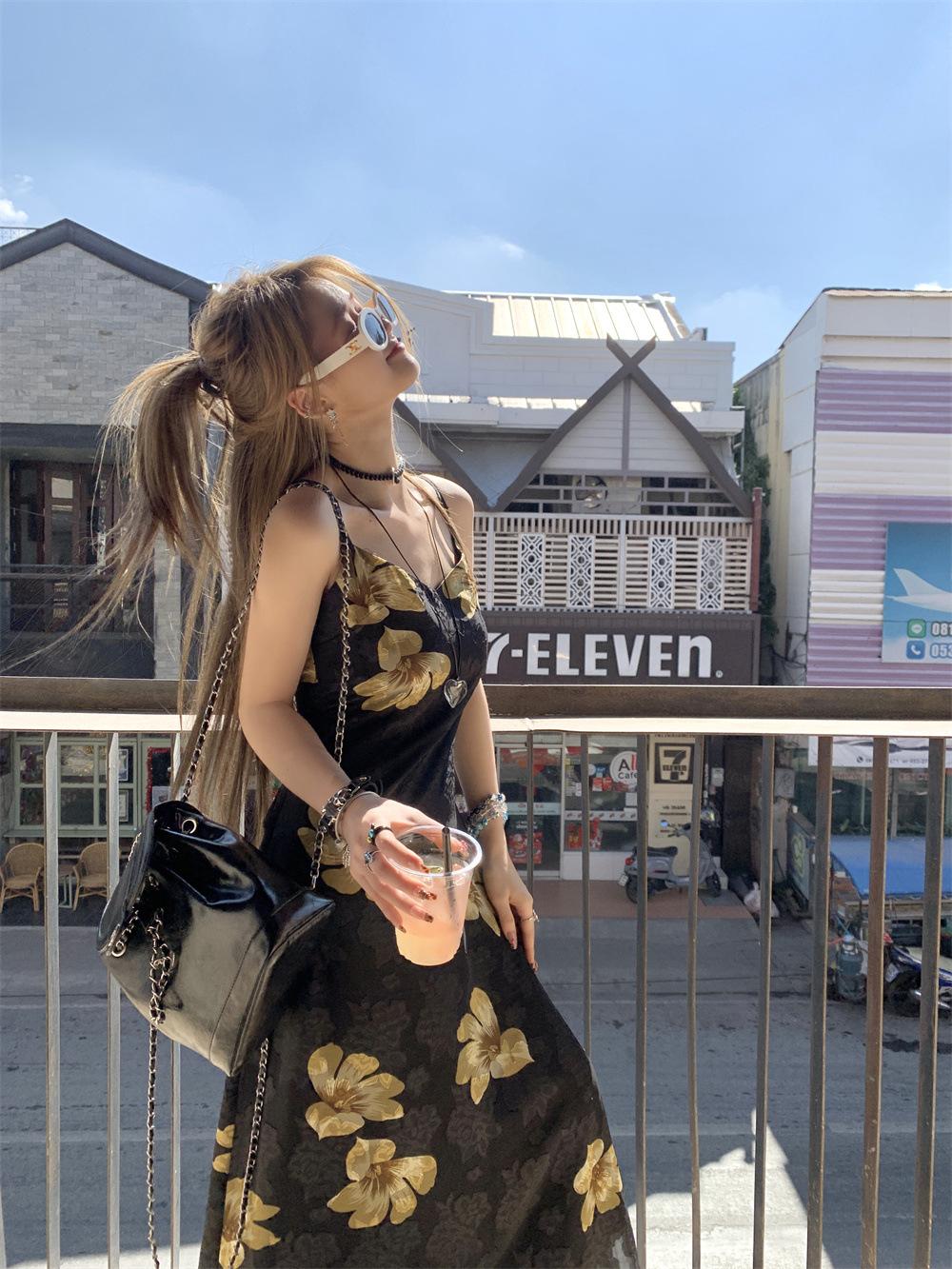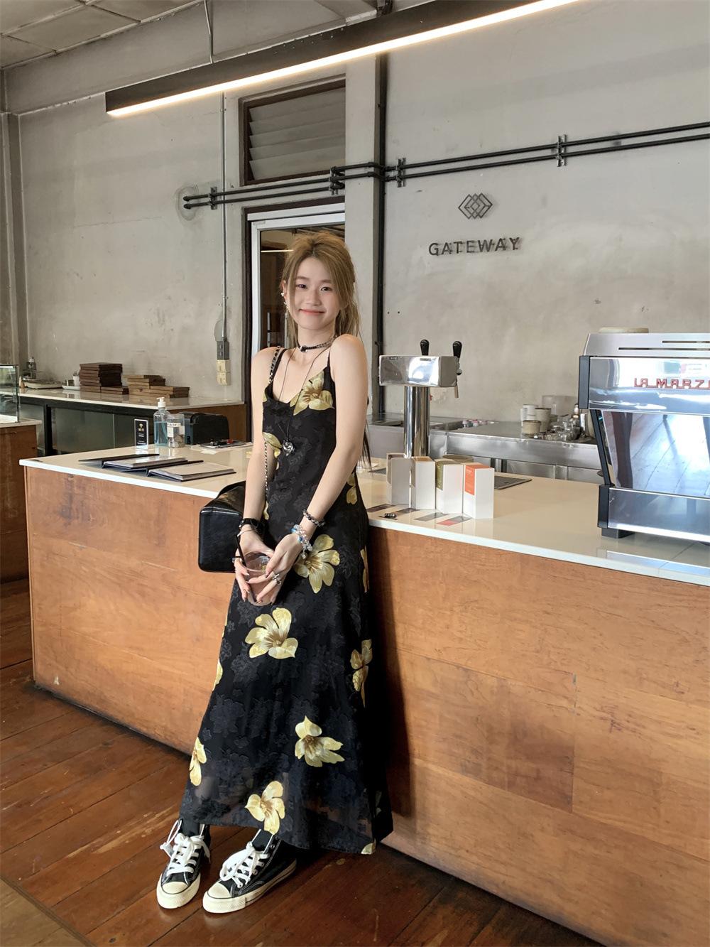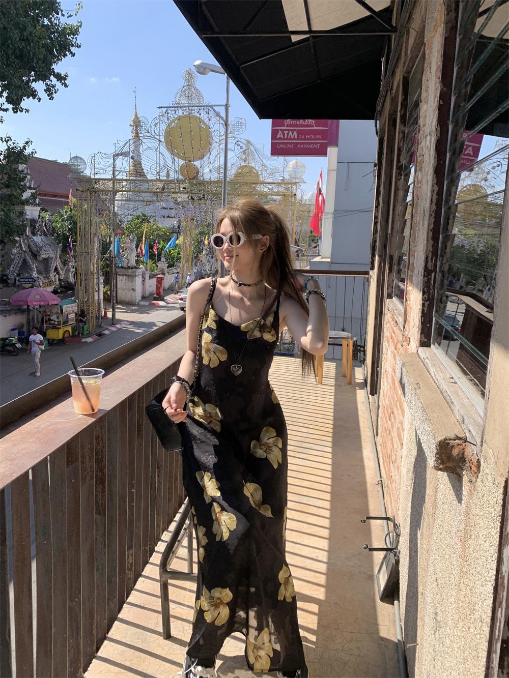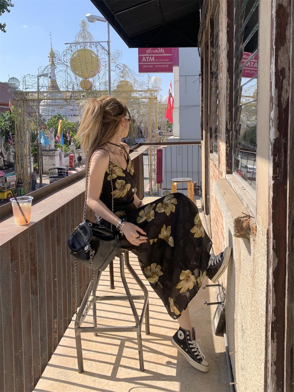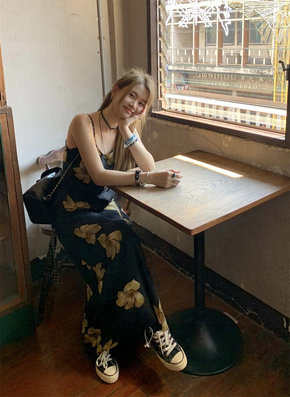 Vestido de Tirantes Floral Retro Francés de Talla Grande Verano Vacaciones en la Costa Hermana Real Elegante Look Adelgazante Cintura Falda Larga A-Line