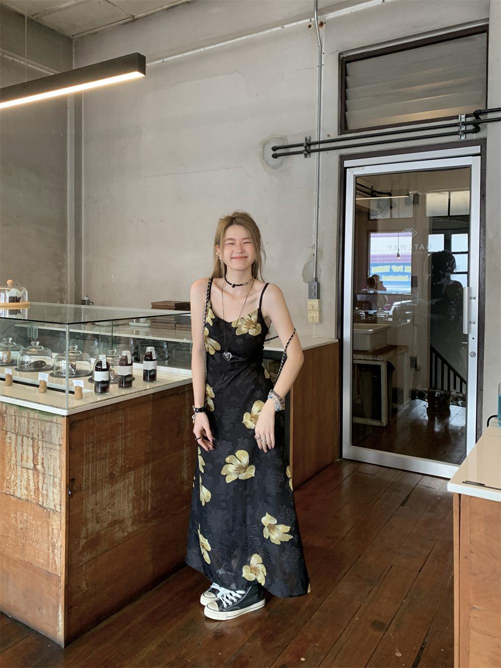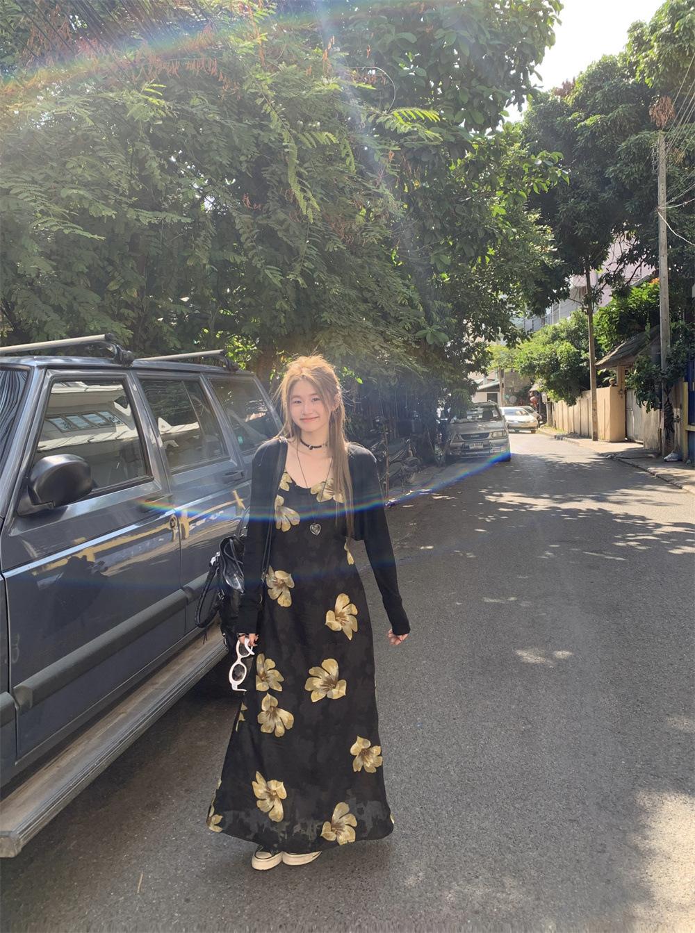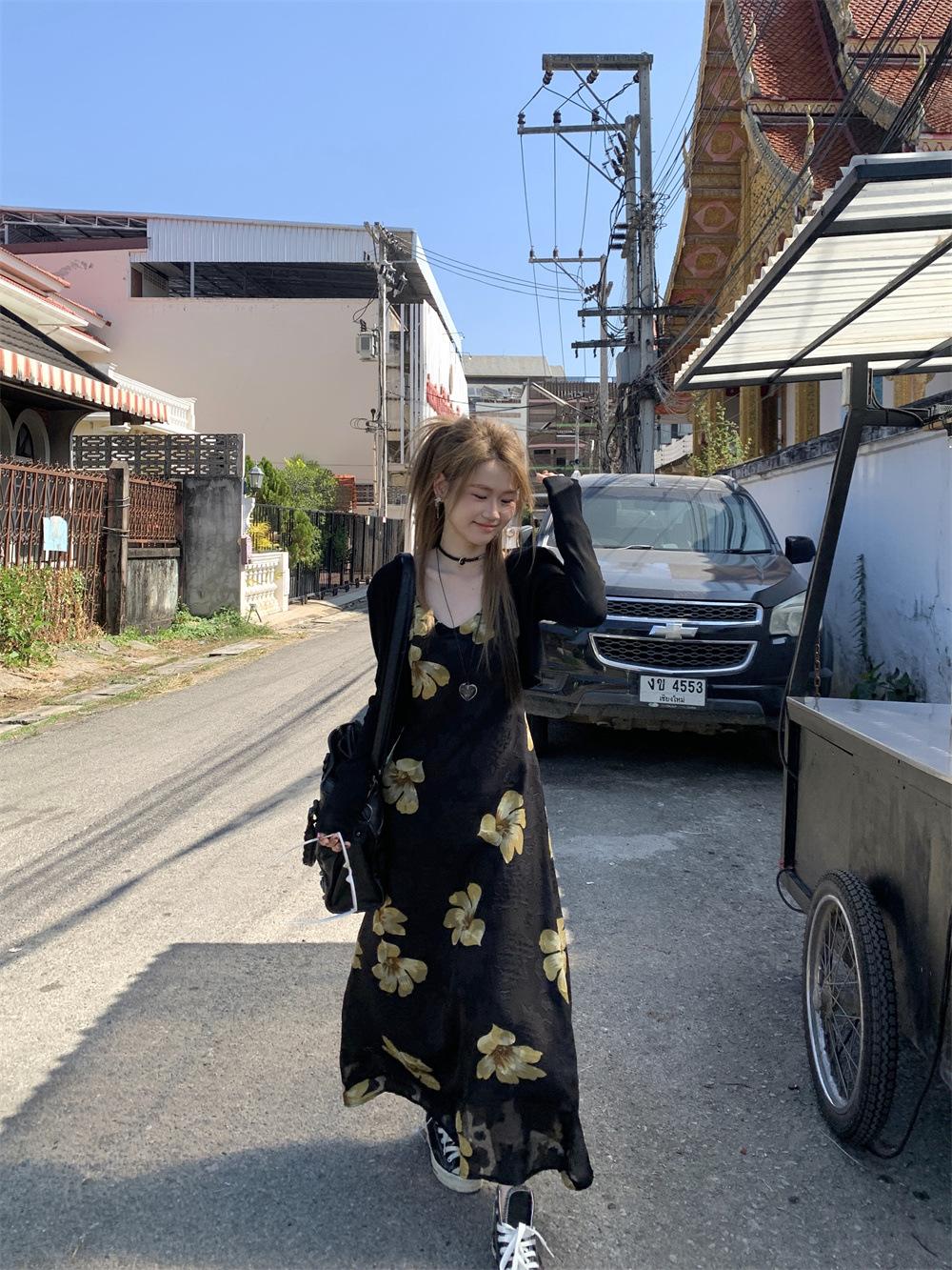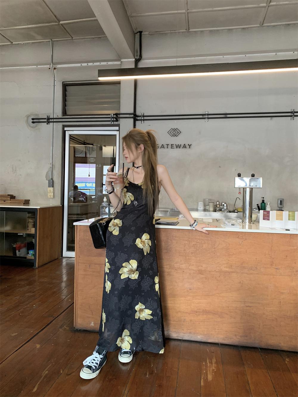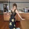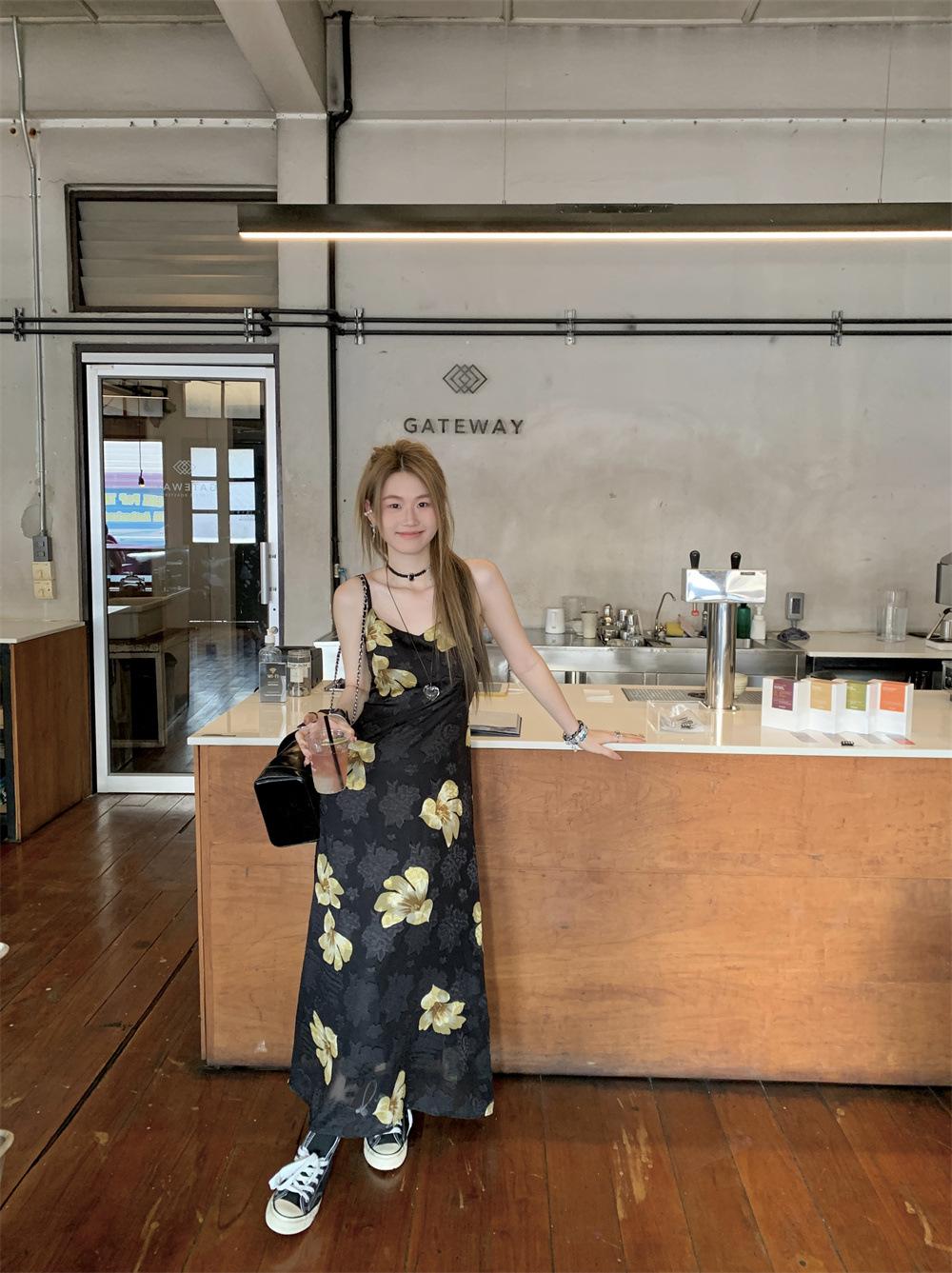 Vestido de Tirantes Floral Retro Francés de Talla Grande Verano Vacaciones en la Costa Hermana Real Elegante Look Adelgazante Cintura Falda Larga A-Line