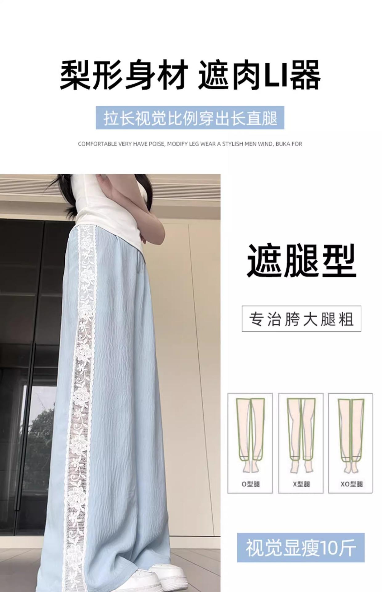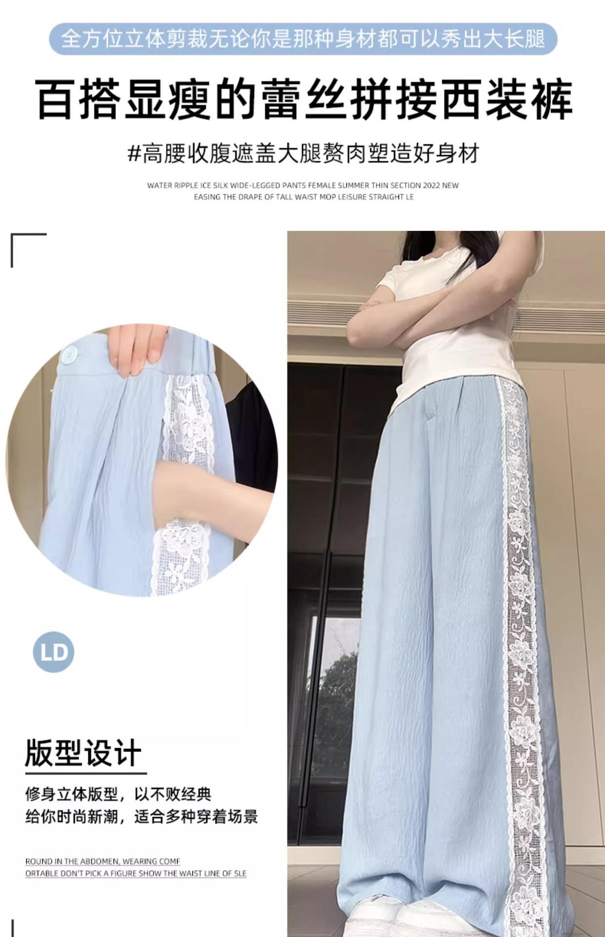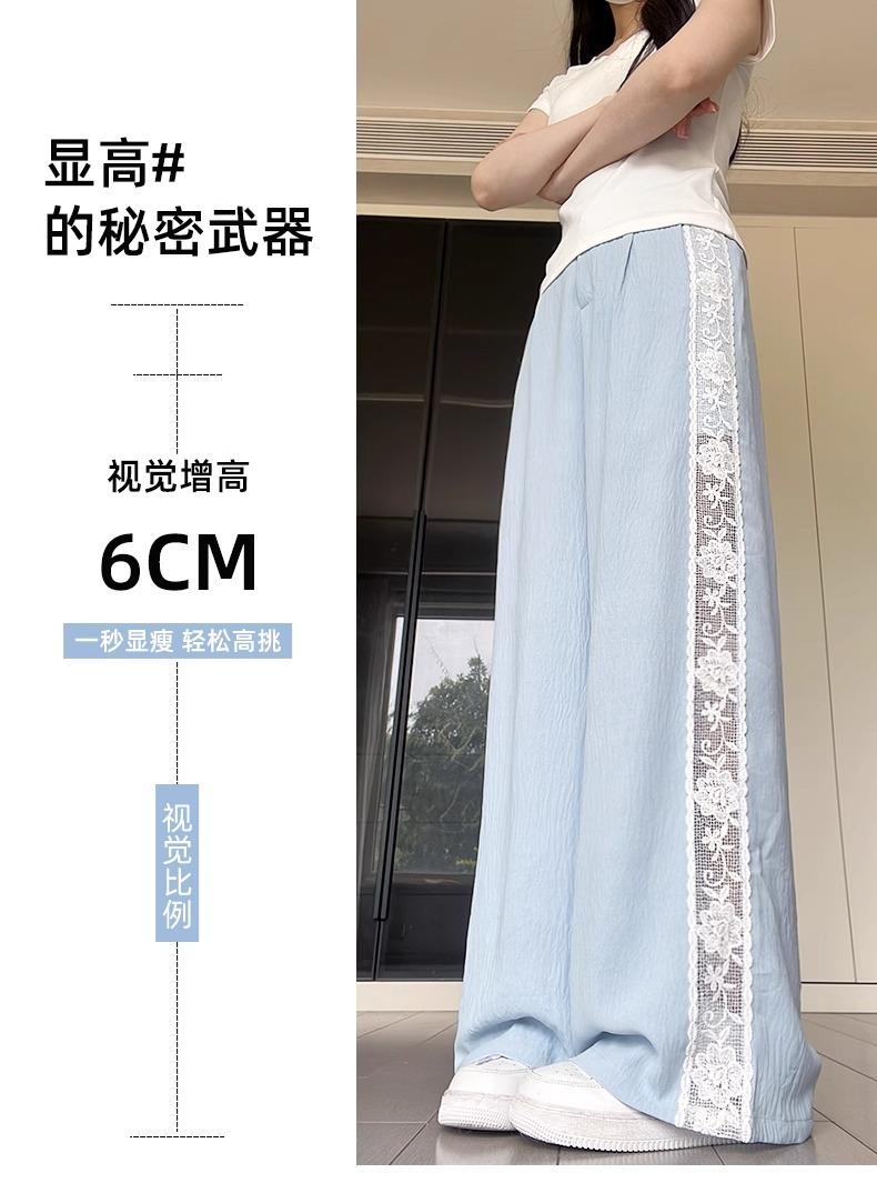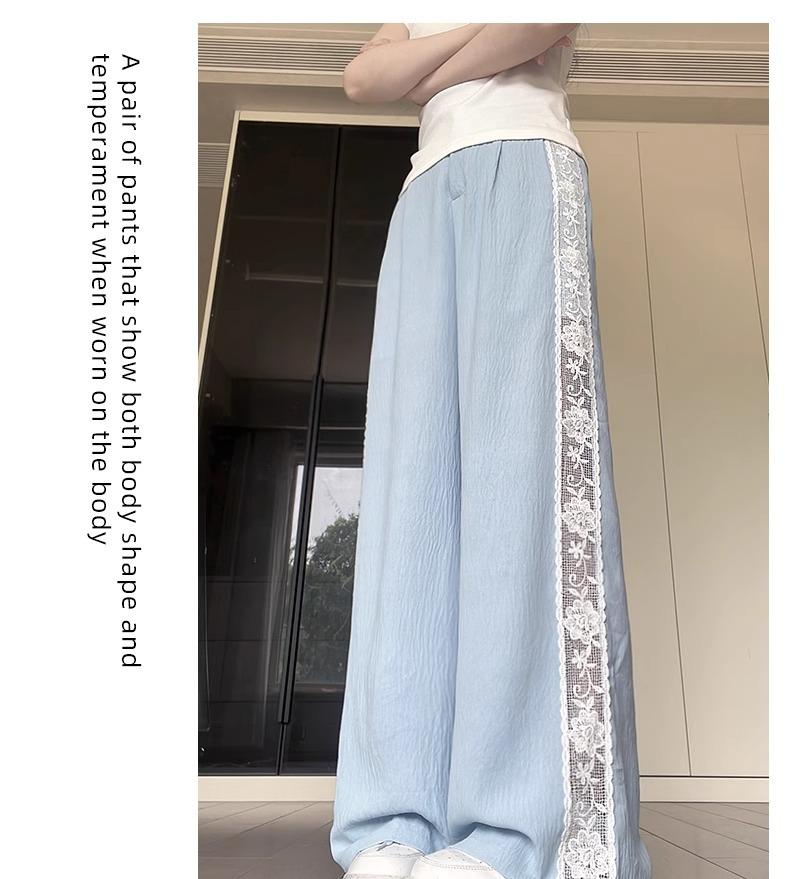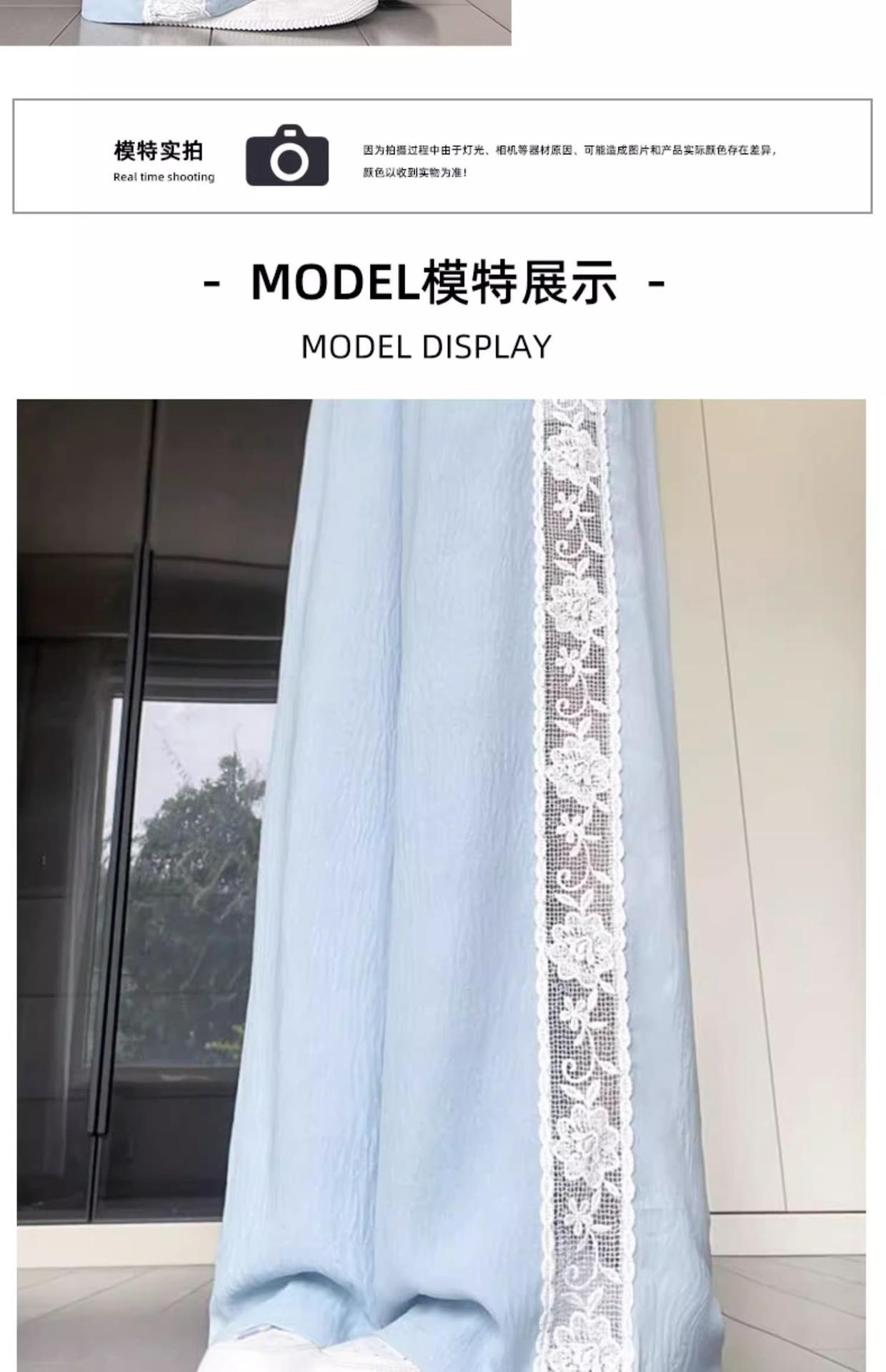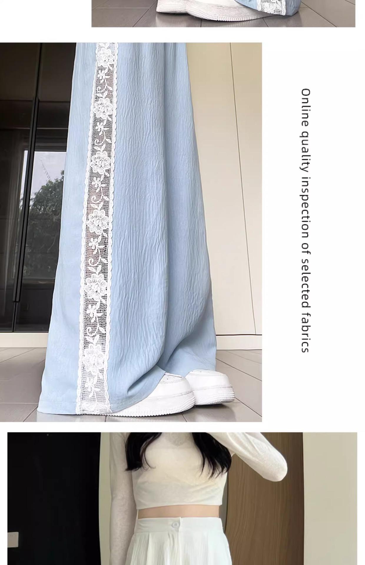 Pantalones Azules de Encaje con Aberturas para Mujer Verano 2025 Nuevo Diseño Cintura Alta Sueltos Pierna Ancha Seda de Hielo Ligera