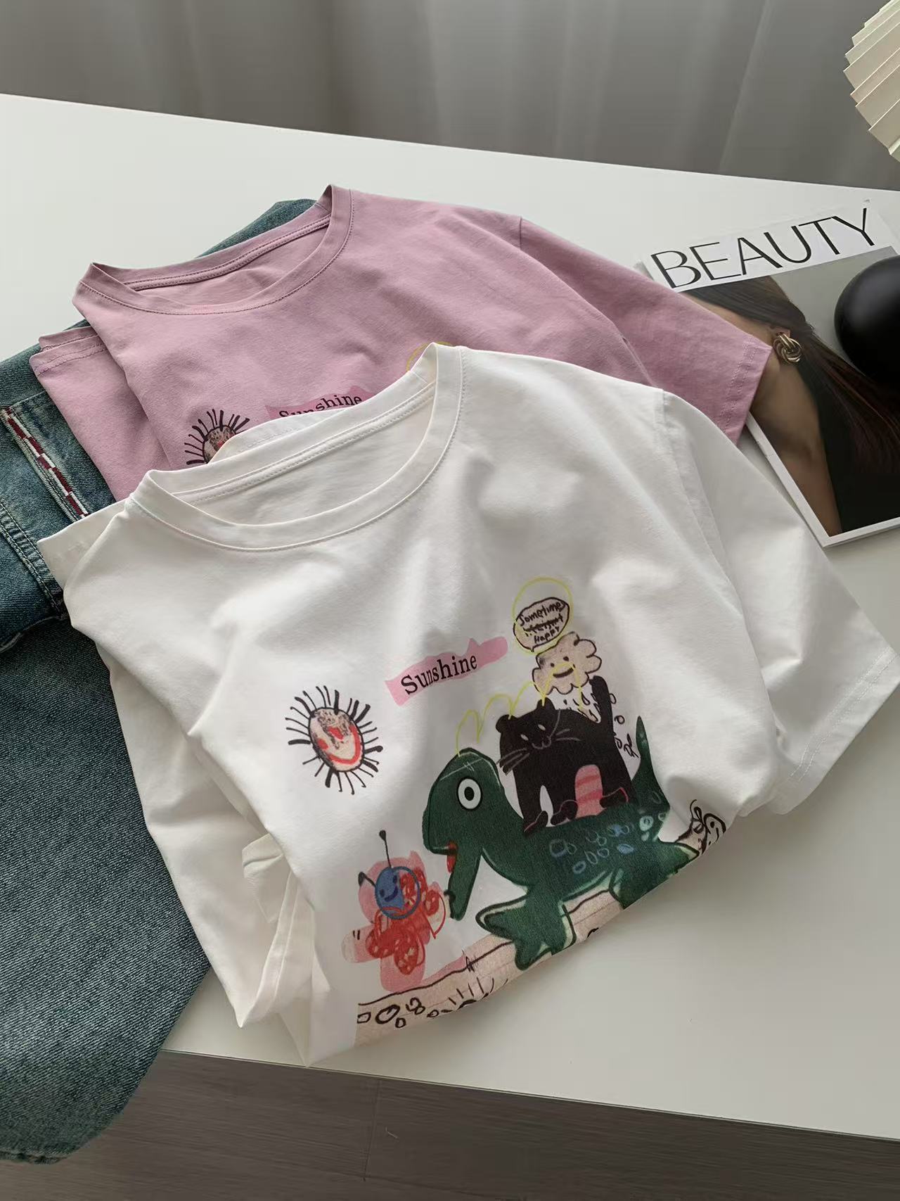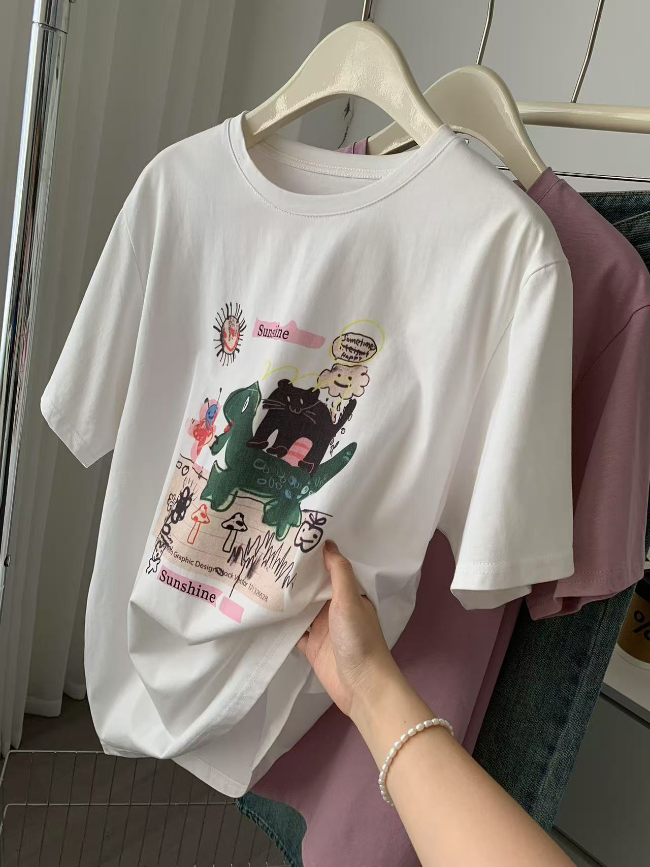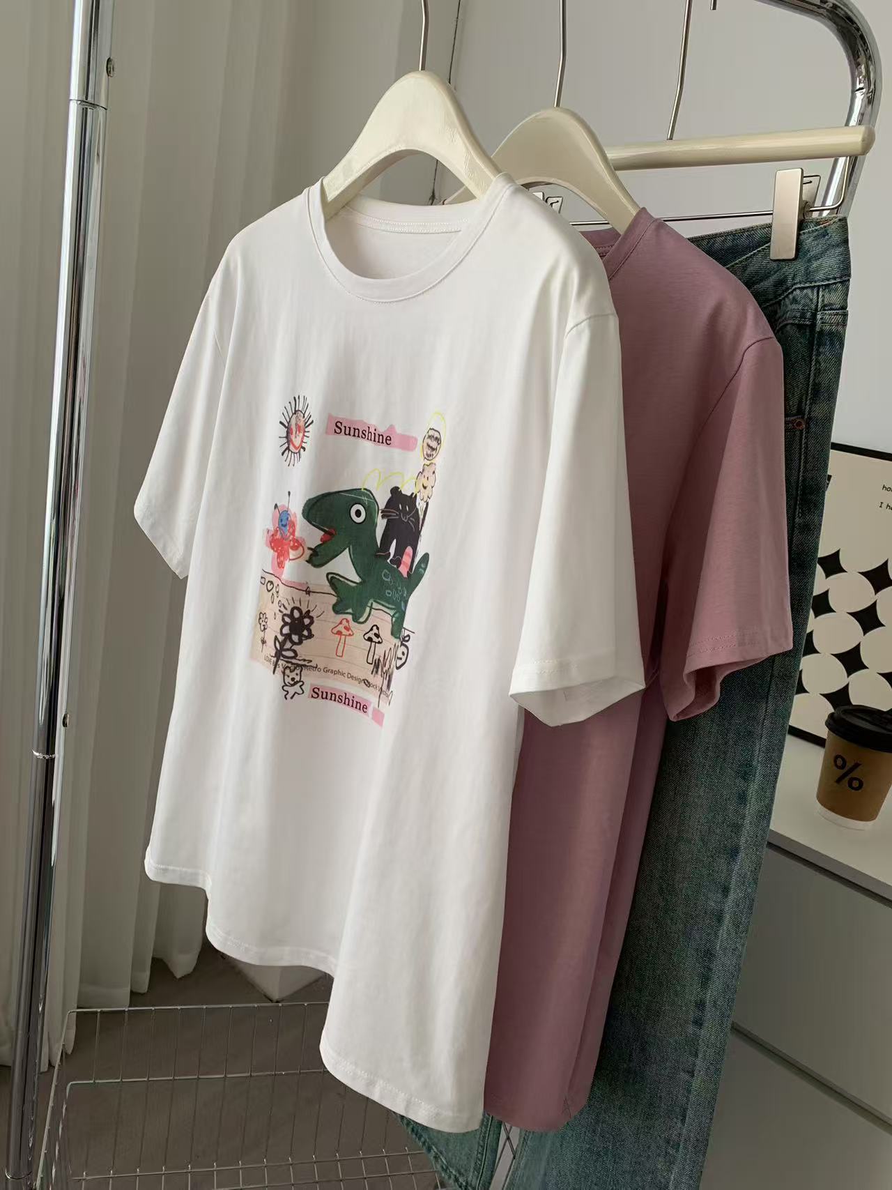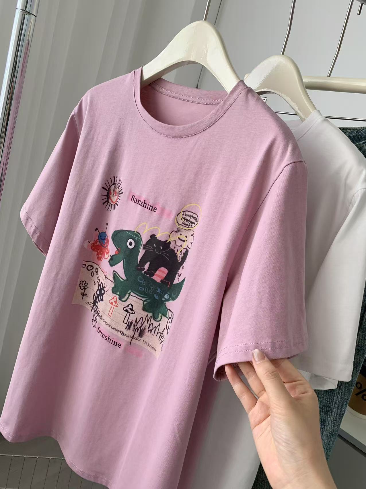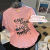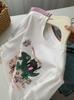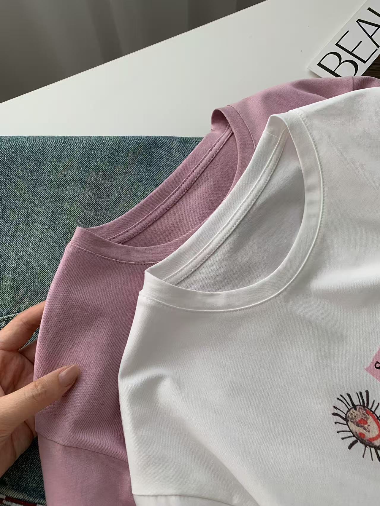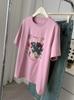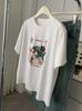 Camiseta de Algodón con Estampado de Dibujos Animados de Largo Medio y Manga Corta para Mujer Verano Nuevo Perezosa Casual Combinable Holgada Estudiantil Camiseta Básica