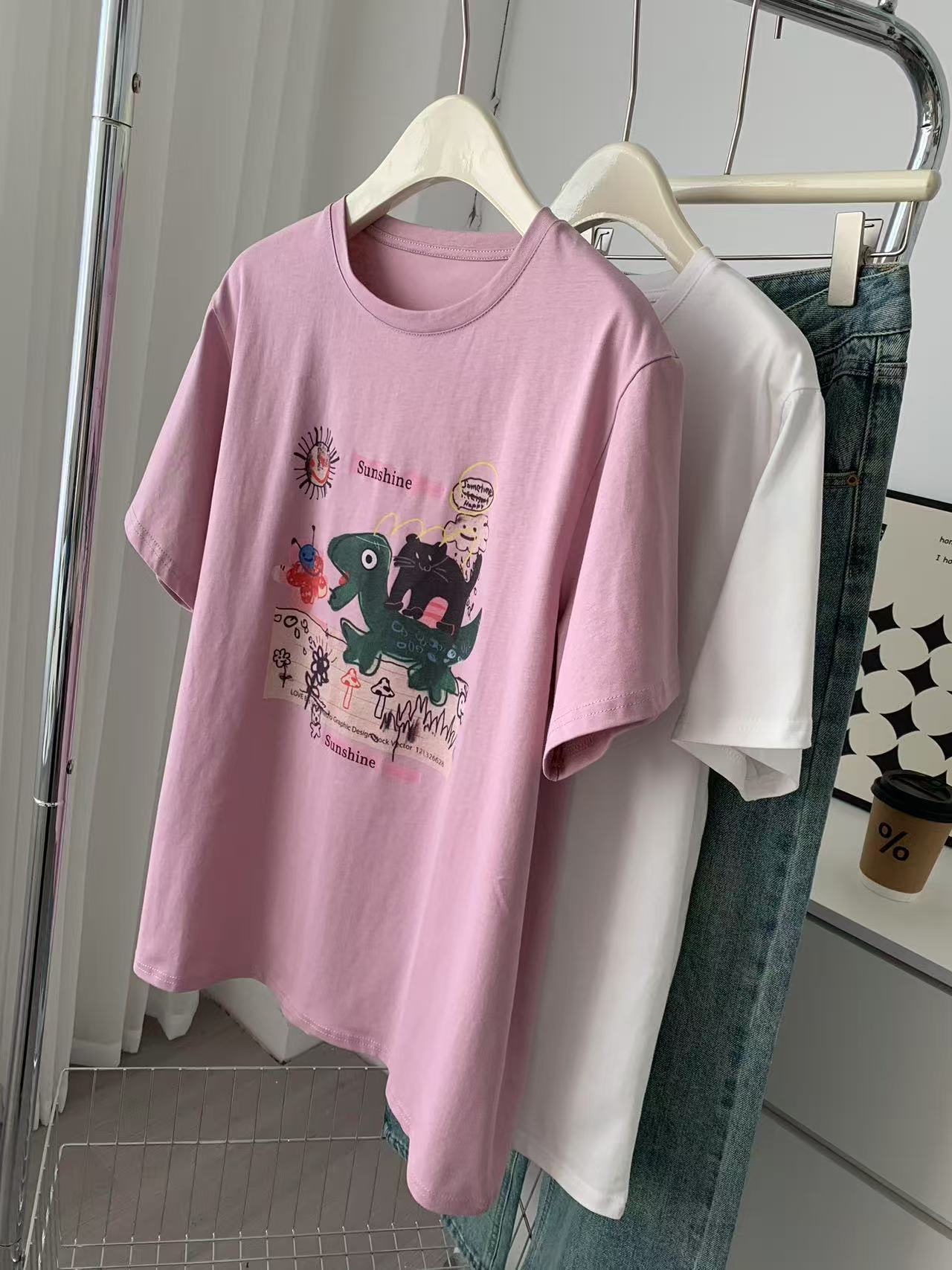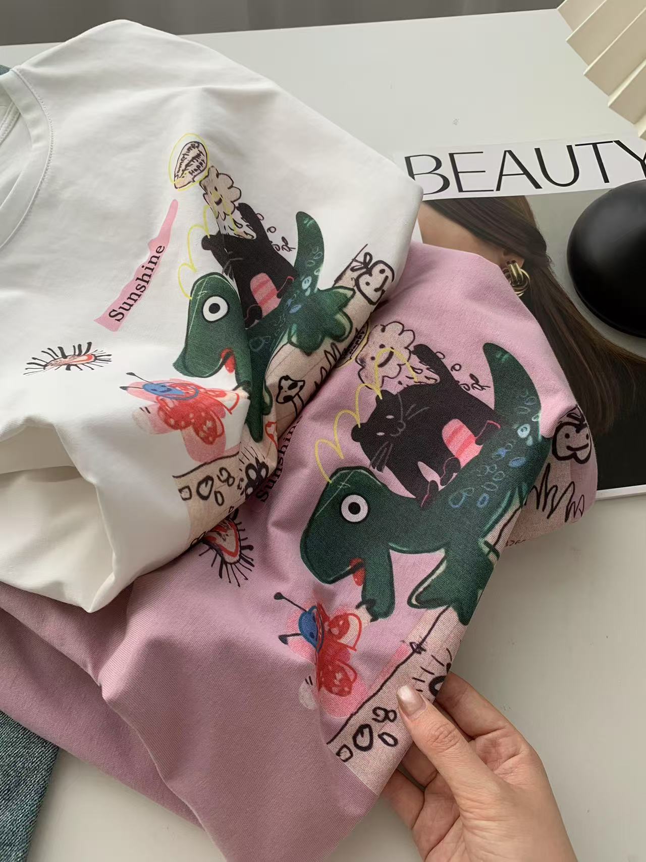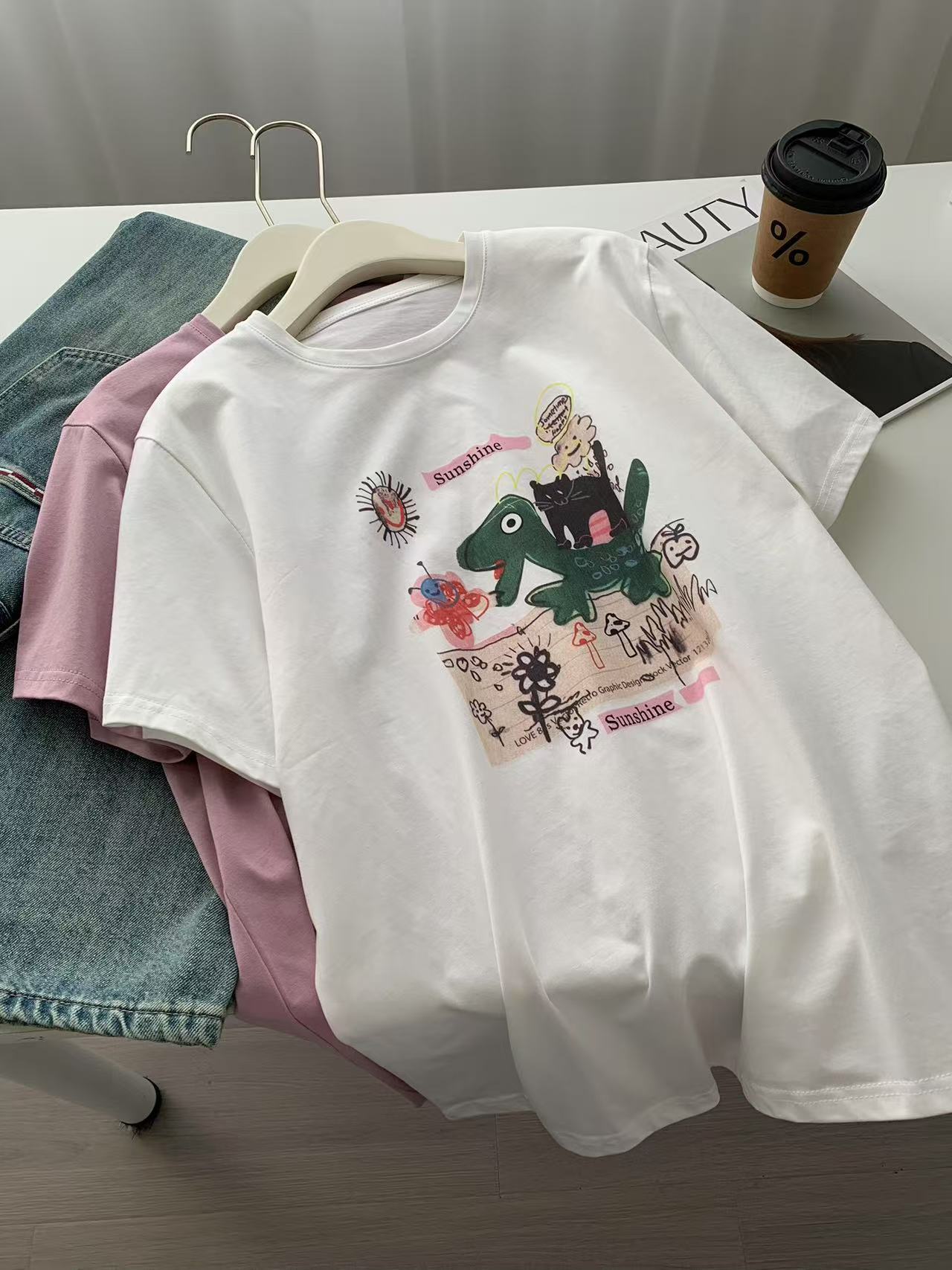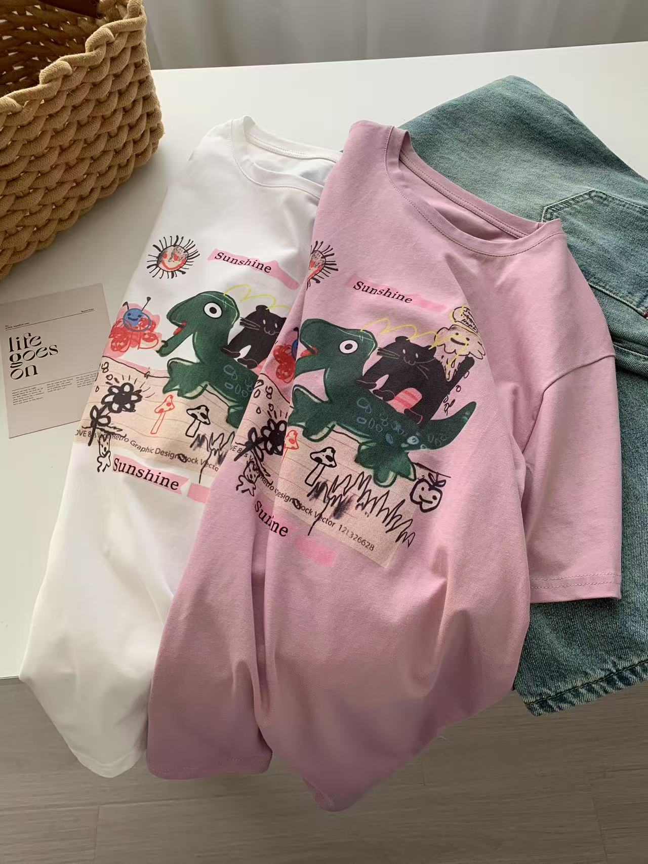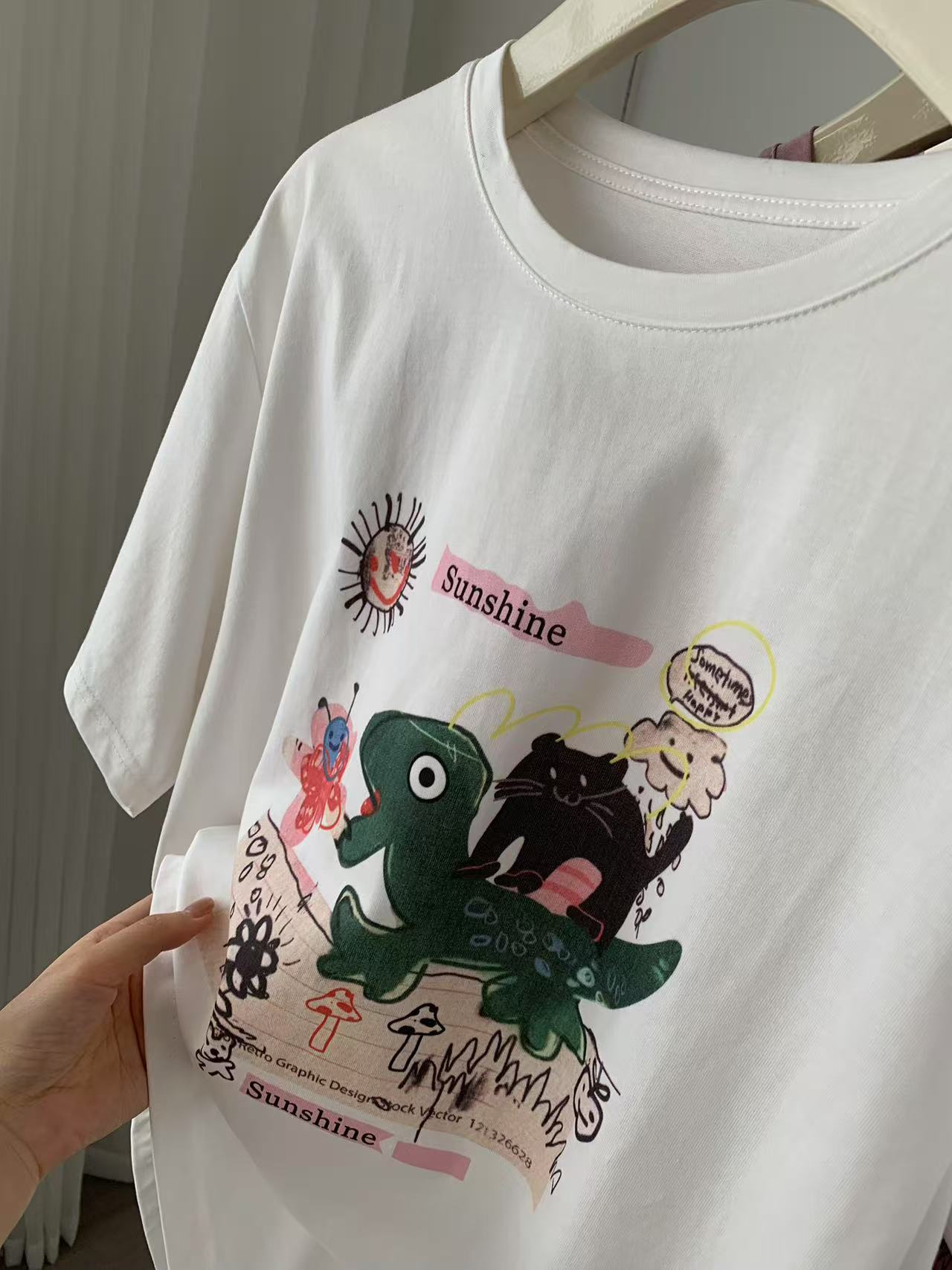 Camiseta de Algodón con Estampado de Dibujos Animados de Largo Medio y Manga Corta para Mujer Verano Nuevo Perezosa Casual Combinable Holgada Estudiantil Camiseta Básica