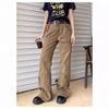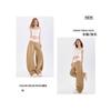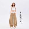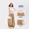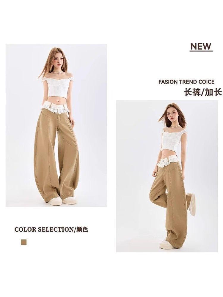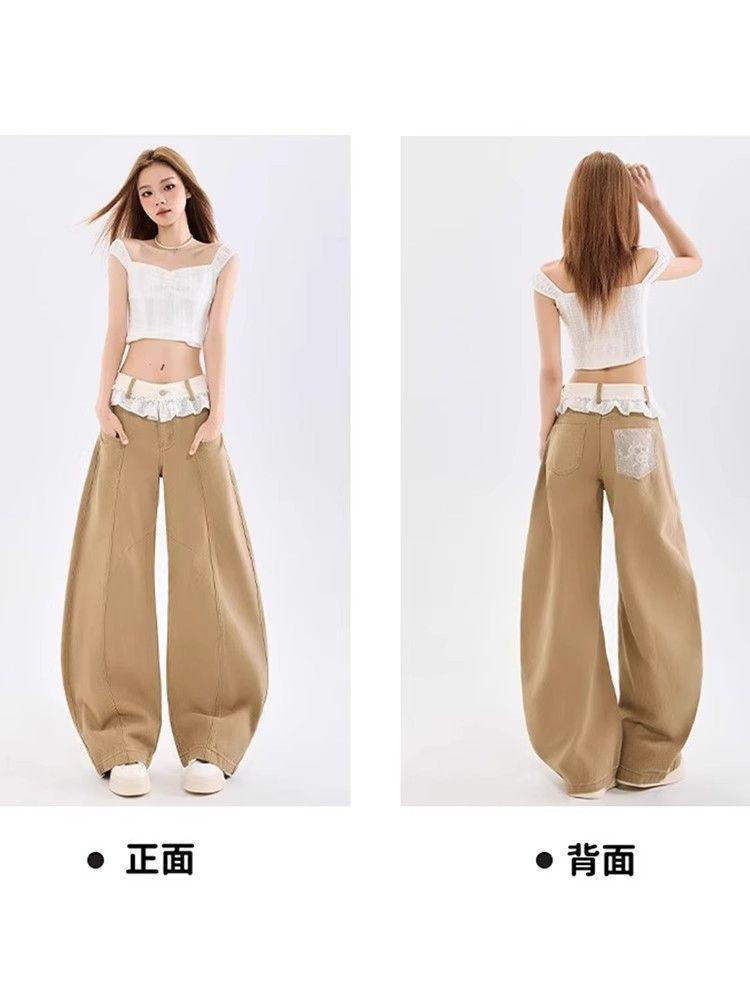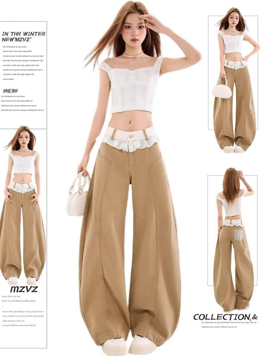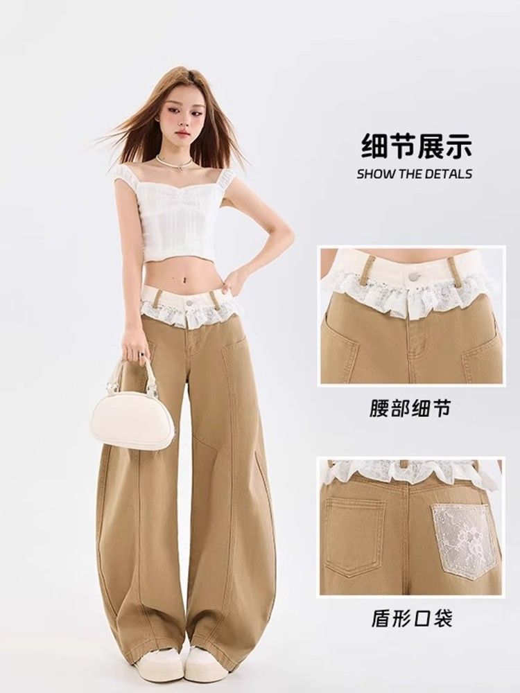Jeans Cimitarra con Encaje Caqui para Mujer Verano Nuevo Diseño Cintura Alta Sueltos Pierna Ancha Pantalones Hoz