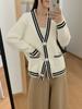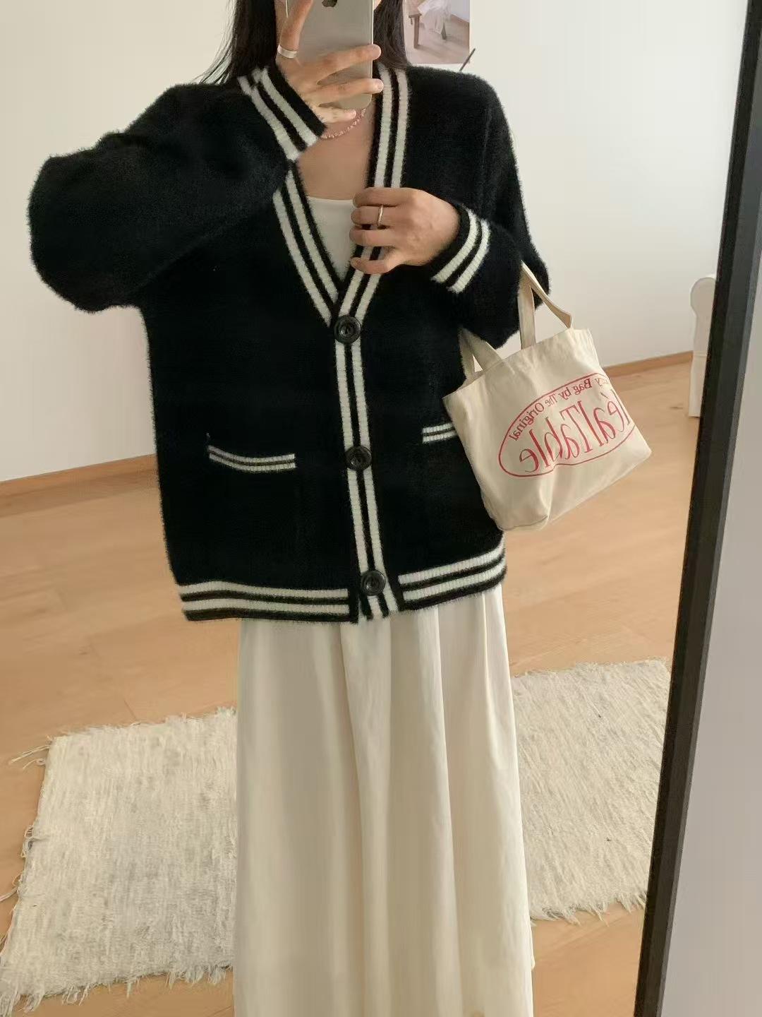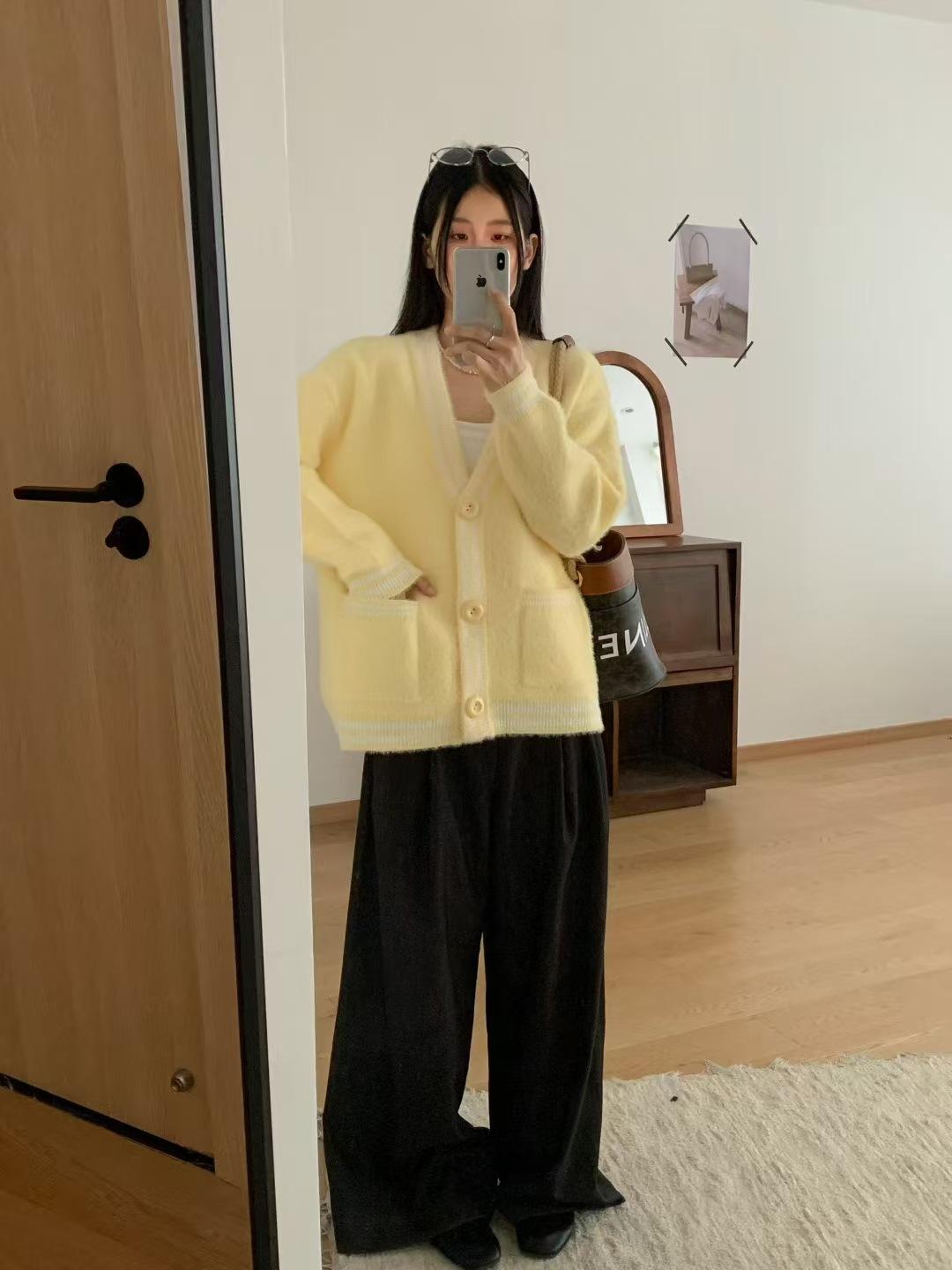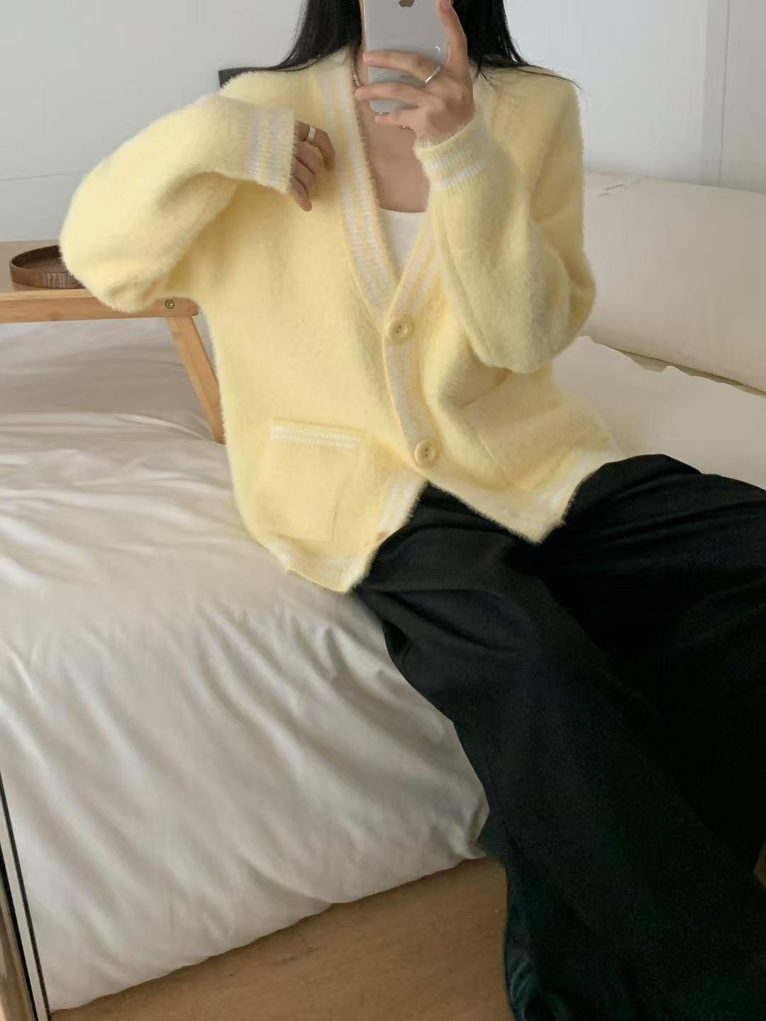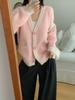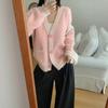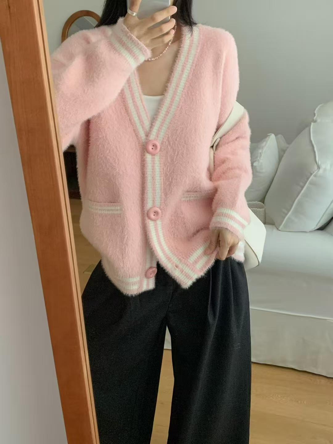 Elegante Chaqueta de Bolsillo de Terciopelo Visón Sintético 2025 Otoño e Invierno Nuevo Cárdigan de Punto Bloque de Color Comercio Exterior Suéter Rosa para Mujer