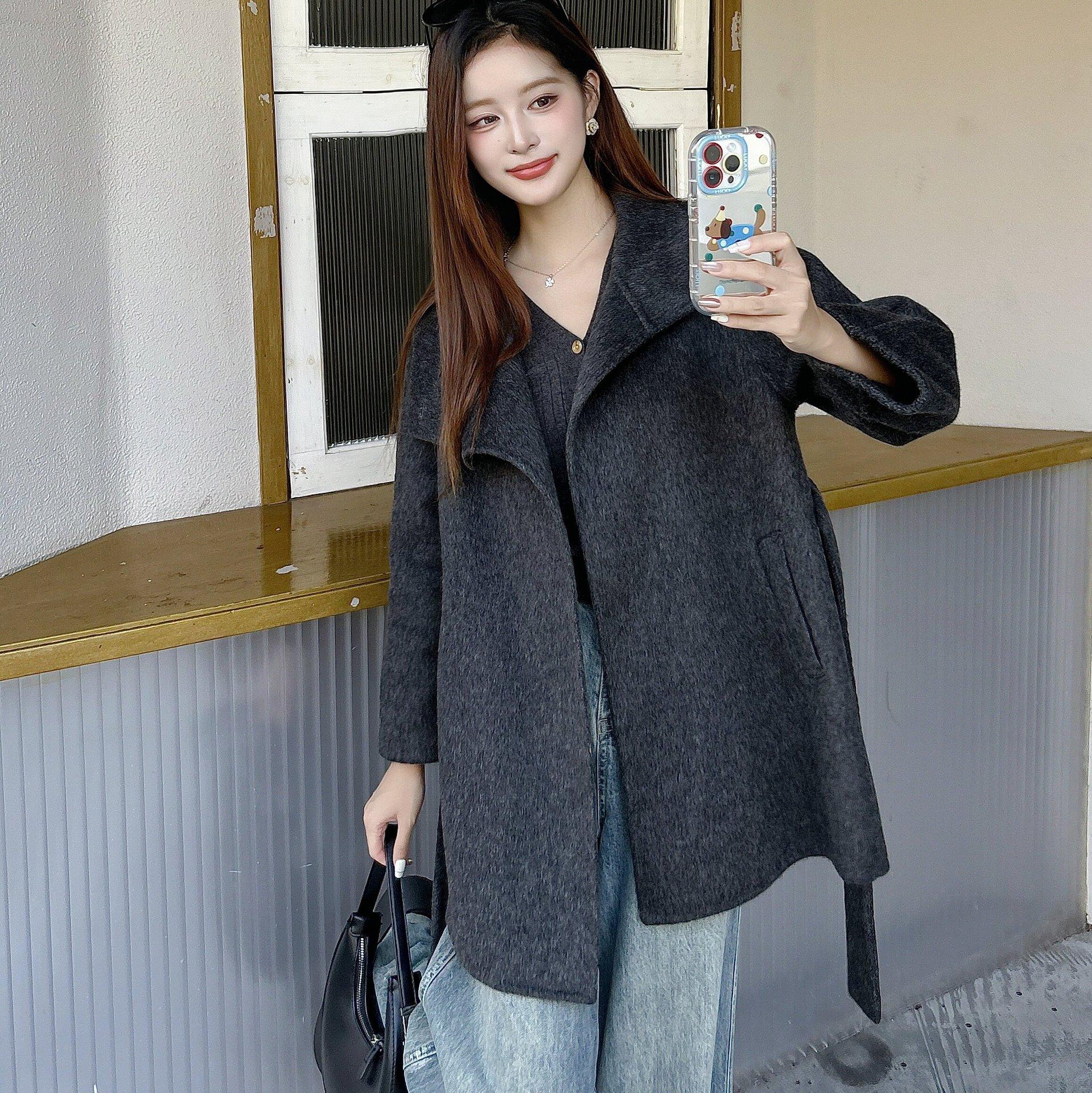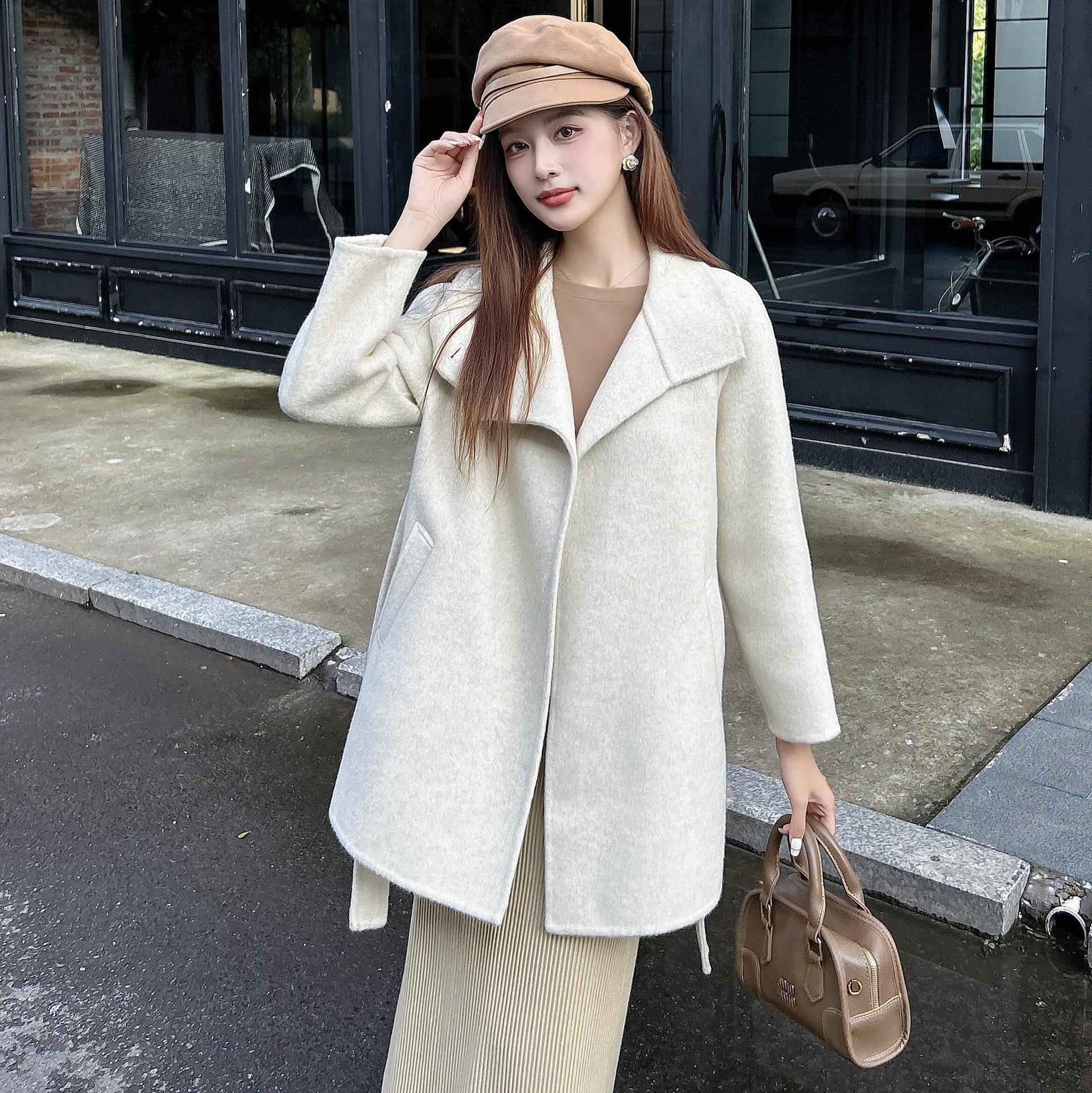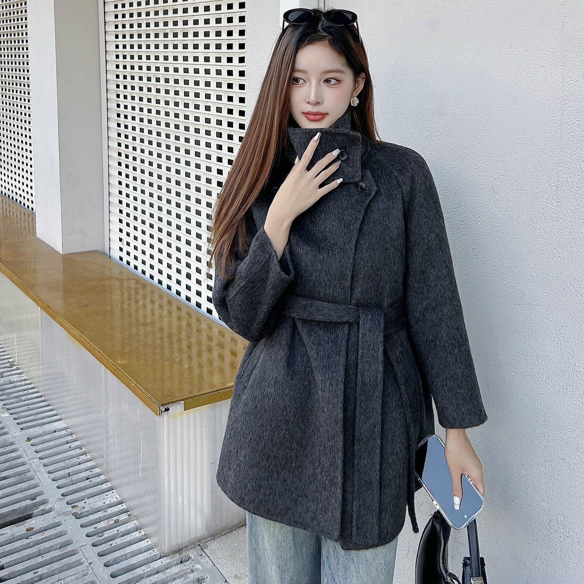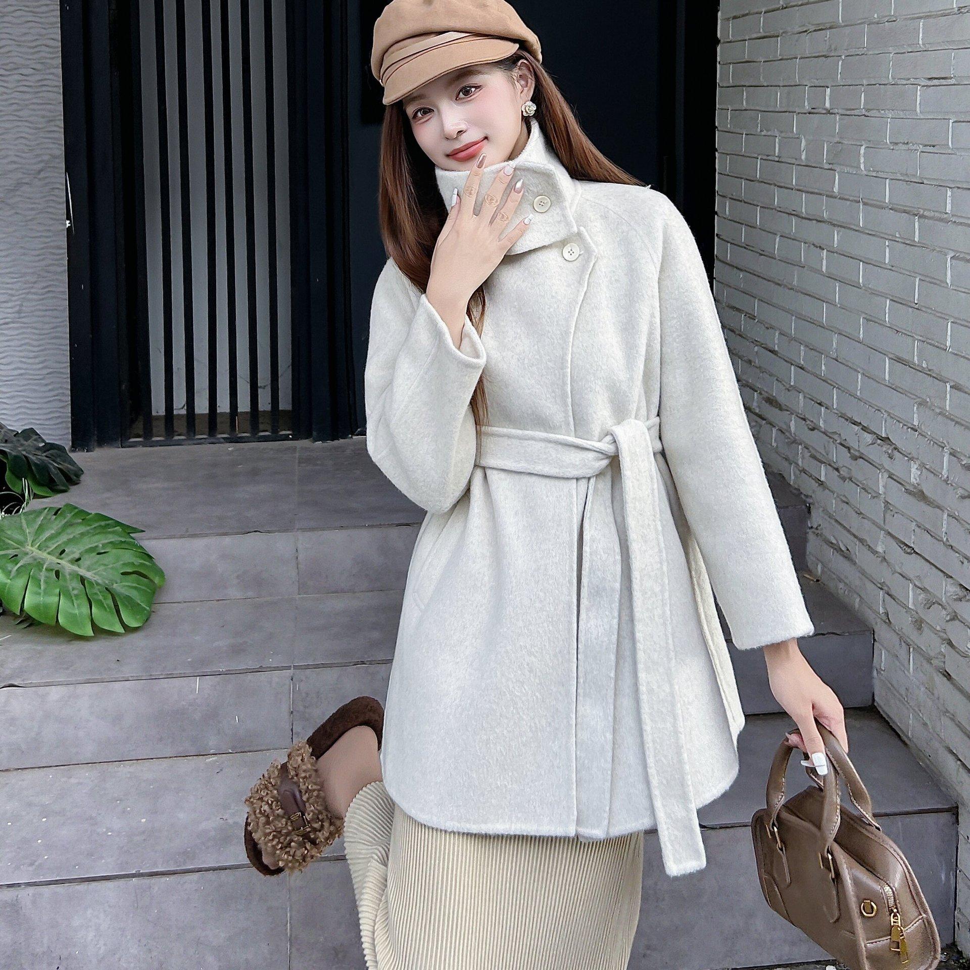 Abrigo de Otoño con Cuello Alto de Lana de Doble Vista de Largo Medio con Cinturón de Encaje, Abrigo de Lana Suelto de Moda Pequeña