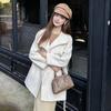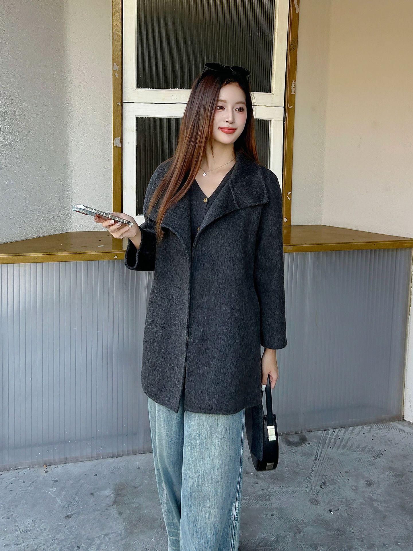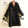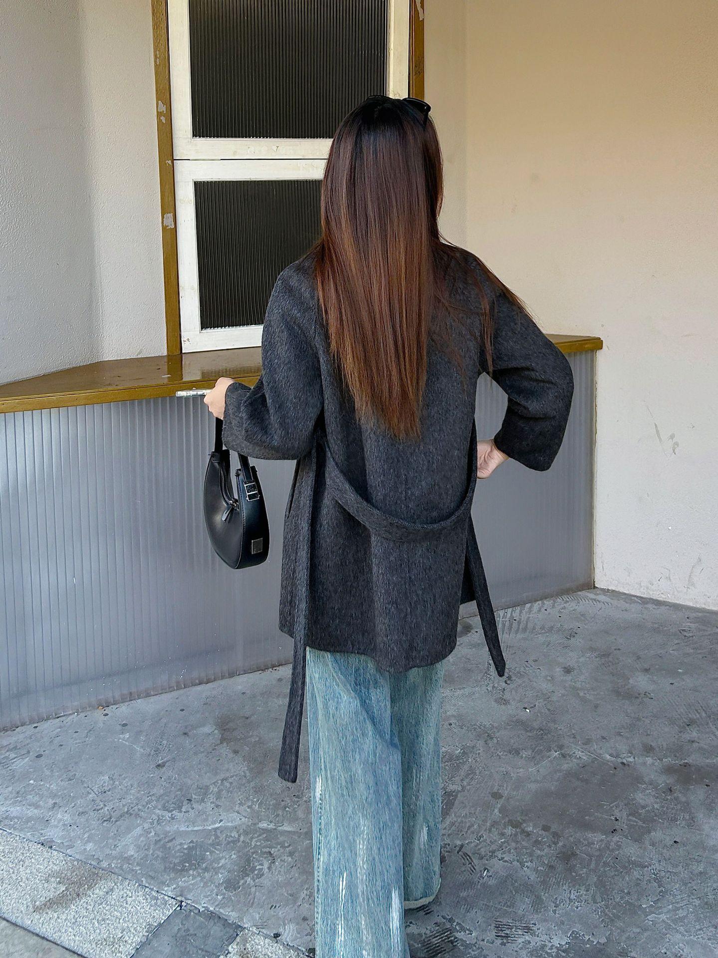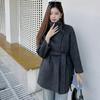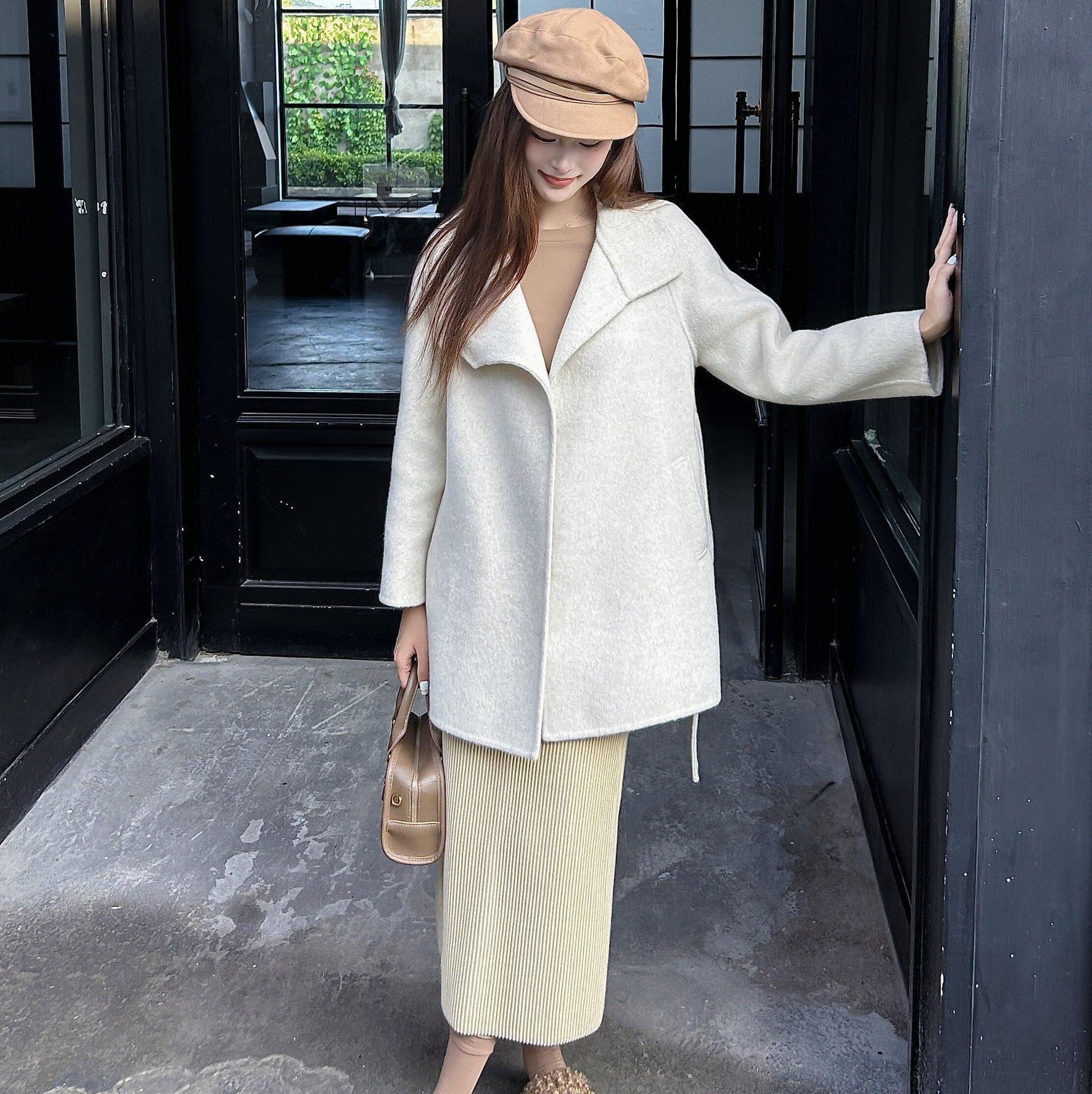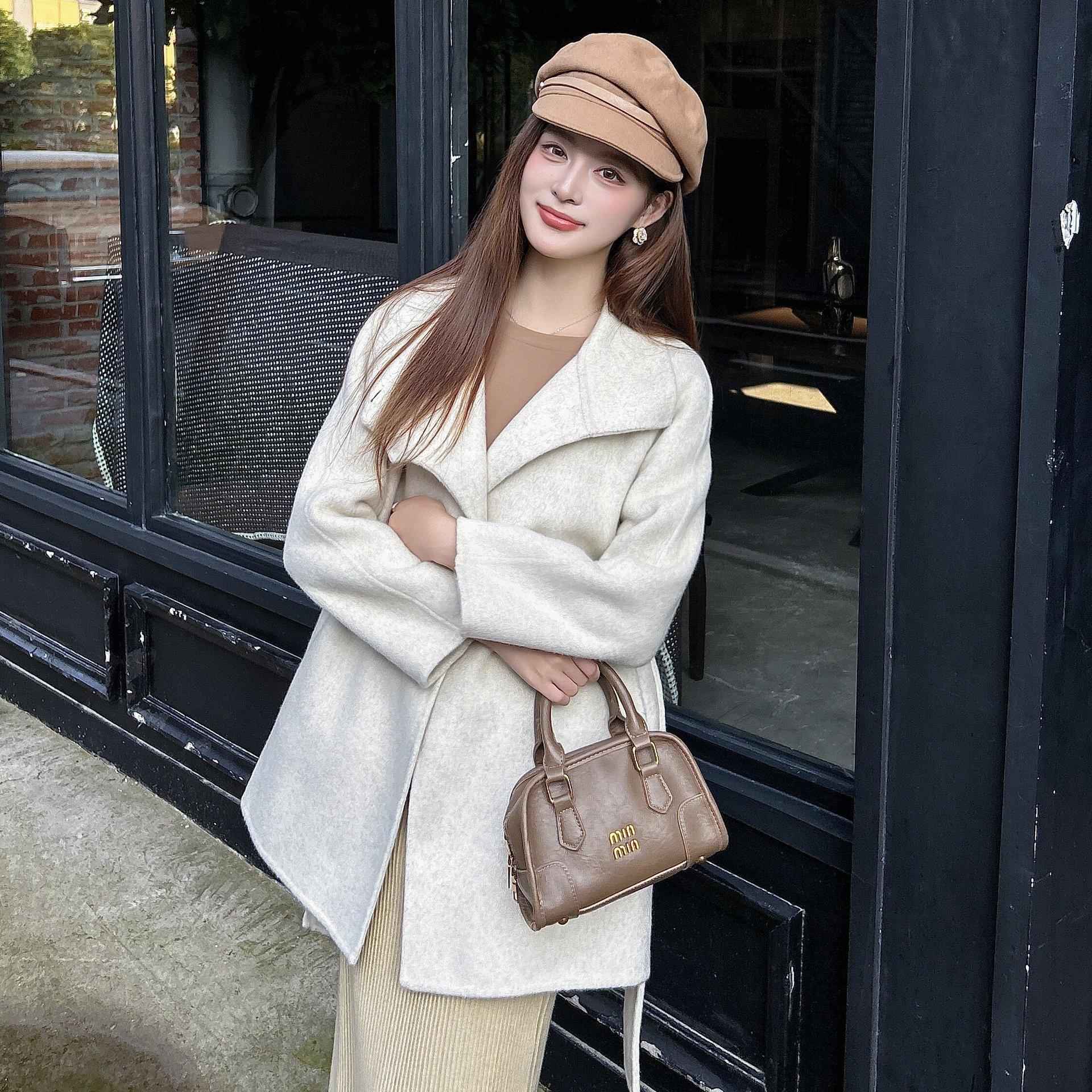 Abrigo de Otoño con Cuello Alto de Lana de Doble Vista de Largo Medio con Cinturón de Encaje, Abrigo de Lana Suelto de Moda Pequeña
