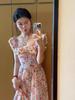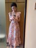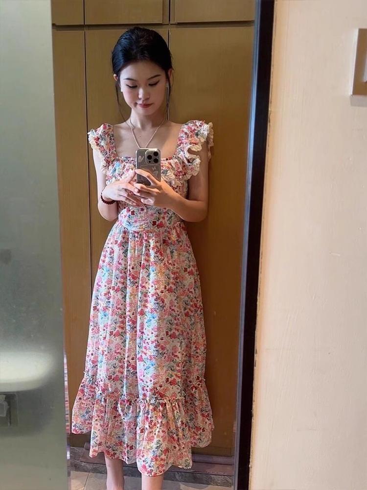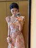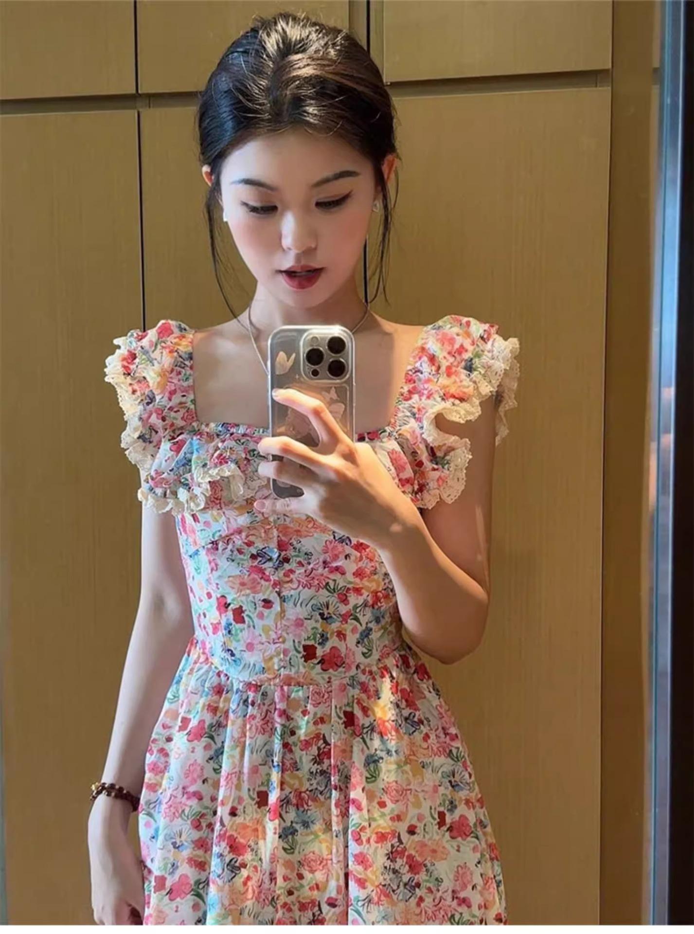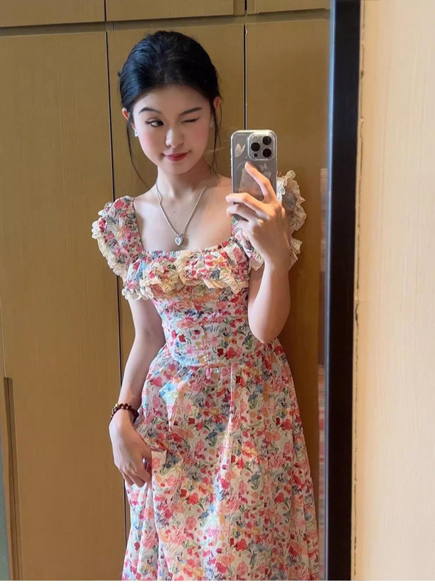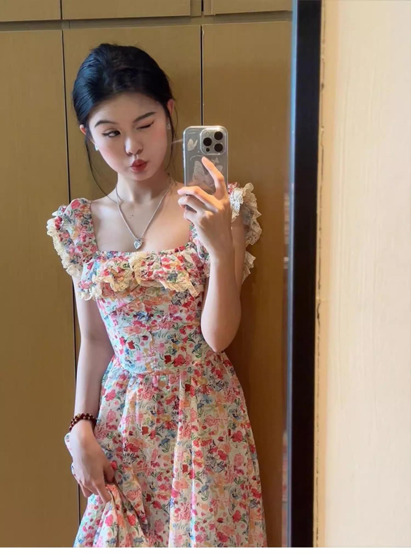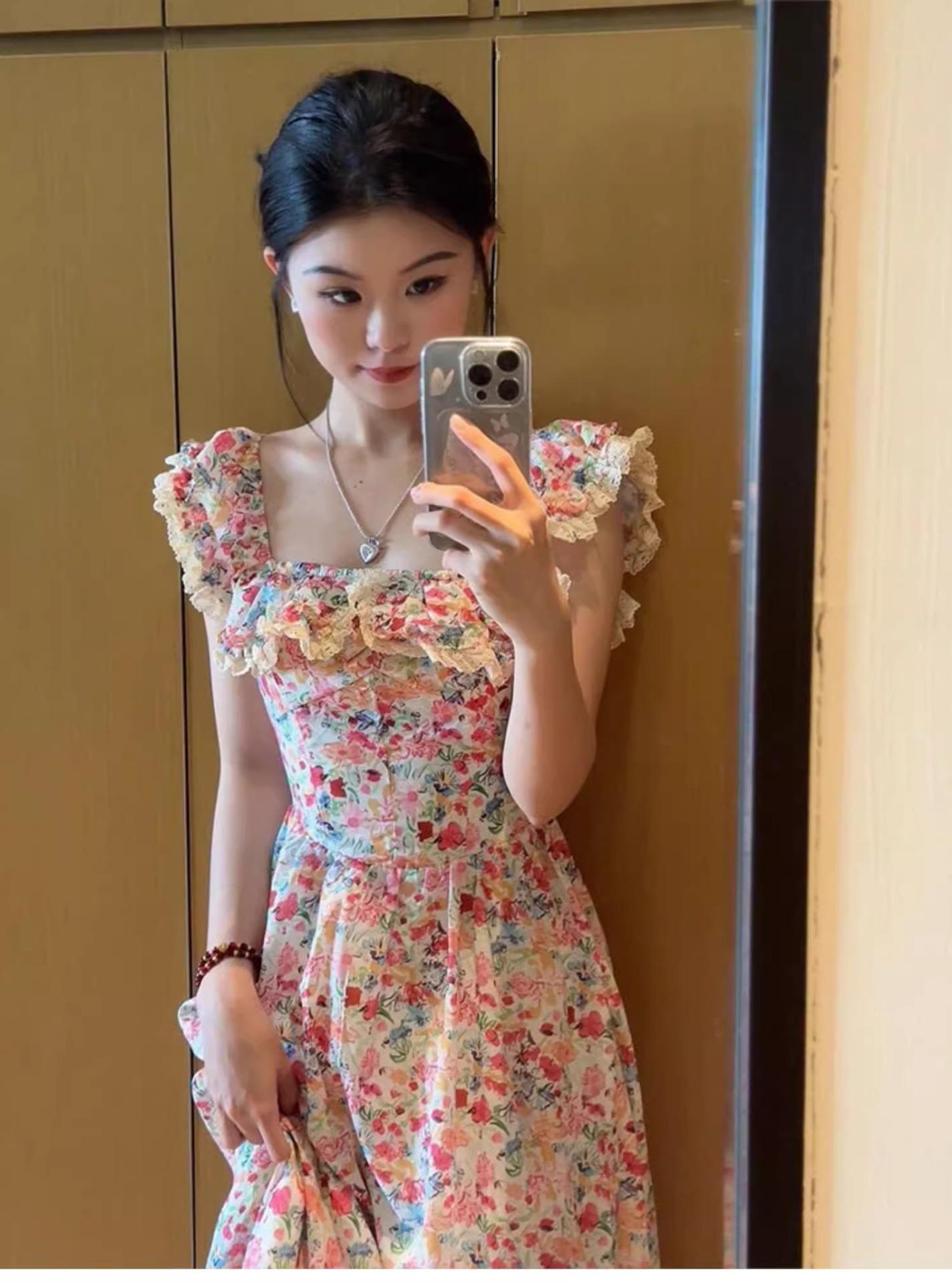Vestido Estilo Vacaciones en la Playa, Estilo Francés de Verano, Suave y Chic, Mangas Cortas Volantes, Vestido de Hada Floral, Adelgazante de Cintura