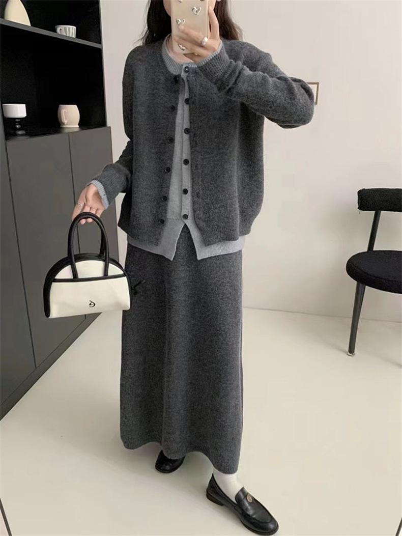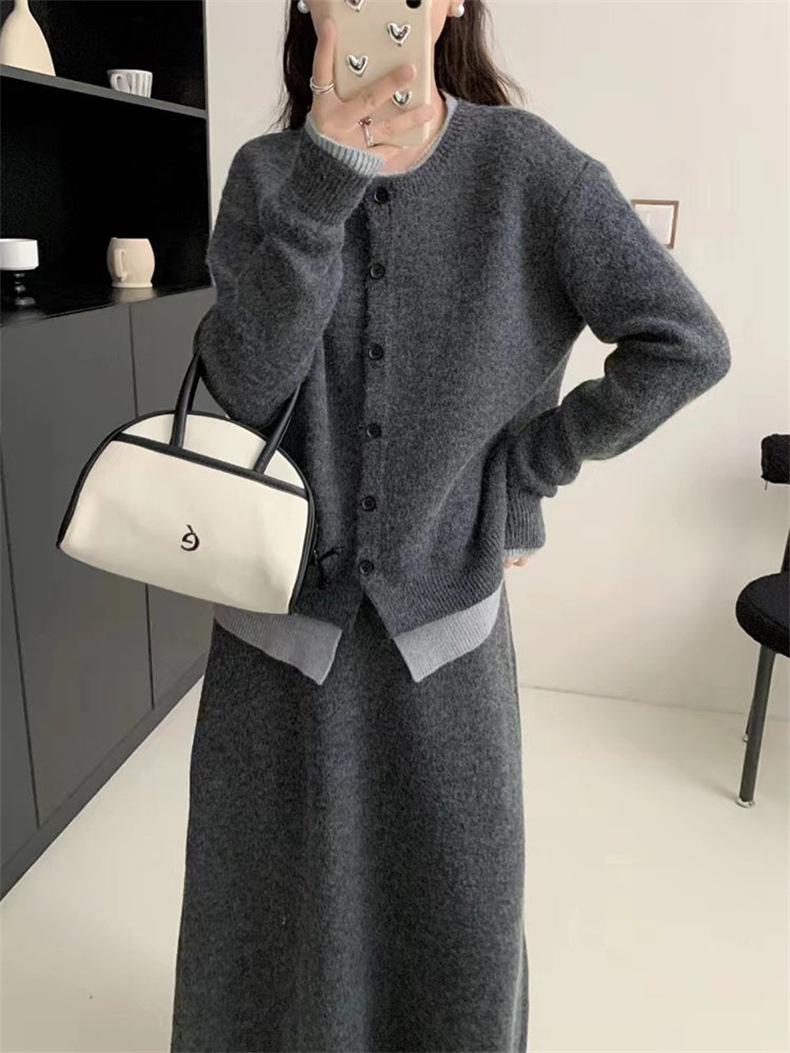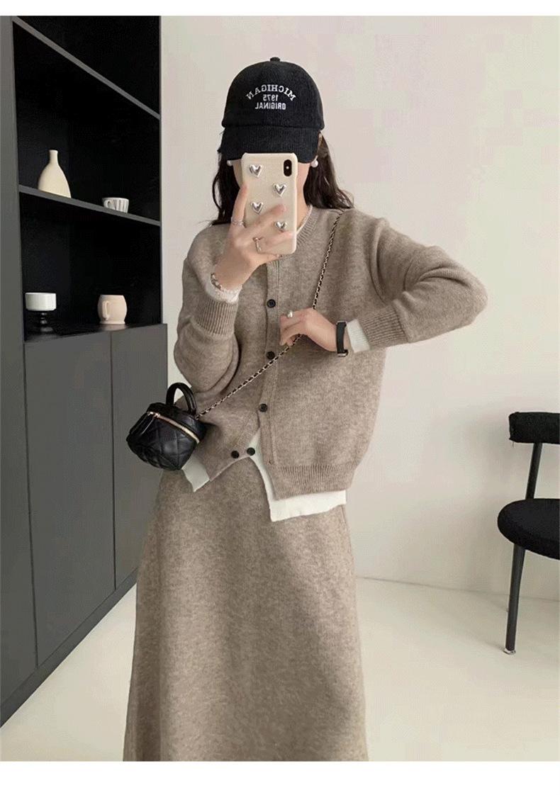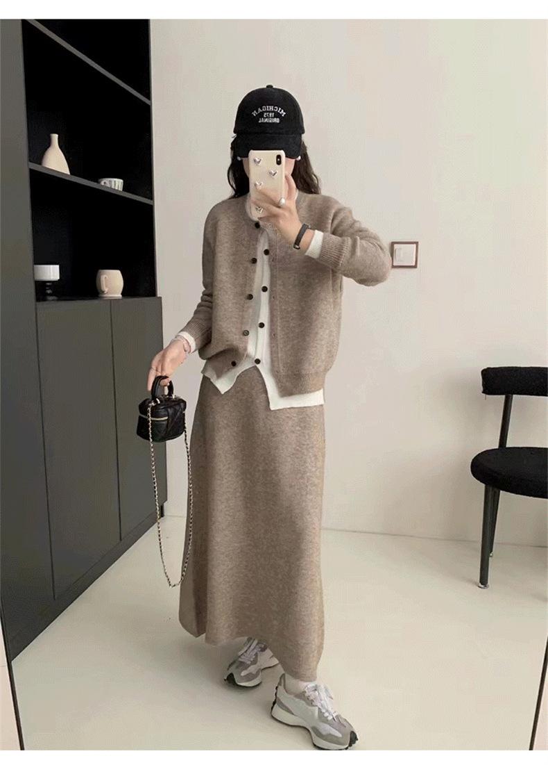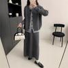 Nuevo Traje de Falda Cárdigan Falso de Dos Piezas 2025 para Mujer Otoño Estilo Casual Holgado Look Adelgazante Traje de Dos Piezas para Mujer