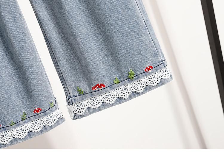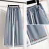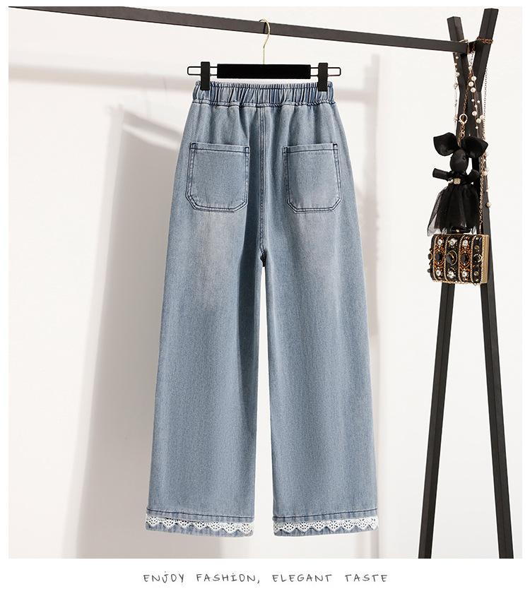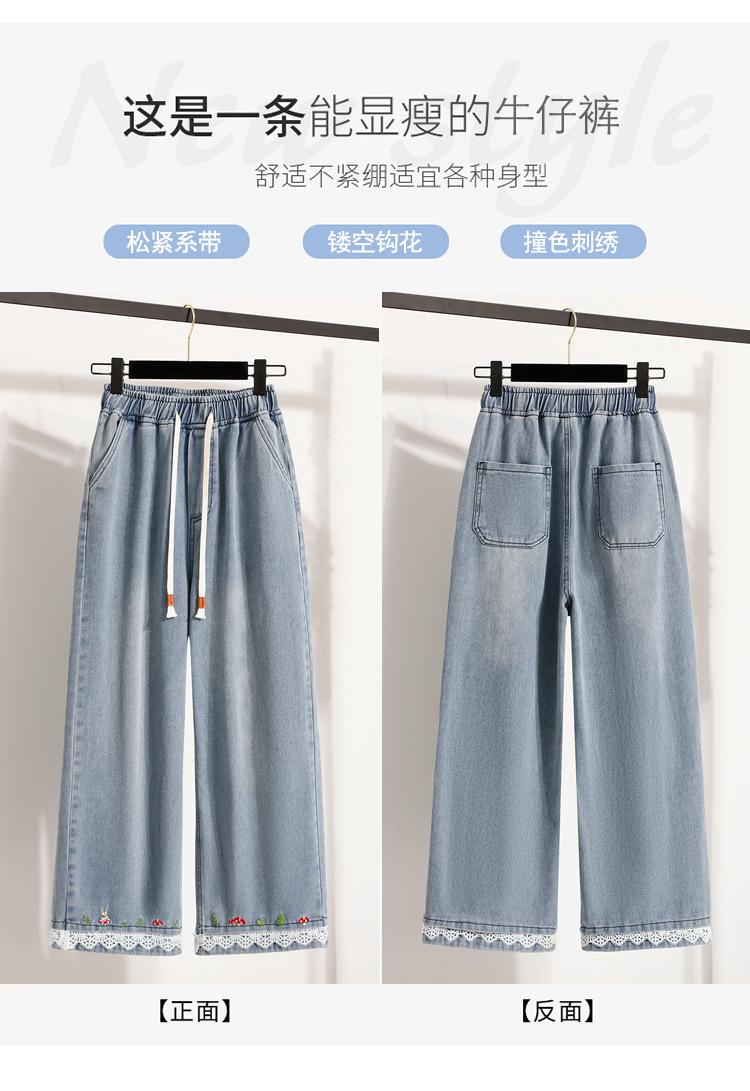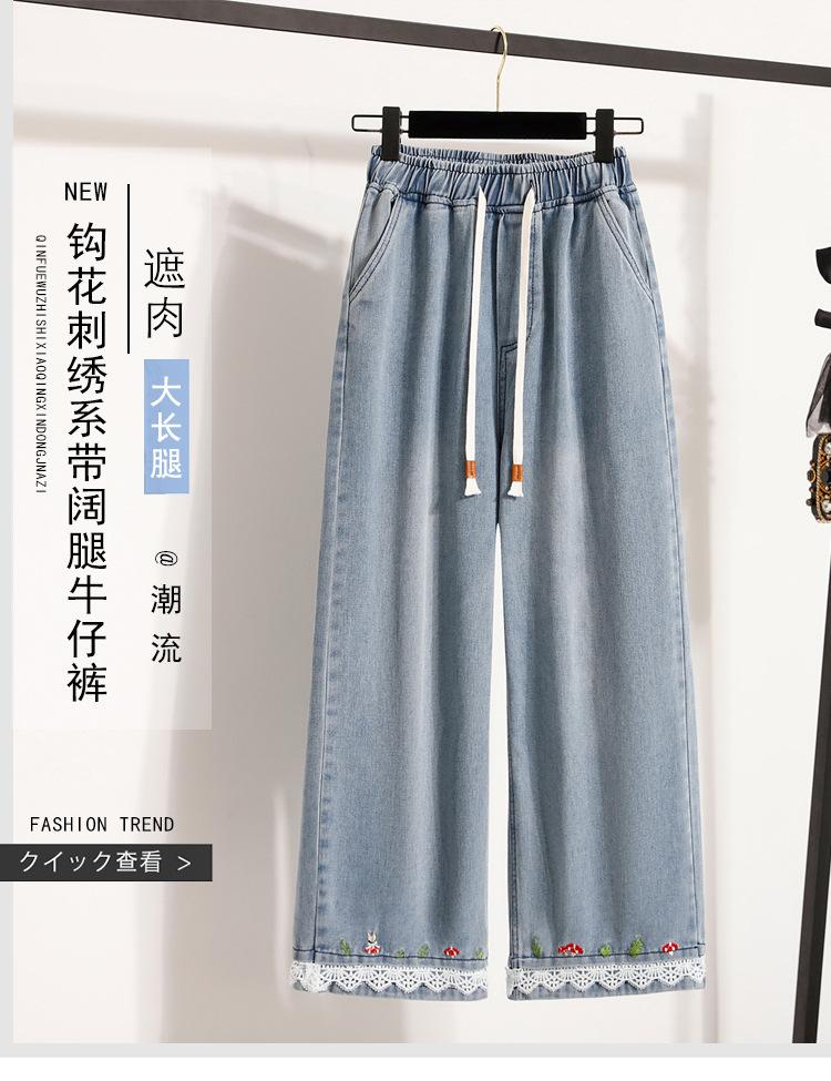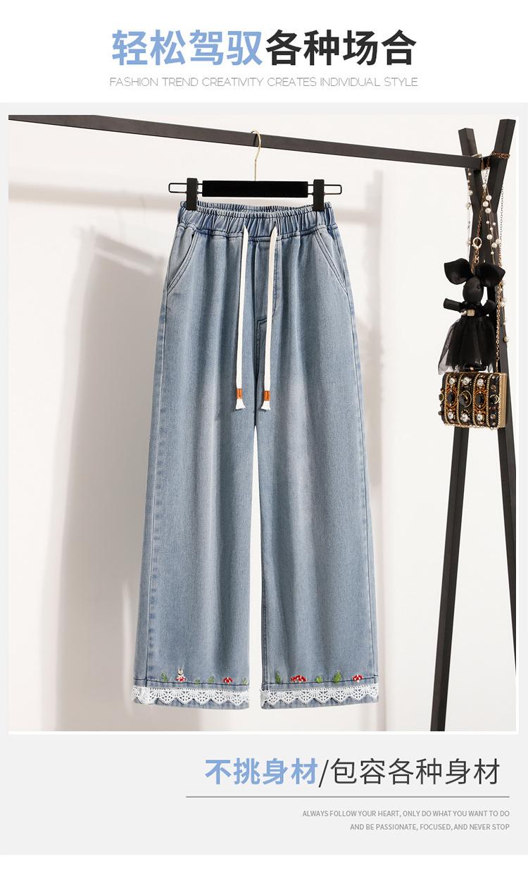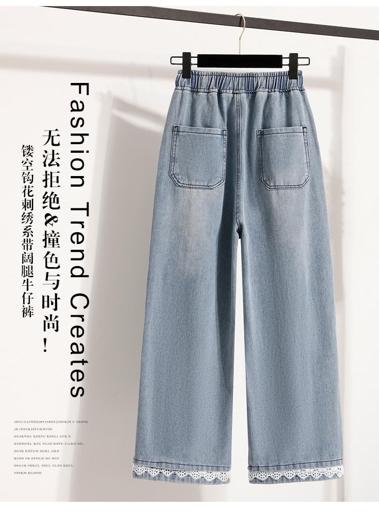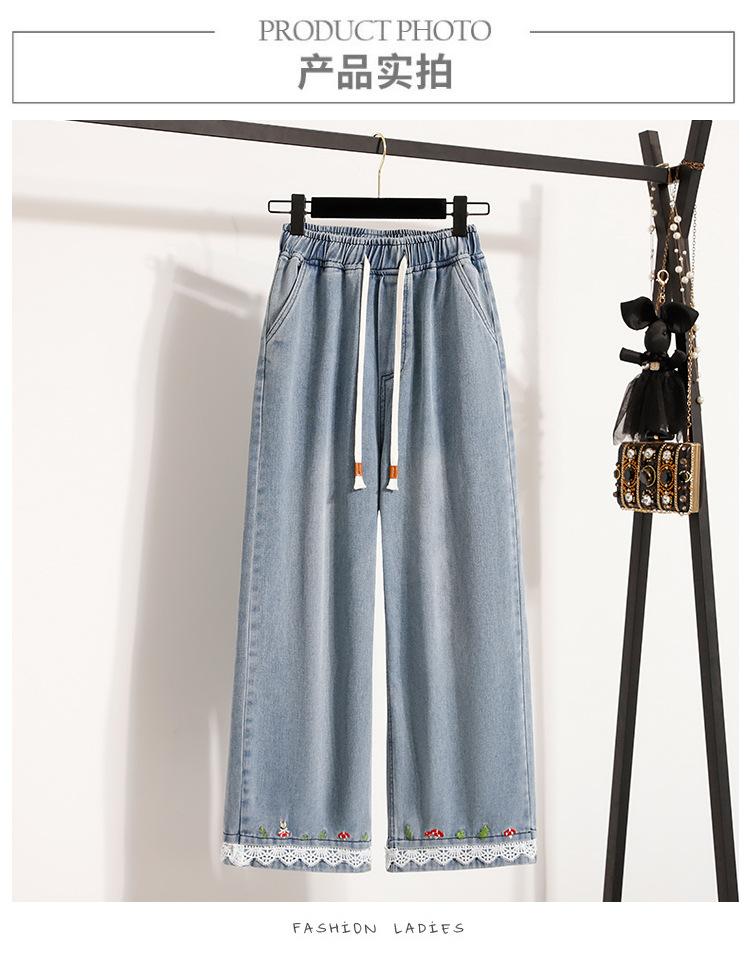 Jeans de Encaje Bordado Talla Grande para Mujer Verano Pantalones con Cordón Cintura Elástica Slim Versátil Pantalones de Pierna Ancha