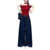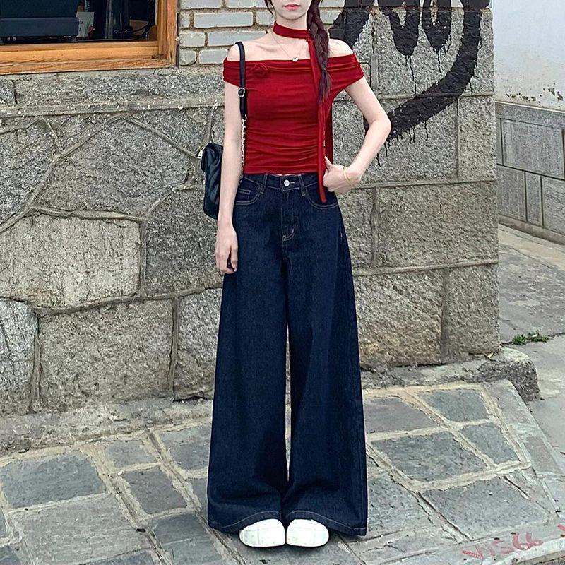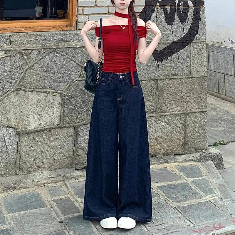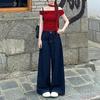 Jeans de Pierna Ancha Azul Oscuro Pequeños para Mujer Verano Retro Sueltos Adelgazantes Rectos