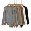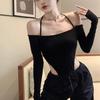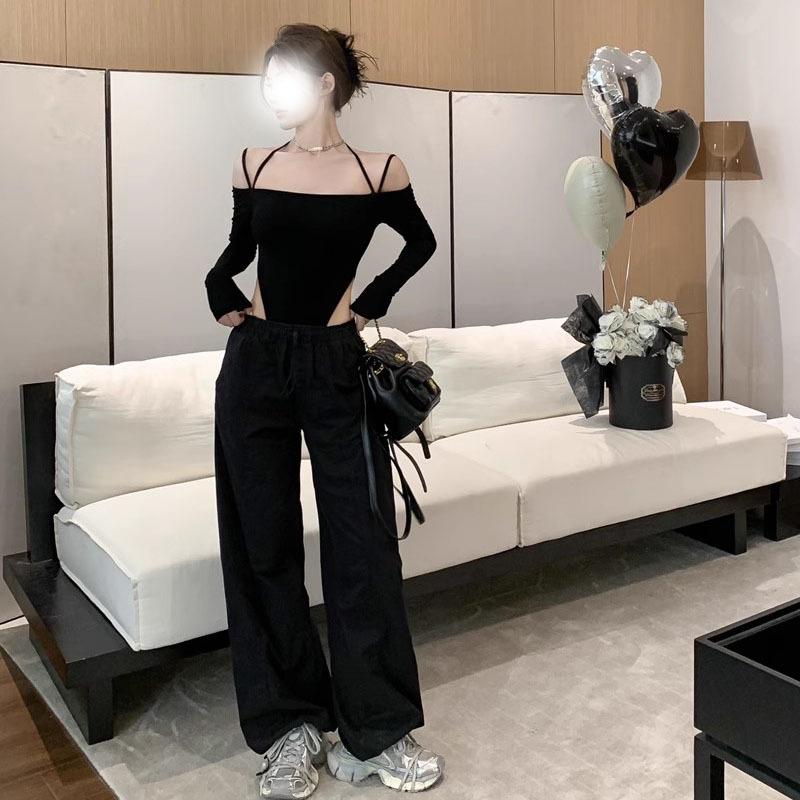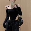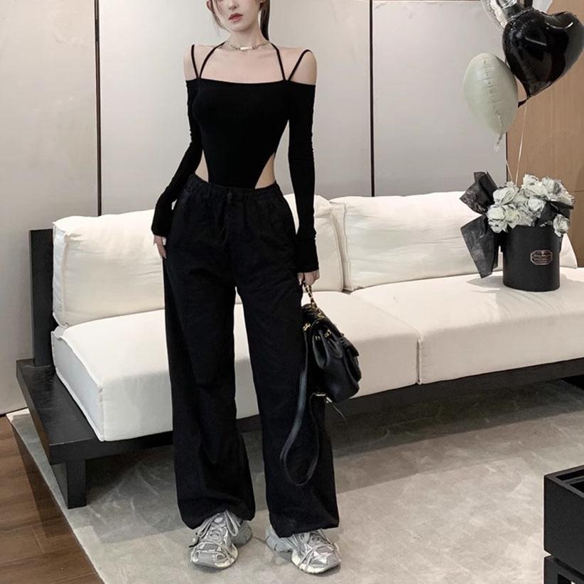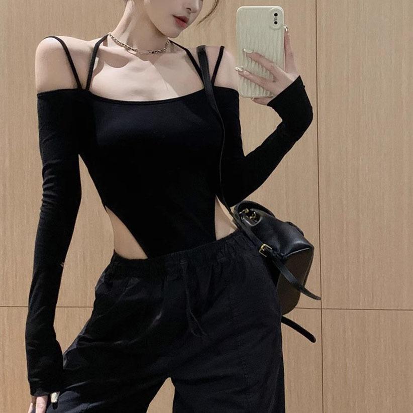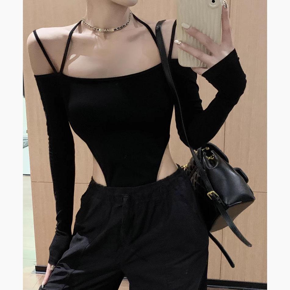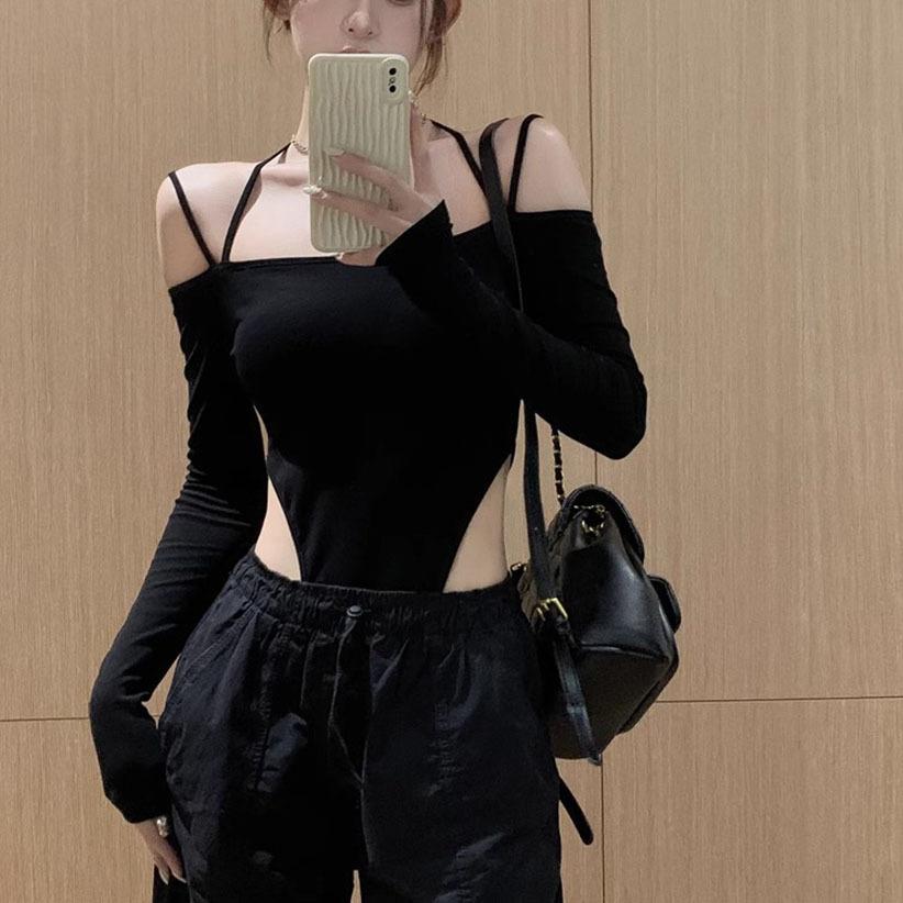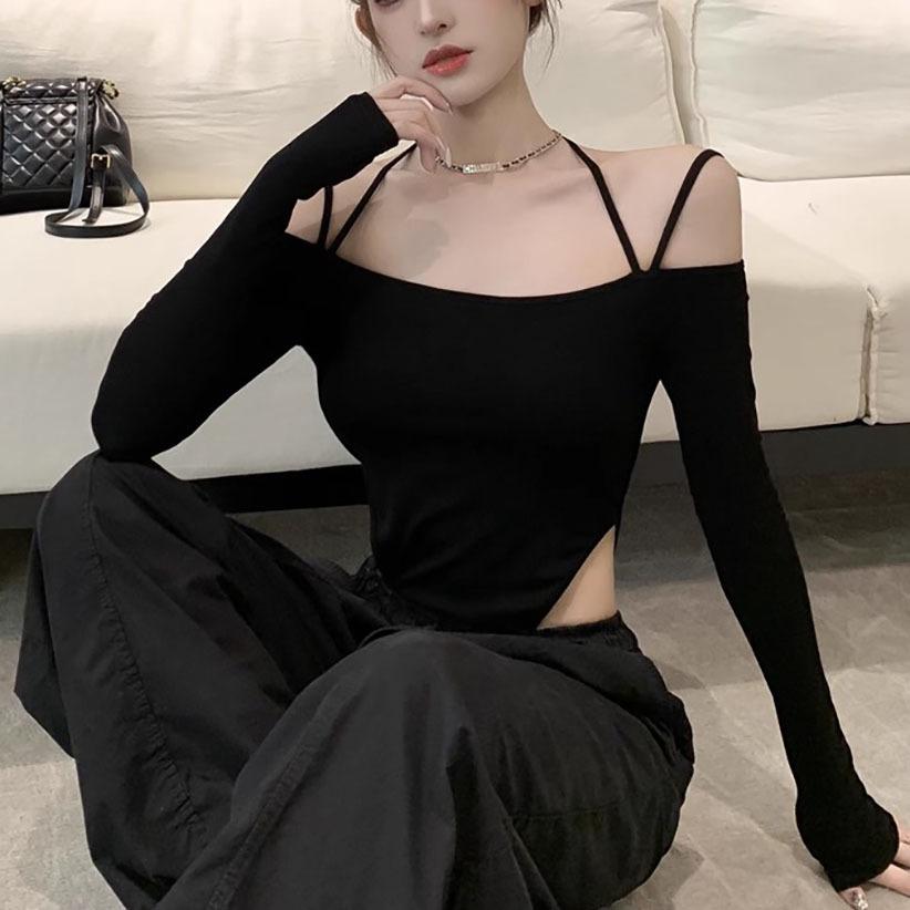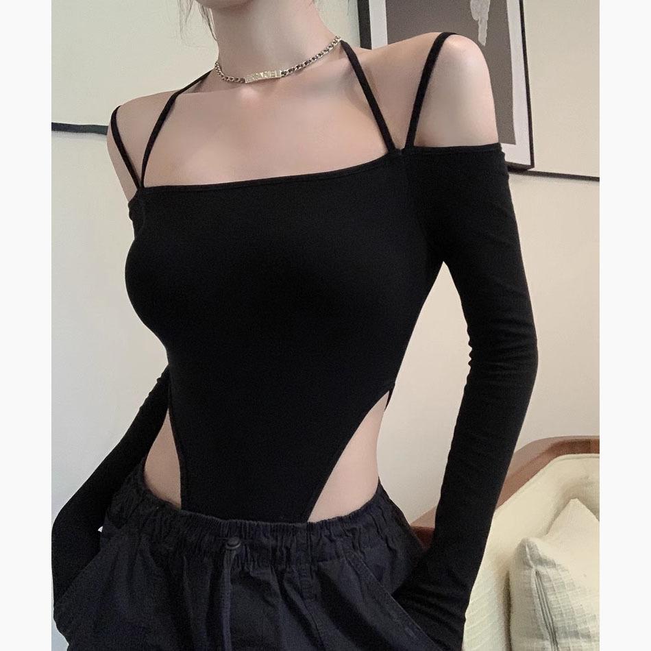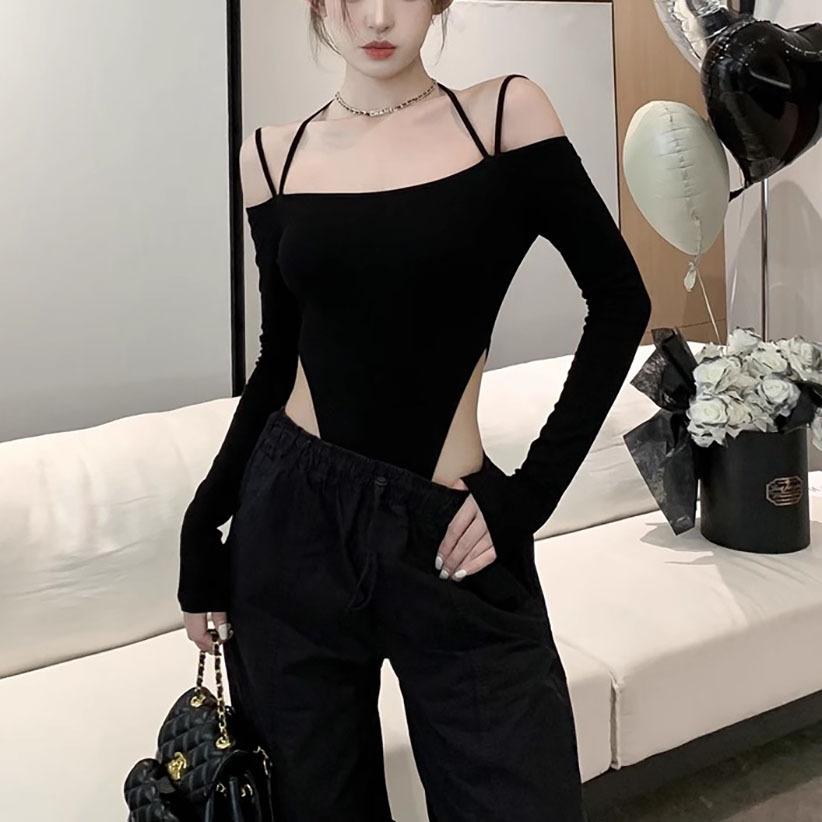 Deseo Puro Sexy Chica Caliente Halter Cuello Descubierto Irregular Manga Larga Camiseta Negra Un Hombro Top Enterizo para Mujer
