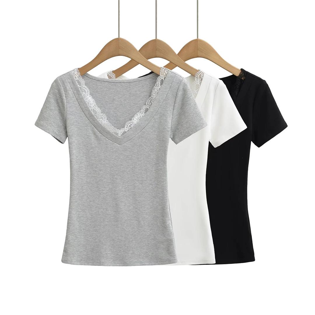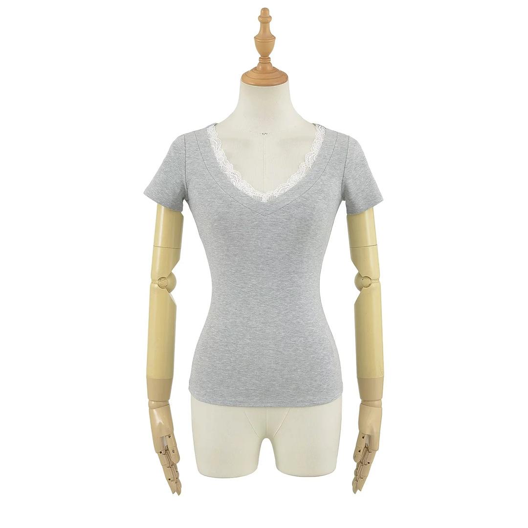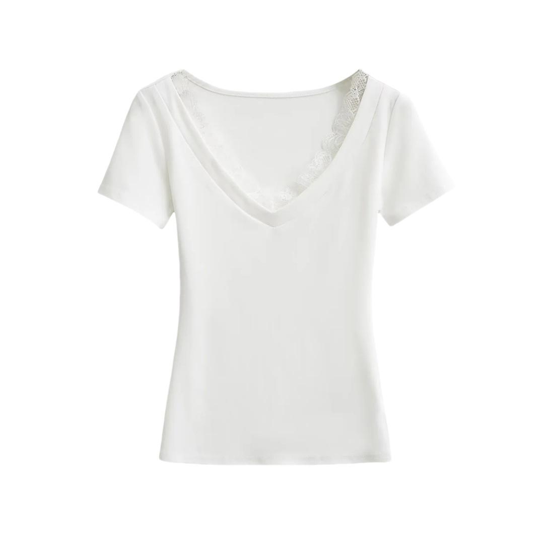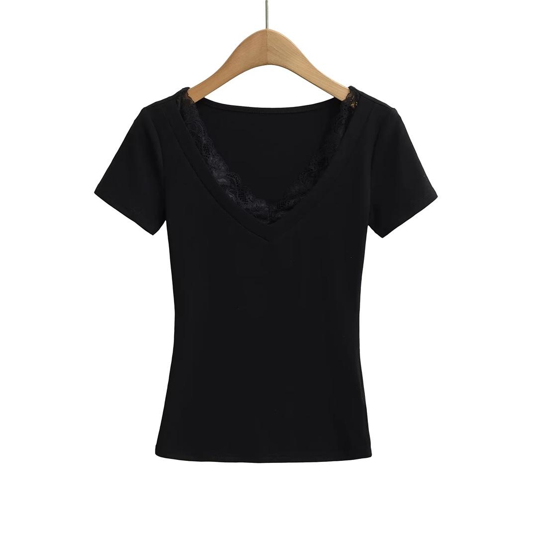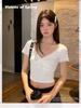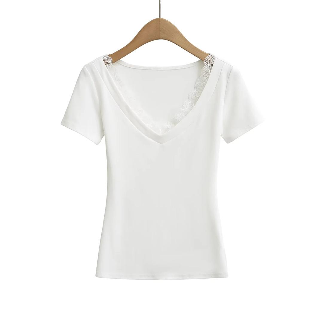 Playera de Manga Corta con Cuello en V y Encaje Puro y Sexy para Mujer Verano Nueva Ajuste Slim Dulce y Picante Chica Exponiendo Clavícula Adelgazante Top Corto