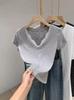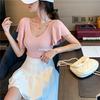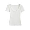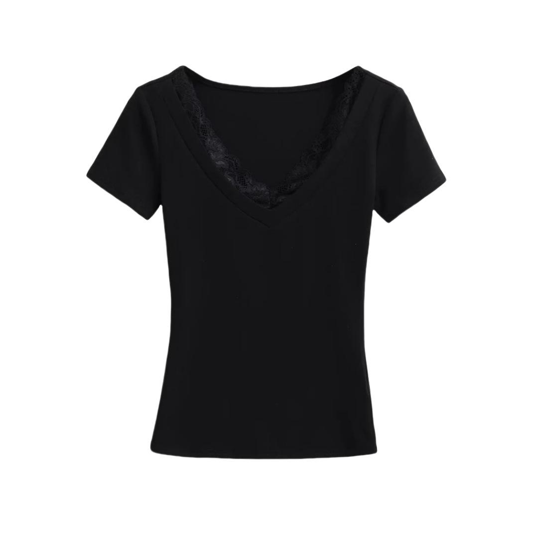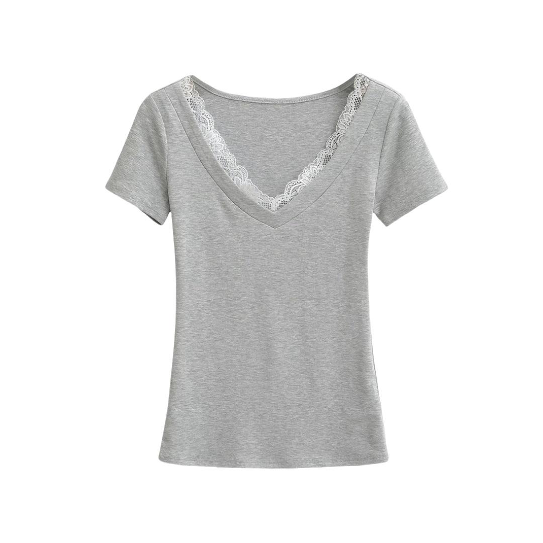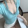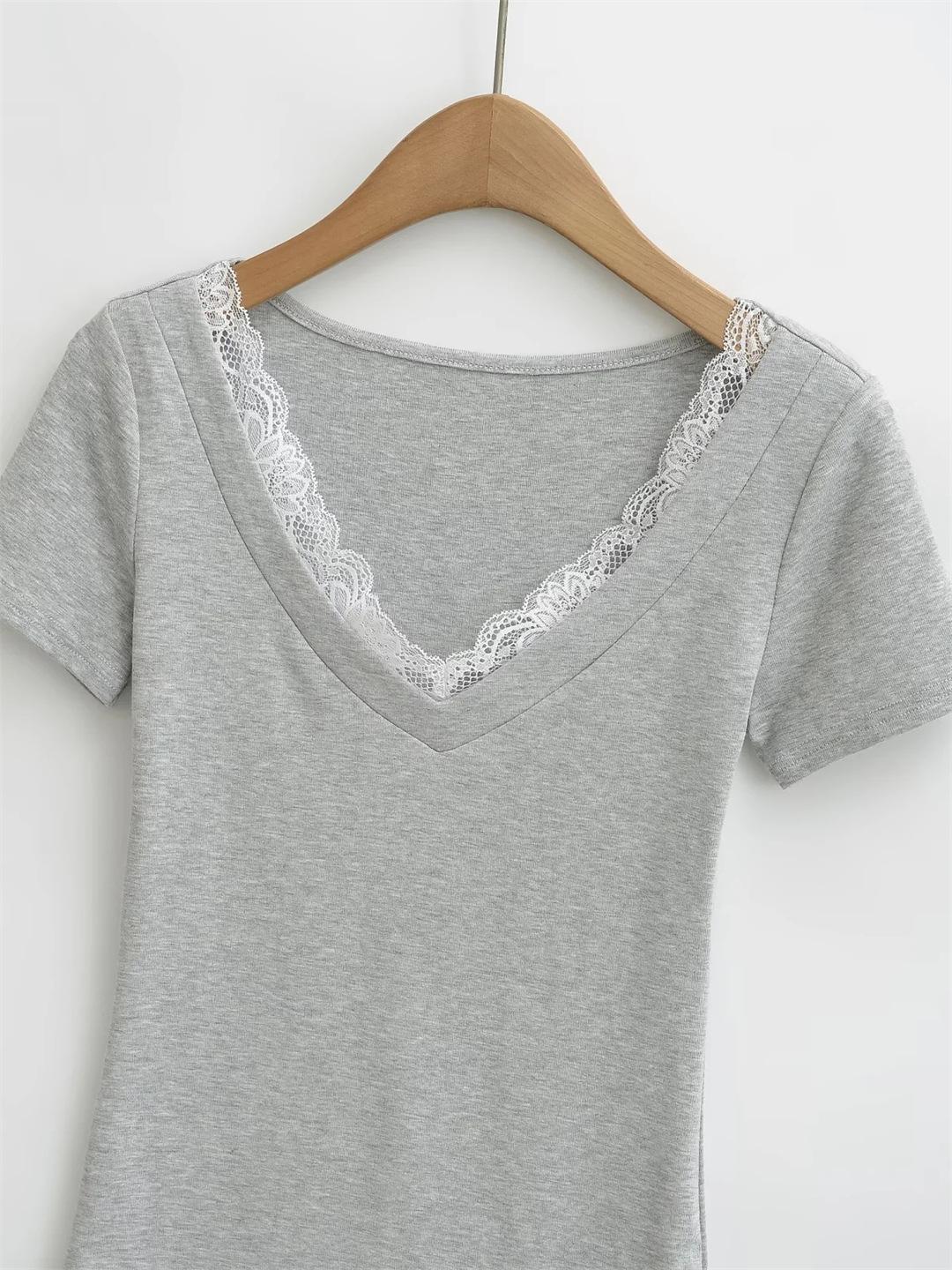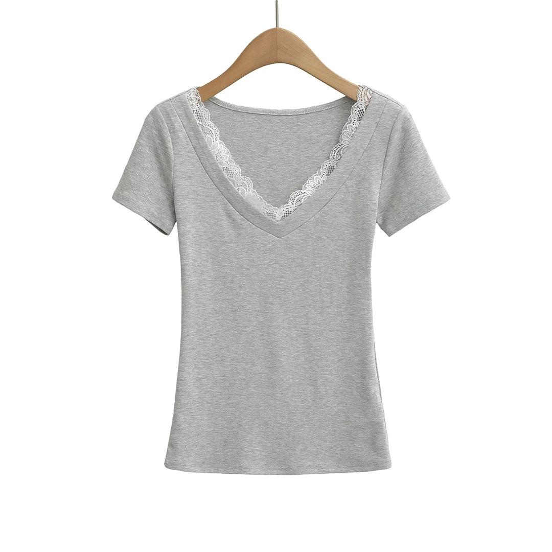 Playera de Manga Corta con Cuello en V y Encaje Puro y Sexy para Mujer Verano Nueva Ajuste Slim Dulce y Picante Chica Exponiendo Clavícula Adelgazante Top Corto