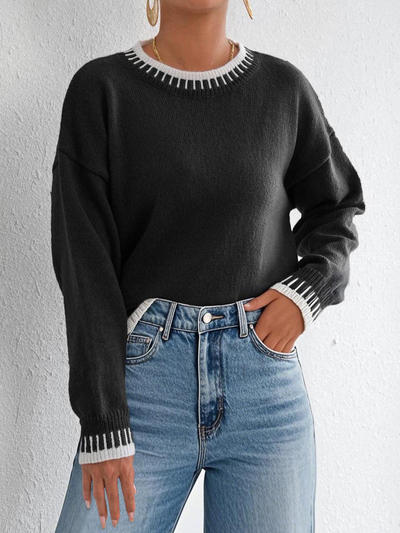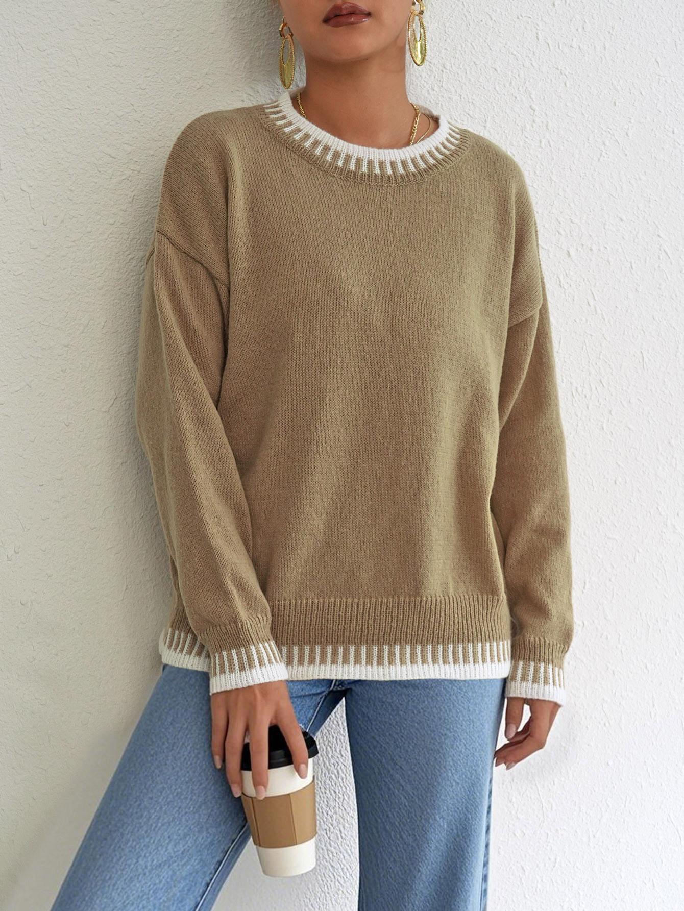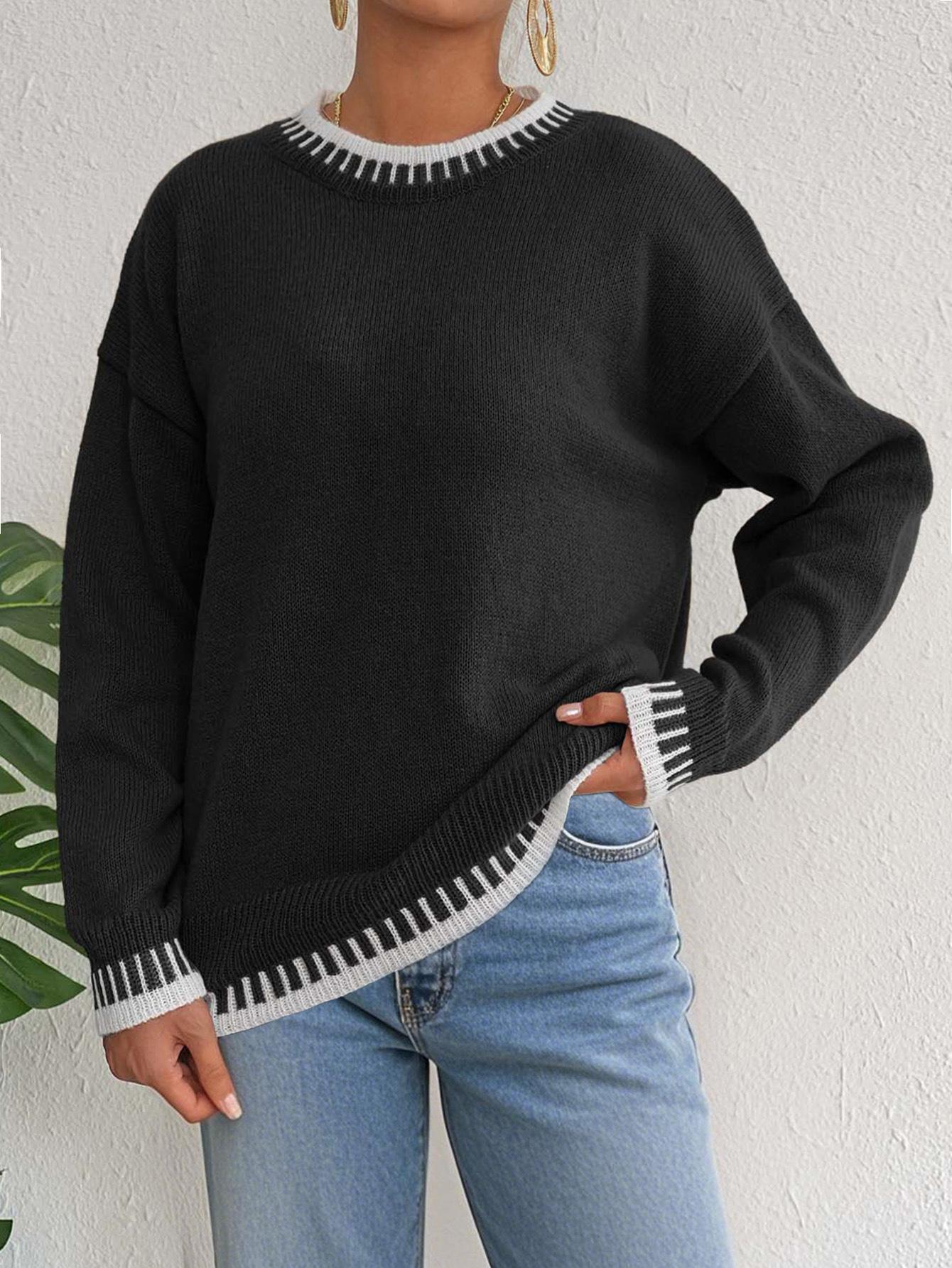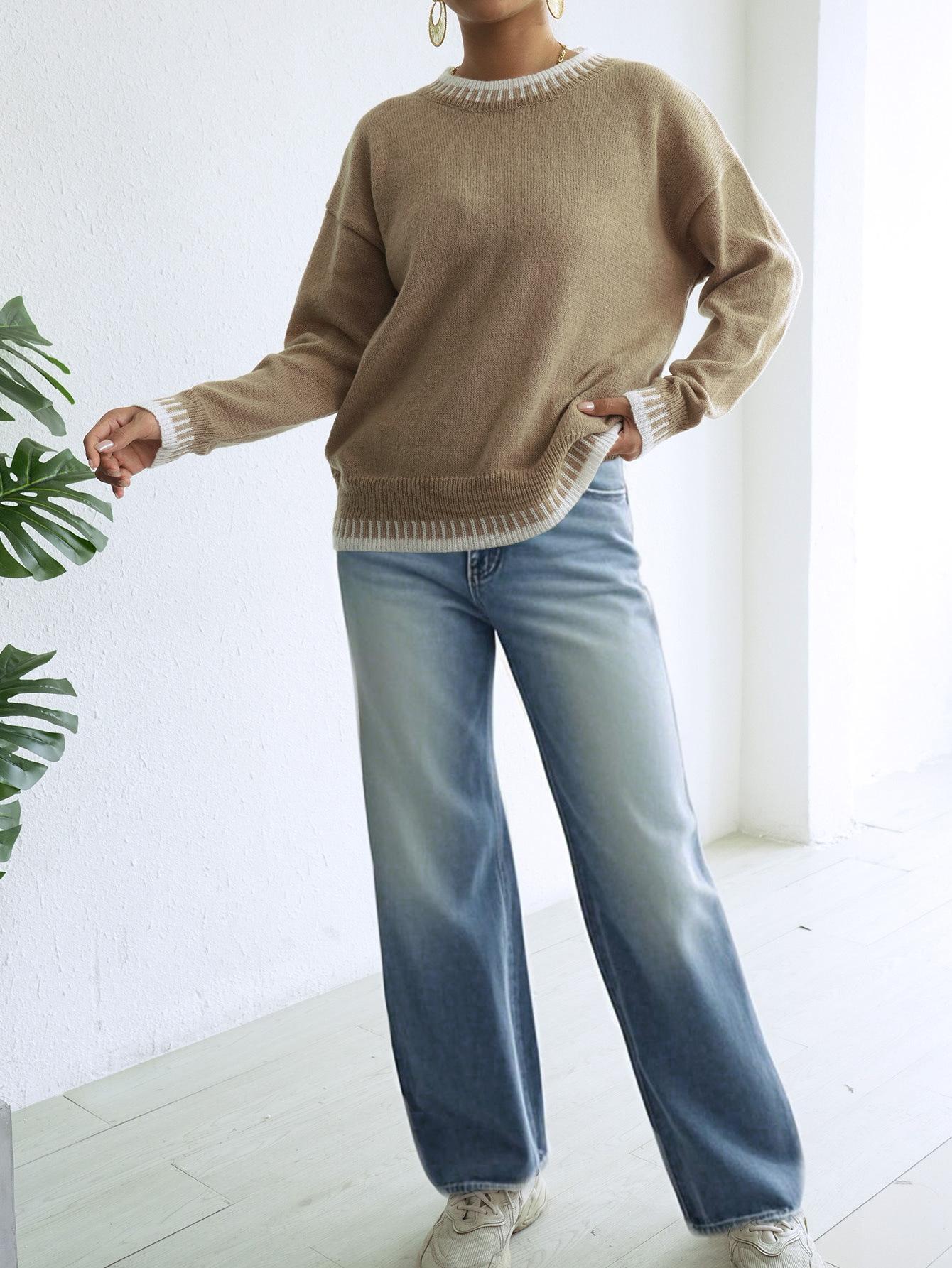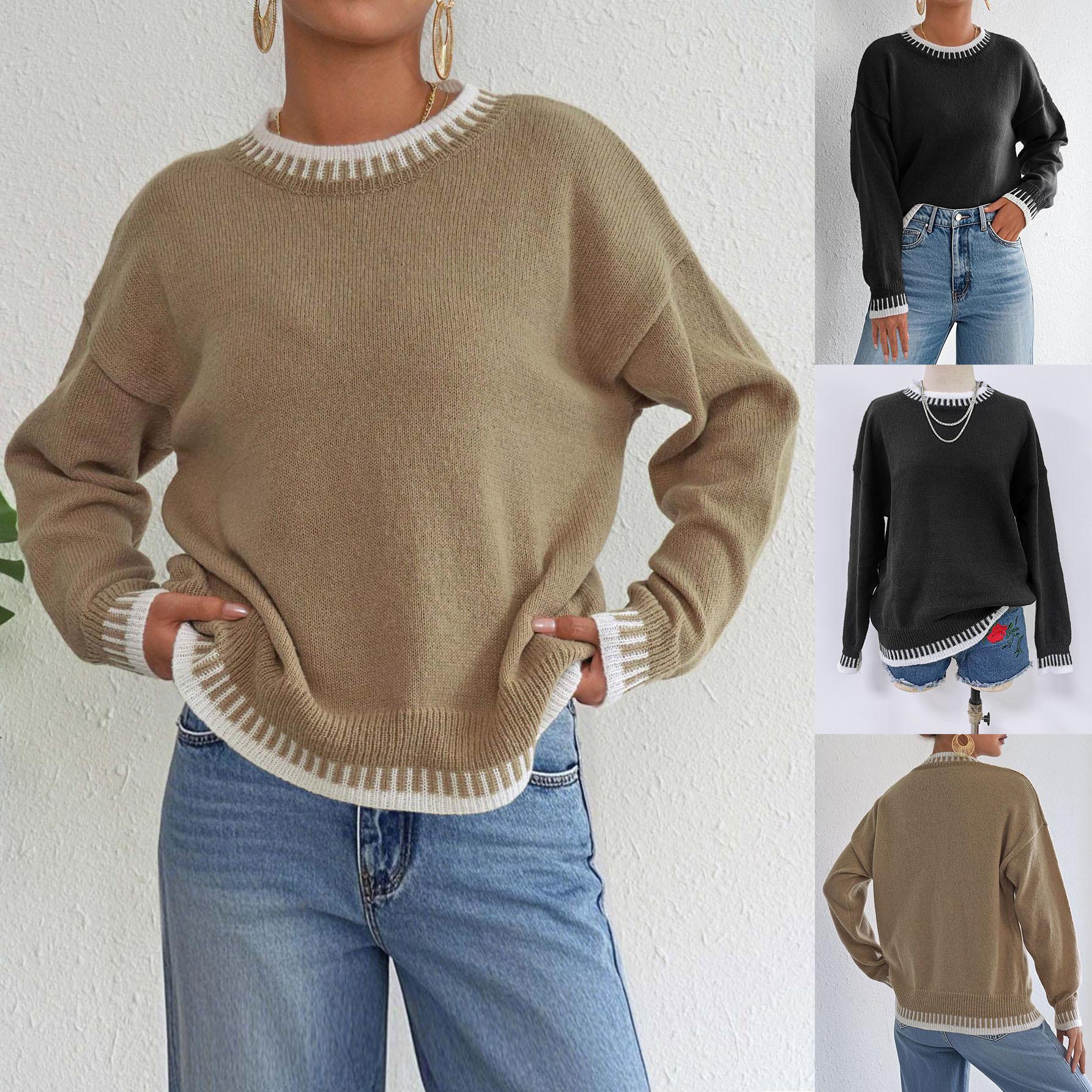 Comercio Exterior Otoño e Invierno Nuevo Ropa Transfronteriza Europea y Americana Empalme de Color en Contraste Jersey Casual Holgado Tops de Mujer para Mujer