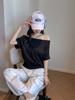 Playera Nueva de Fábrica Negra con Hombros Descubiertos Nicho Manga Corta para Mujer, Estilo Lazy, Top Casual Holgado y Versátil