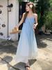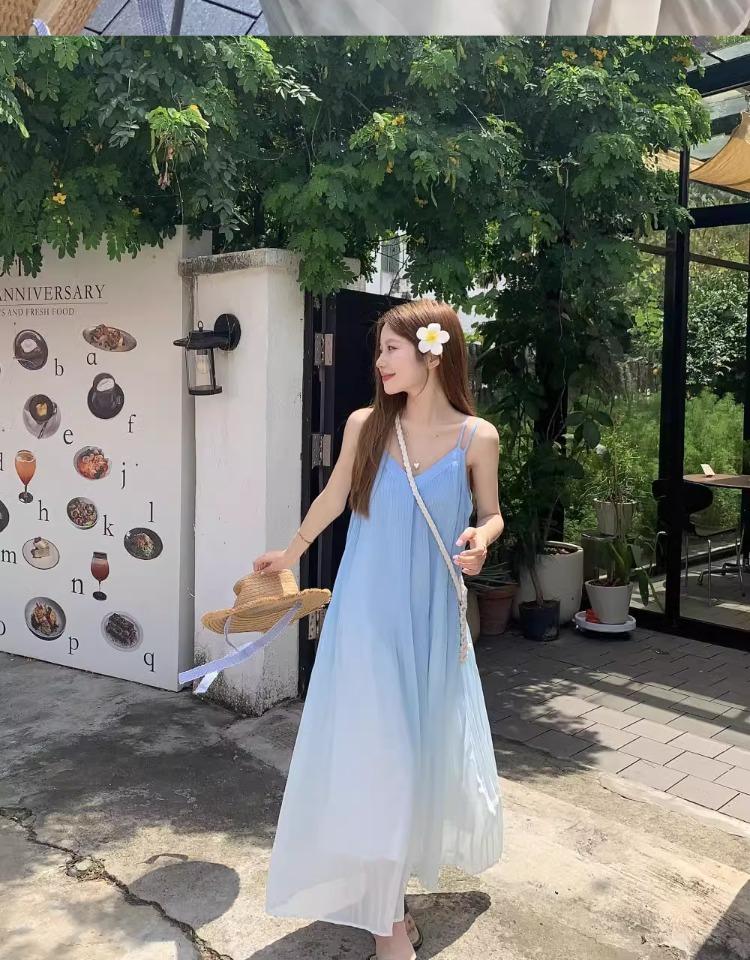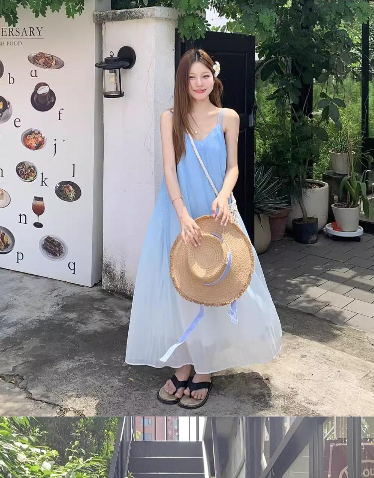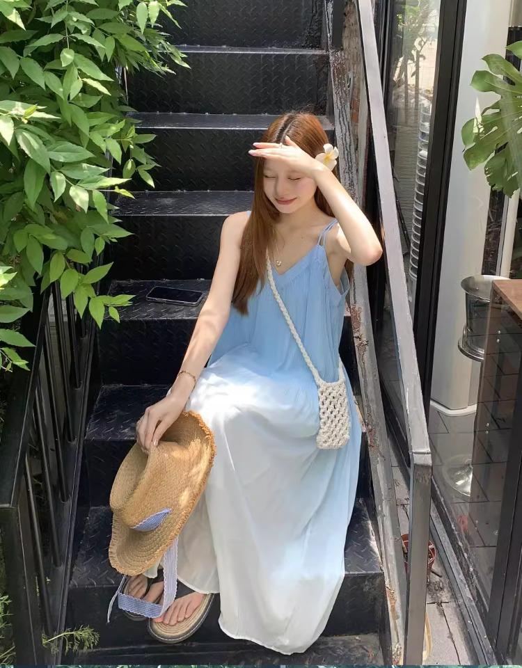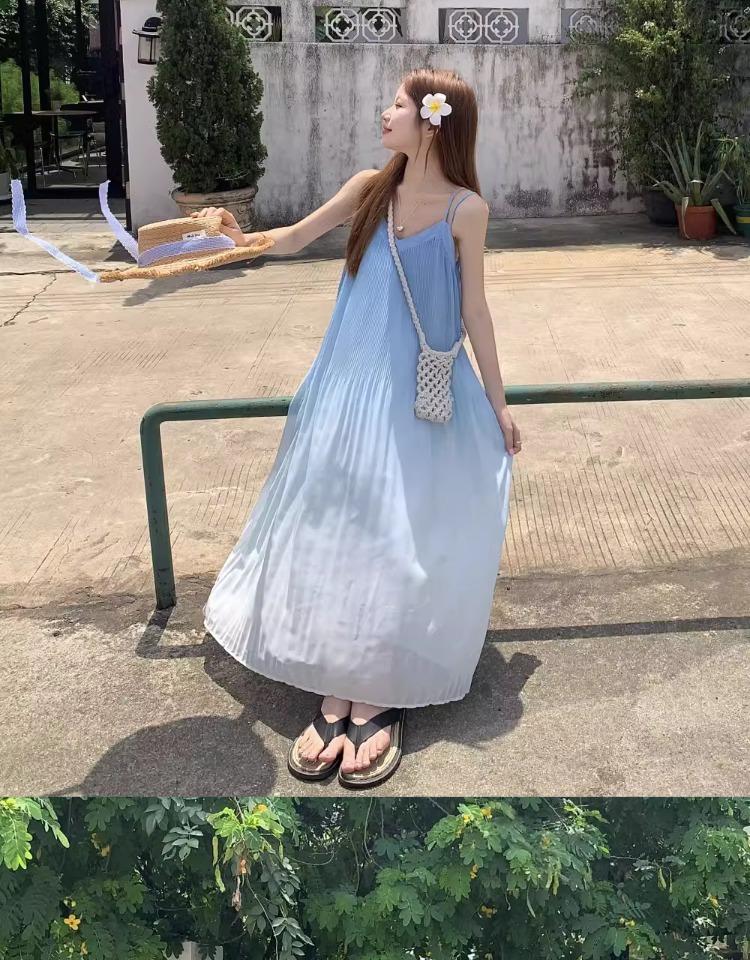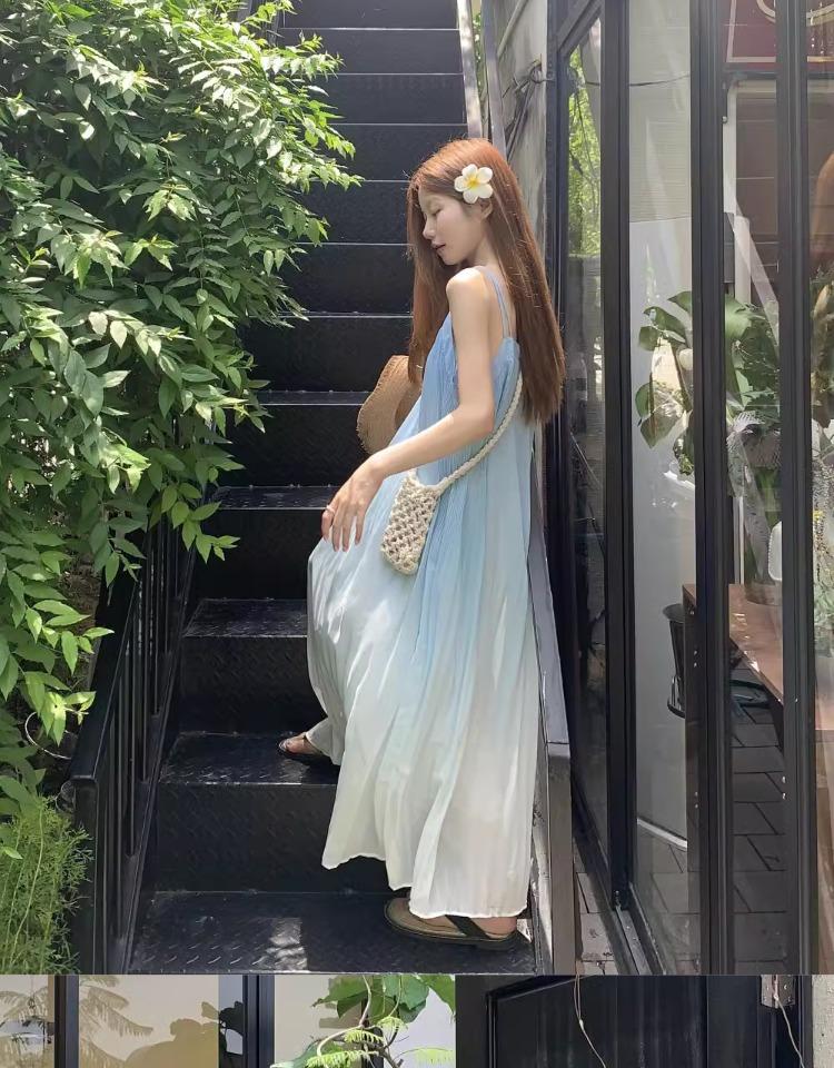 Vestido de Tirantes Estilo Resort Costero Azul Degradado Verano Nuevo Talla Grande mm Gordo Cubre Vientre Gasa Falda Larga Falda de Playa