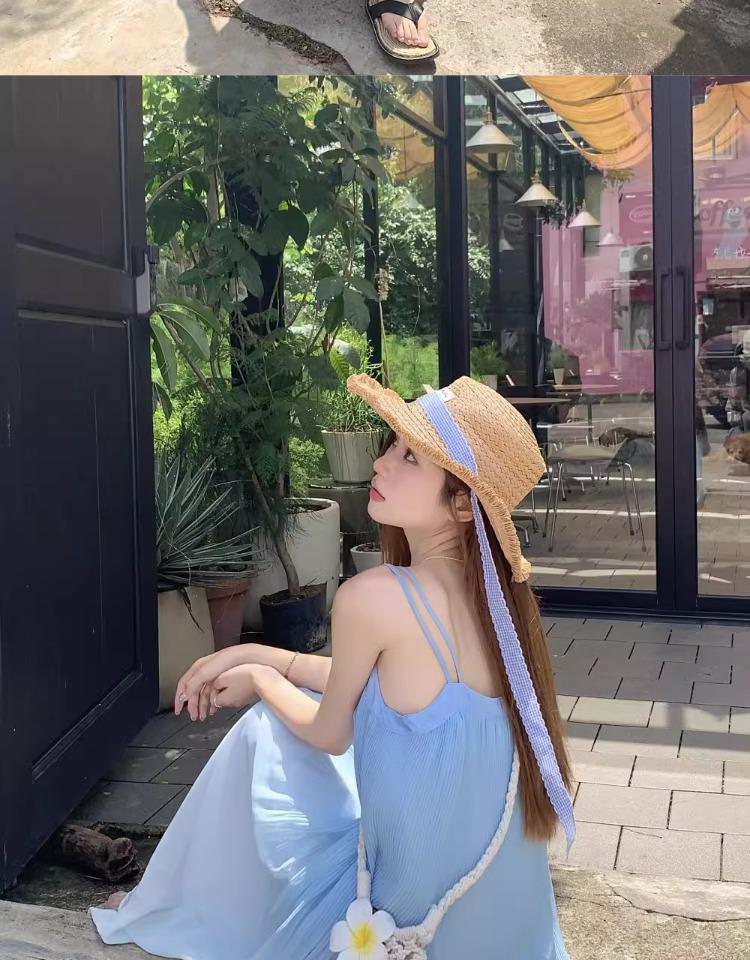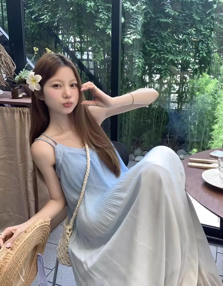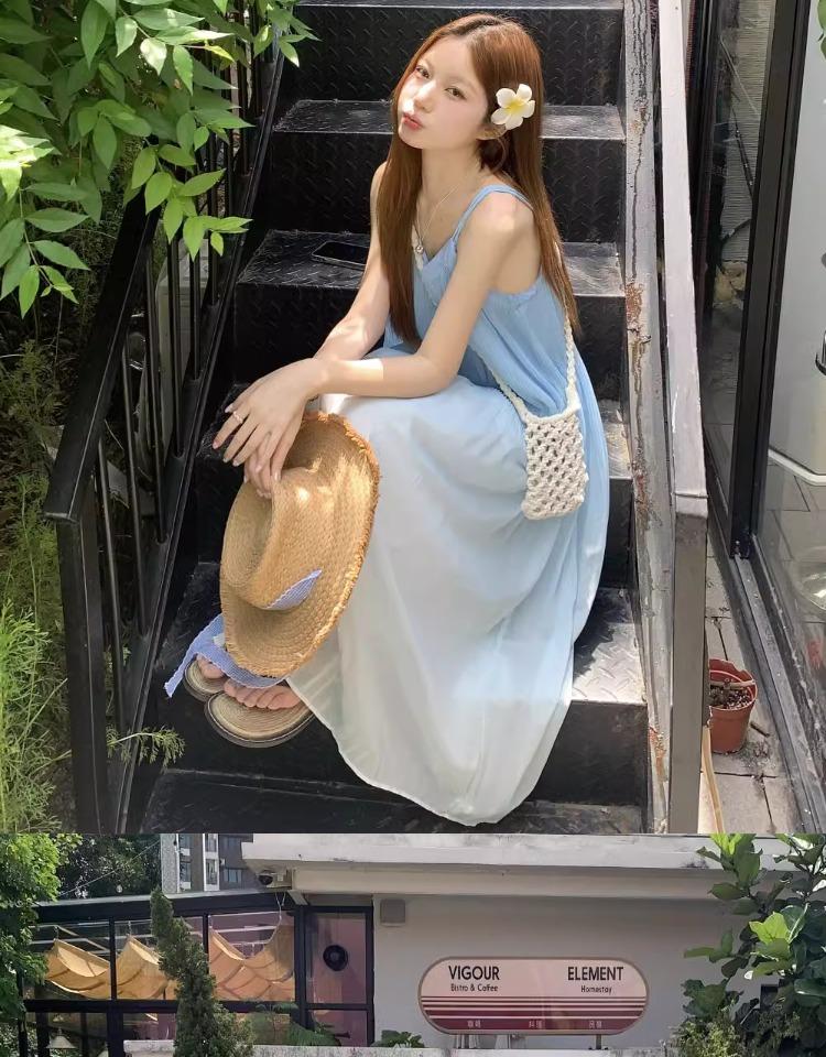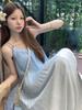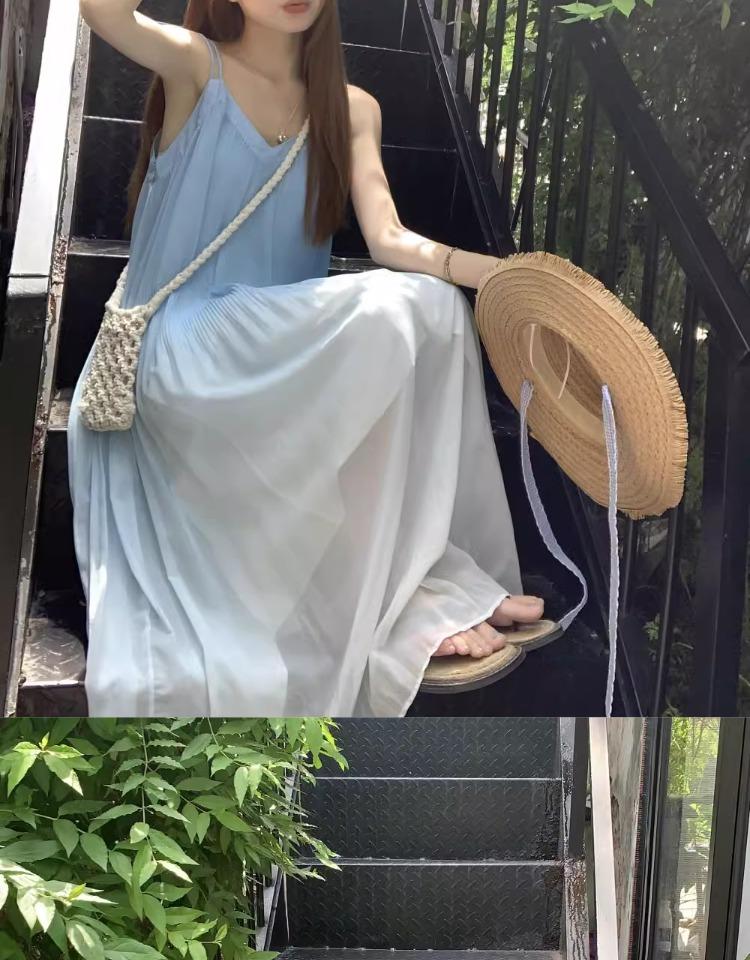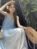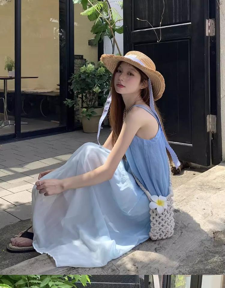Vestido de Tirantes Estilo Resort Costero Azul Degradado Verano Nuevo Talla Grande mm Gordo Cubre Vientre Gasa Falda Larga Falda de Playa