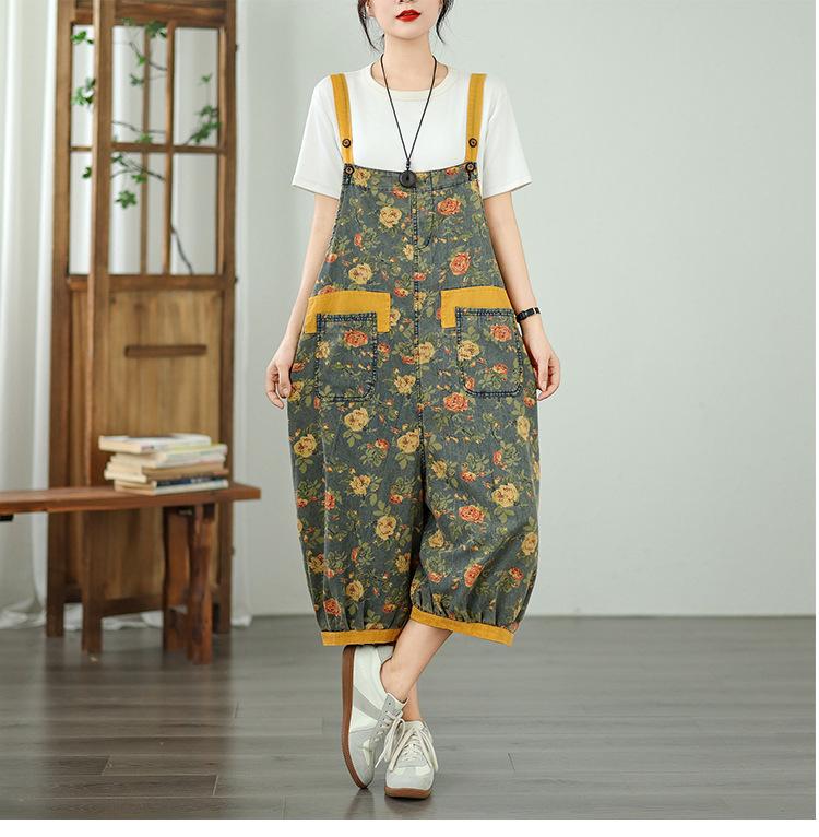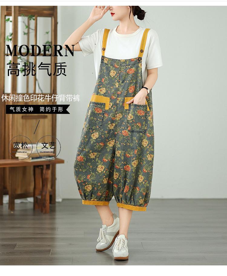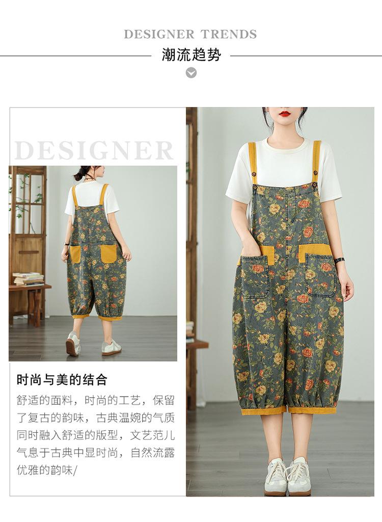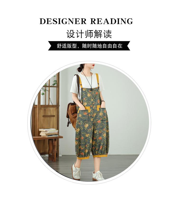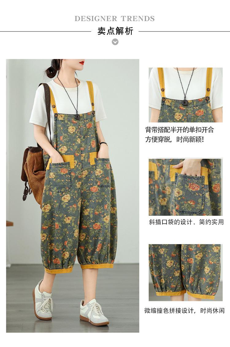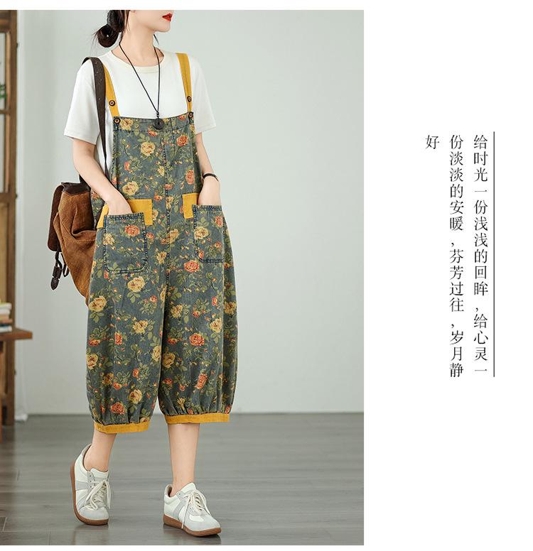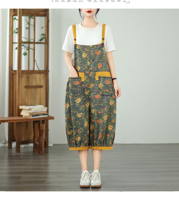2025 Nuevo Estilo de Verano Literario Talla Grande Holgado Adelgazante Retro Estampado Peto Denim Tres Cuartos