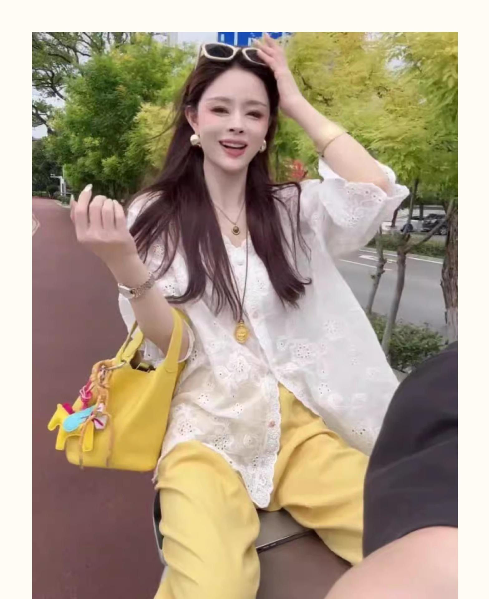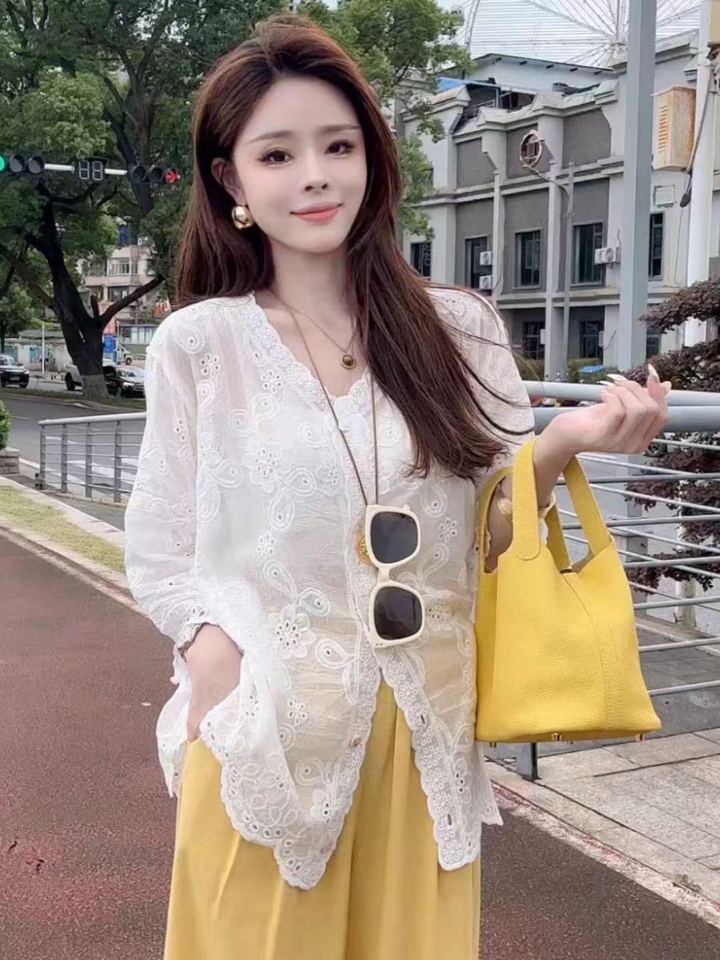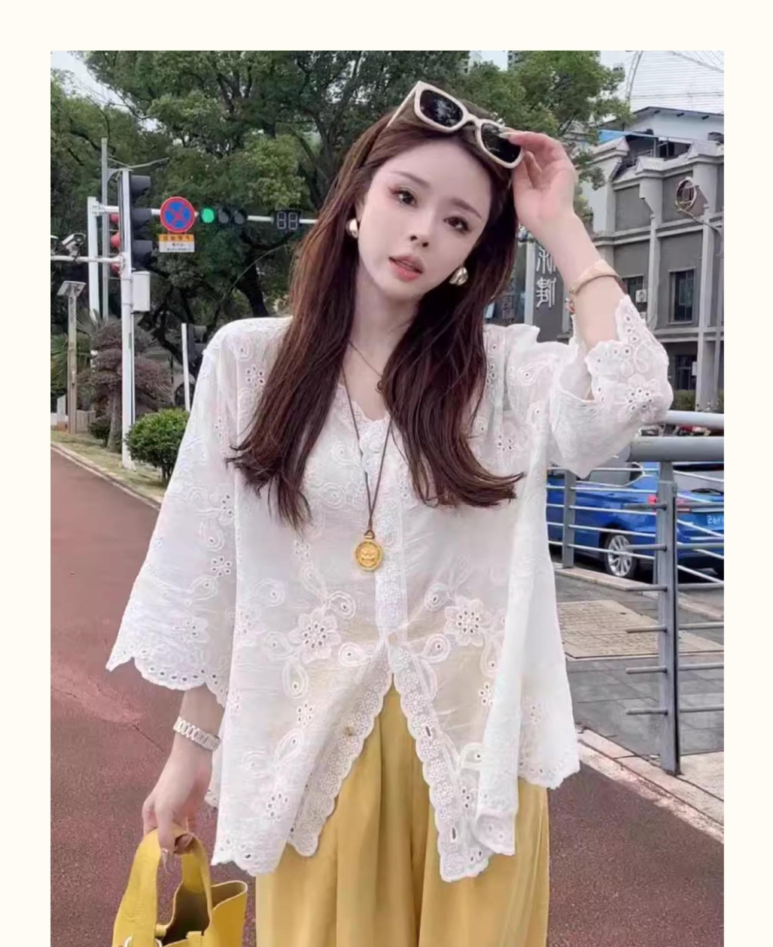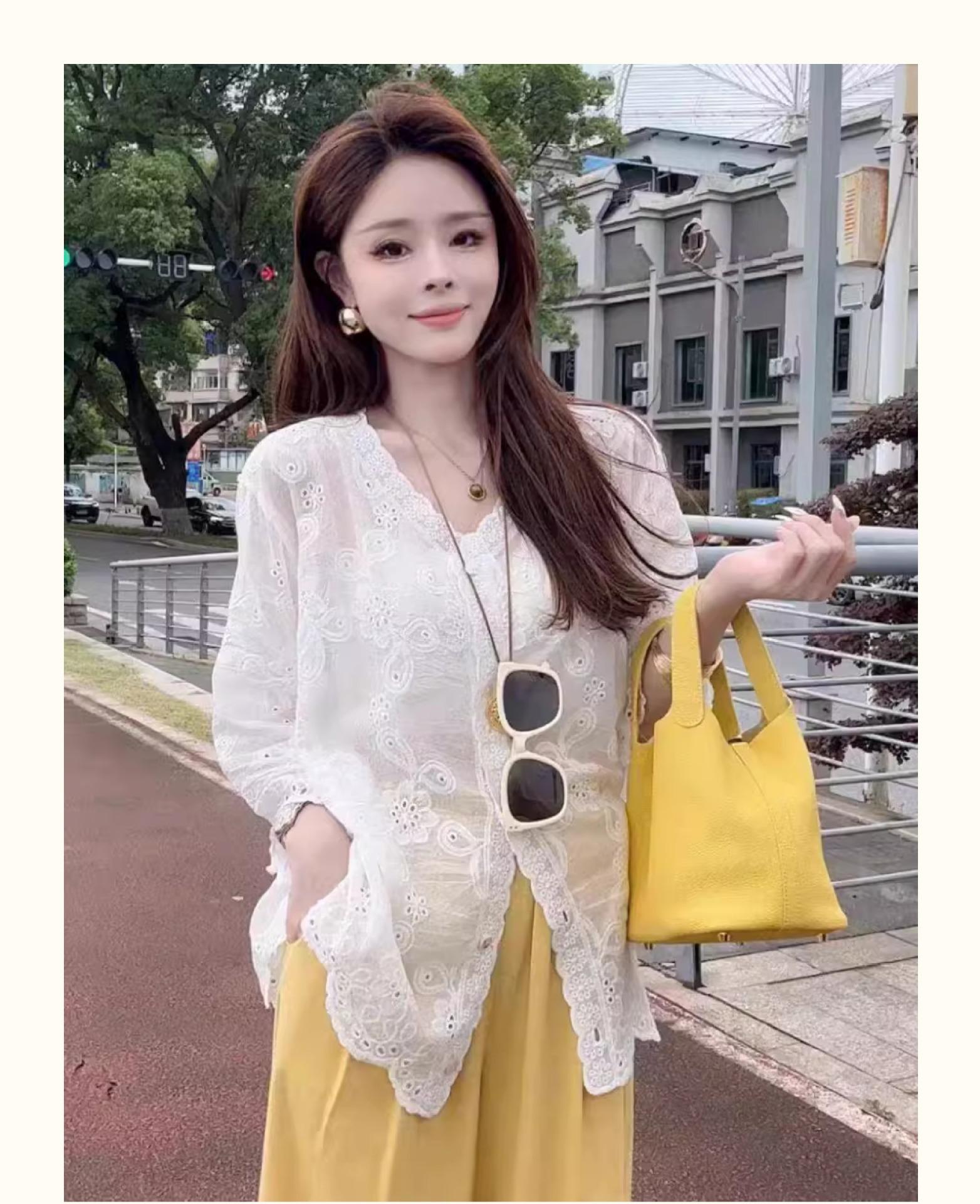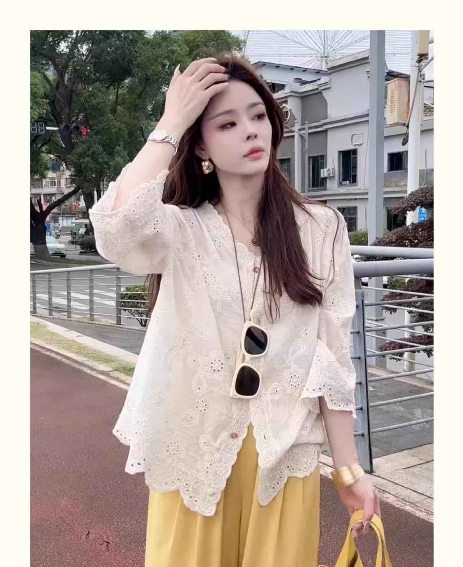 Camisa Francesa Dulce con Cuello en V Recorte Bordado para Mujer Verano Nuevo Monobotón de una Fila Cárdigan Holgado Chaqueta Top