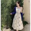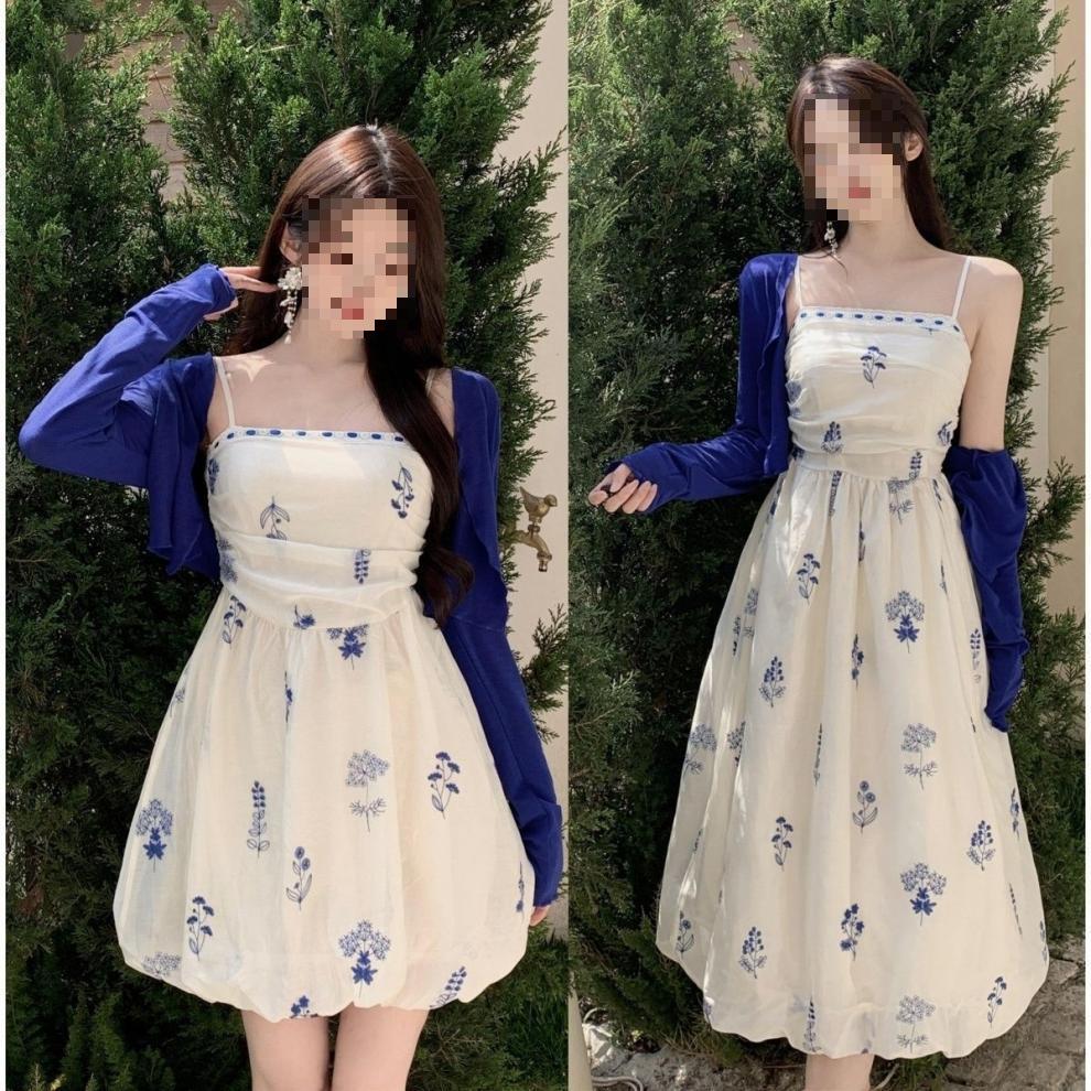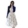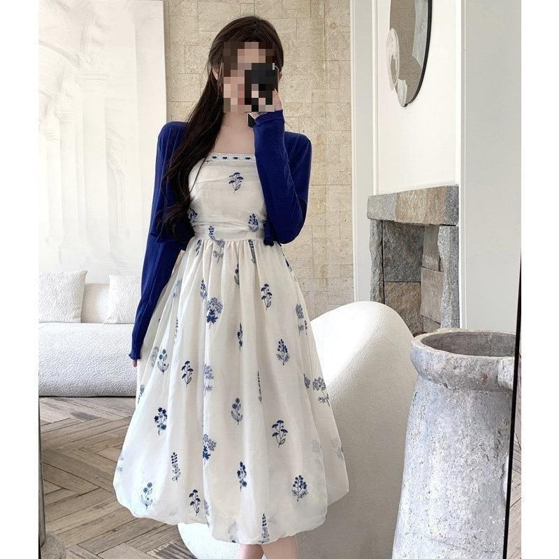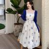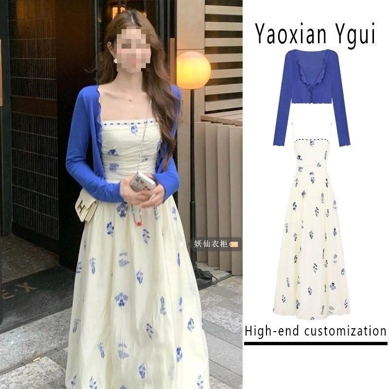 Ligeramente Gordito mm Nuevo Chinoiserie Sal Marina Coco Francés Vestido de Tirantes Primavera y Verano Falda Botón + Cárdigan Conjunto de Dos Piezas