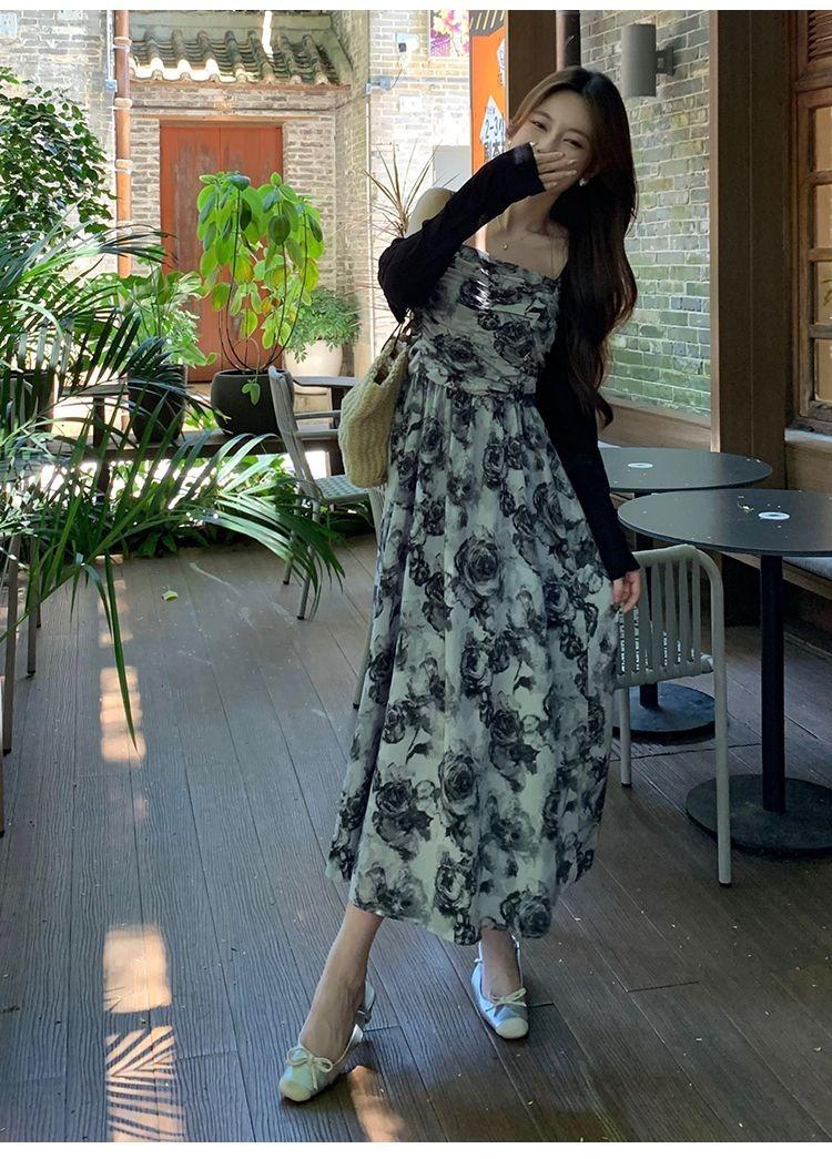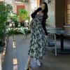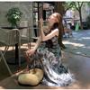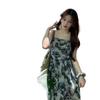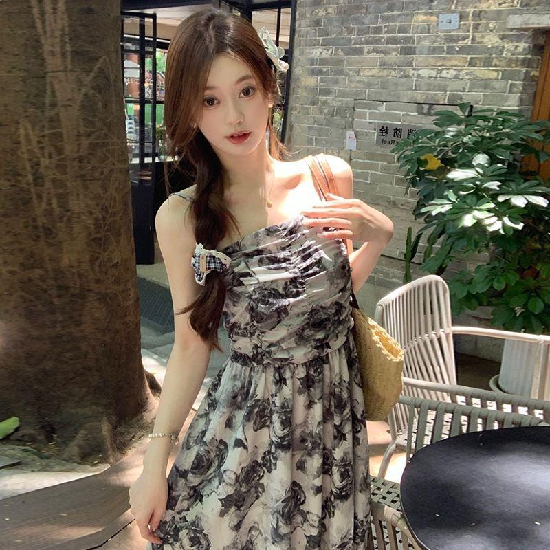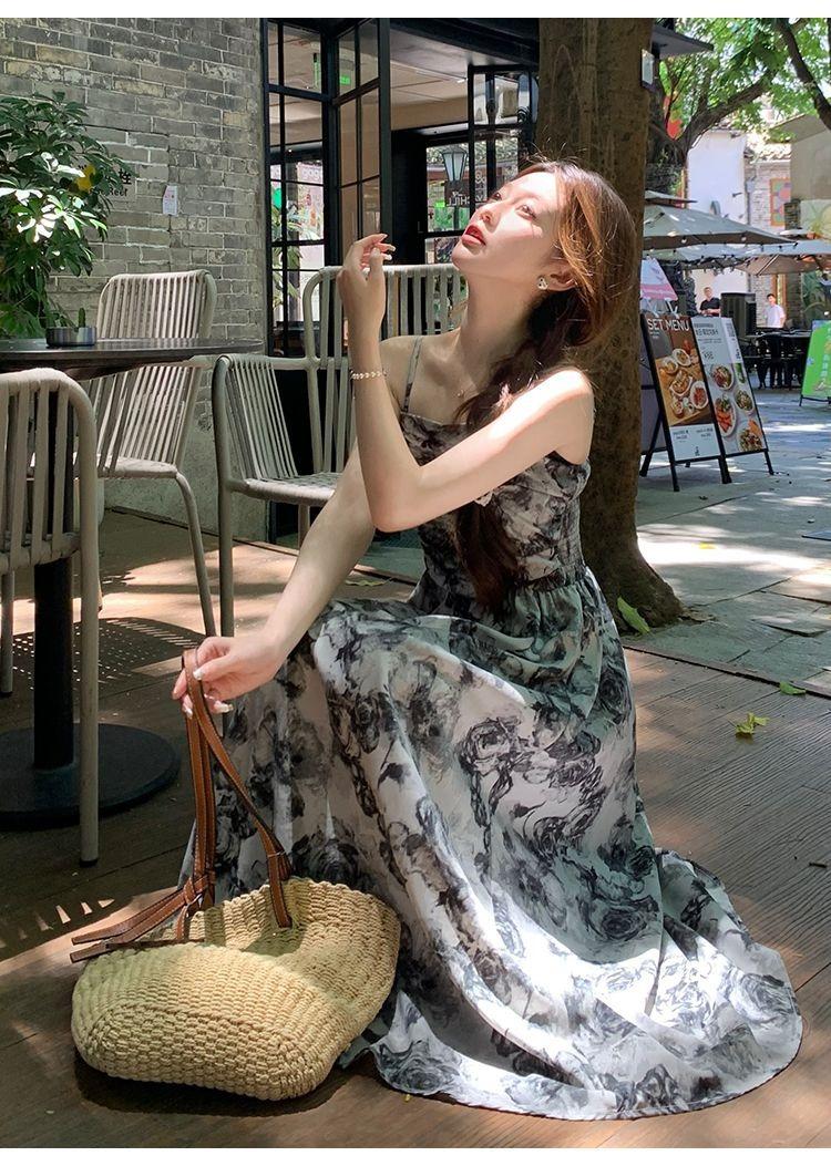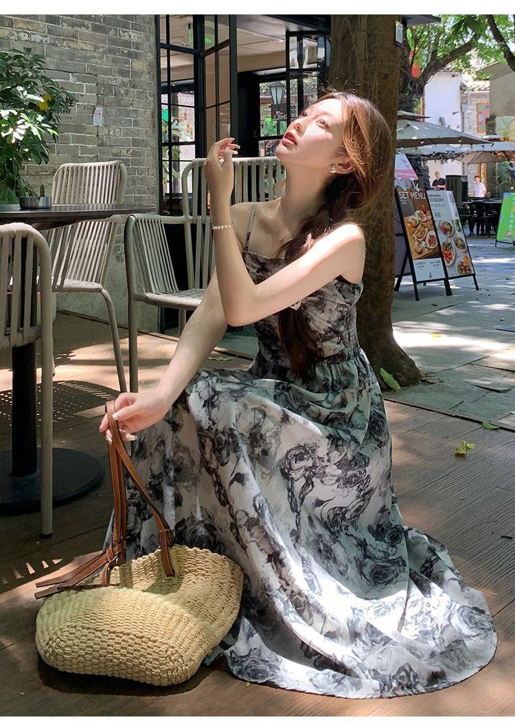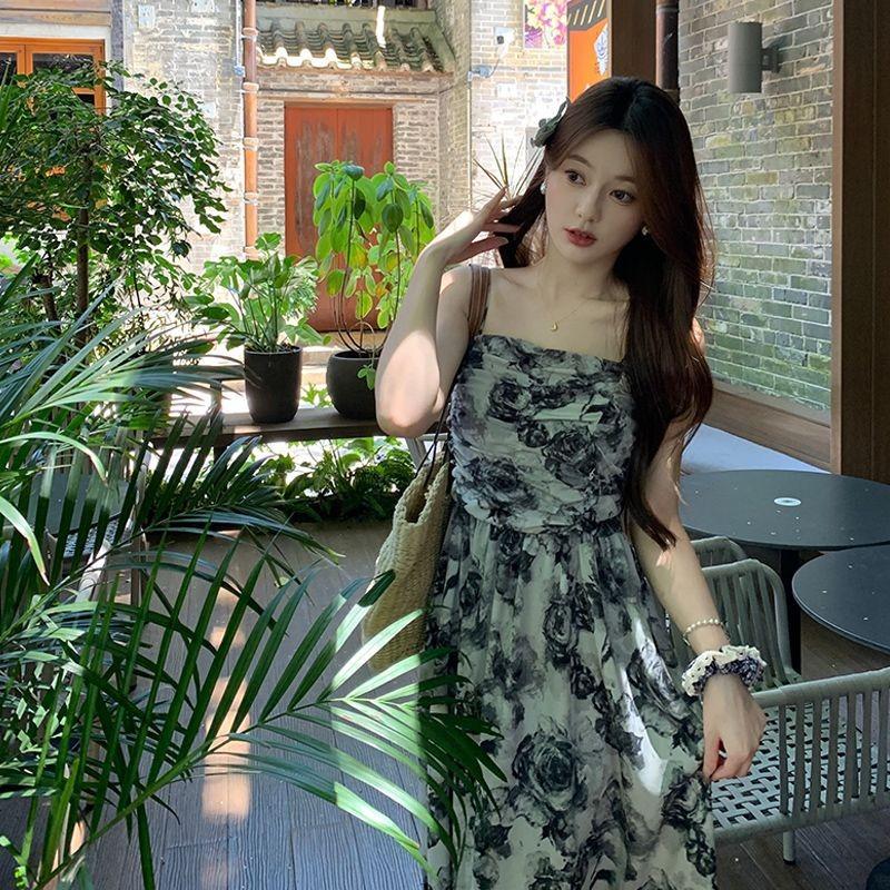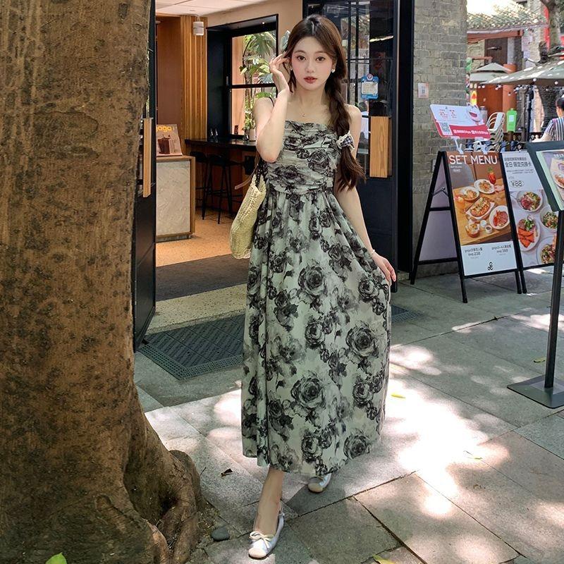 Vestido de Tirantes Floral de Tinta Retro Francés para Mujer Verano Nuevo Diseño Temperamento Cintura Falda Larga Vestido
