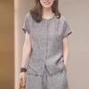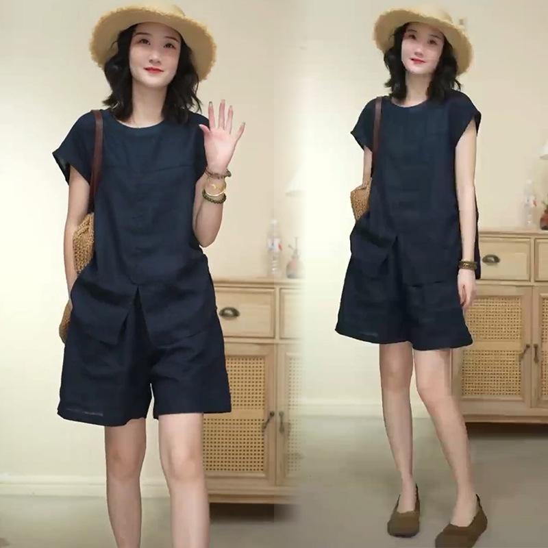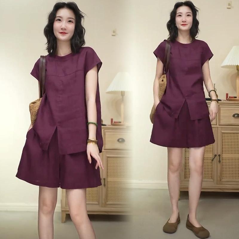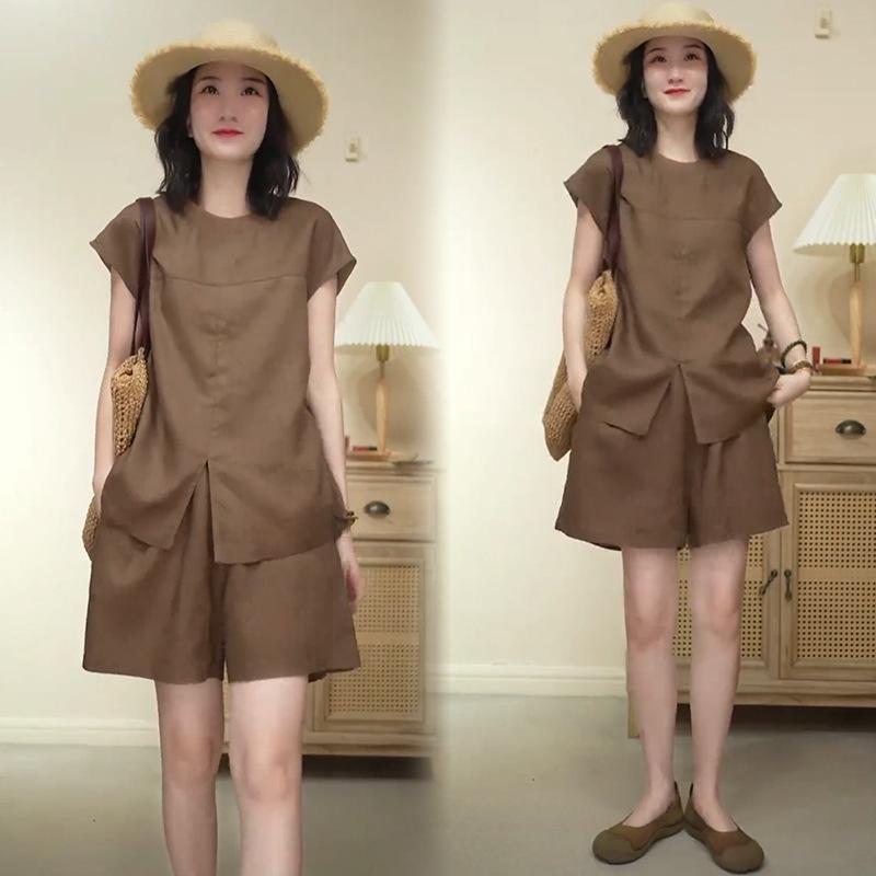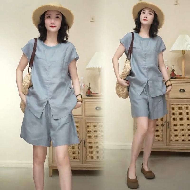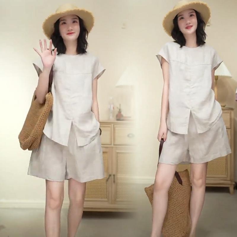 Traje de Moda de Lino para Mujer 2025 Verano Nuevo Look Holgado Adelgazante Abertura en el Bajo Manga Corta Pantalones Cortos de Pierna Ancha Conjunto de Dos Piezas