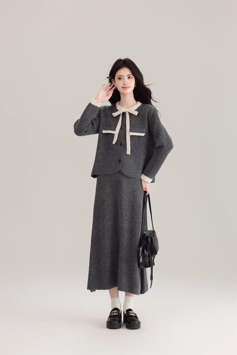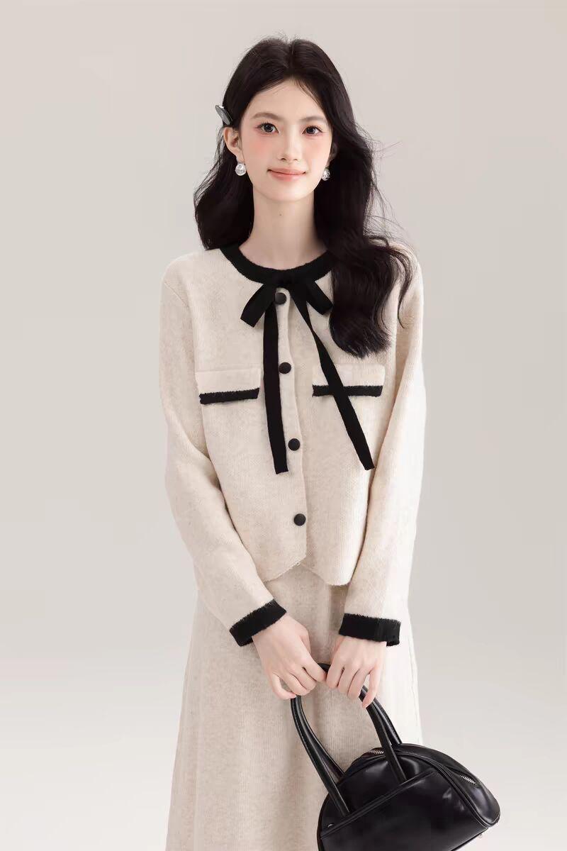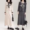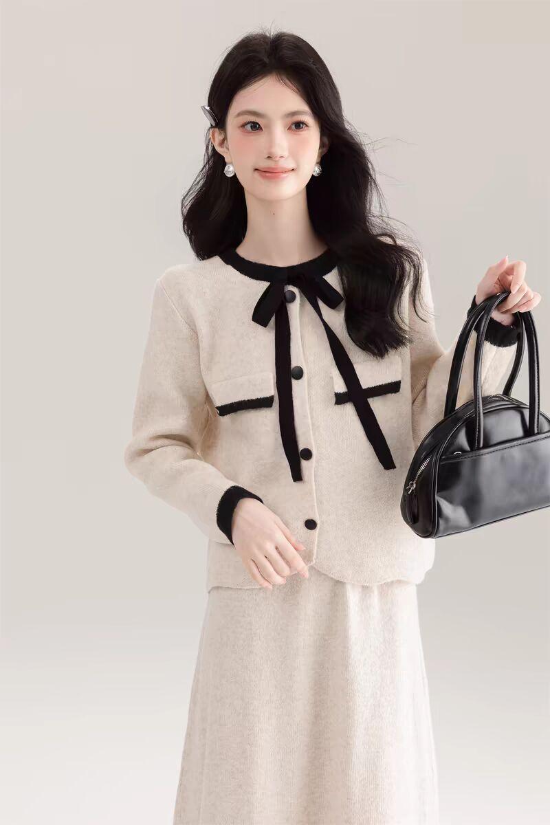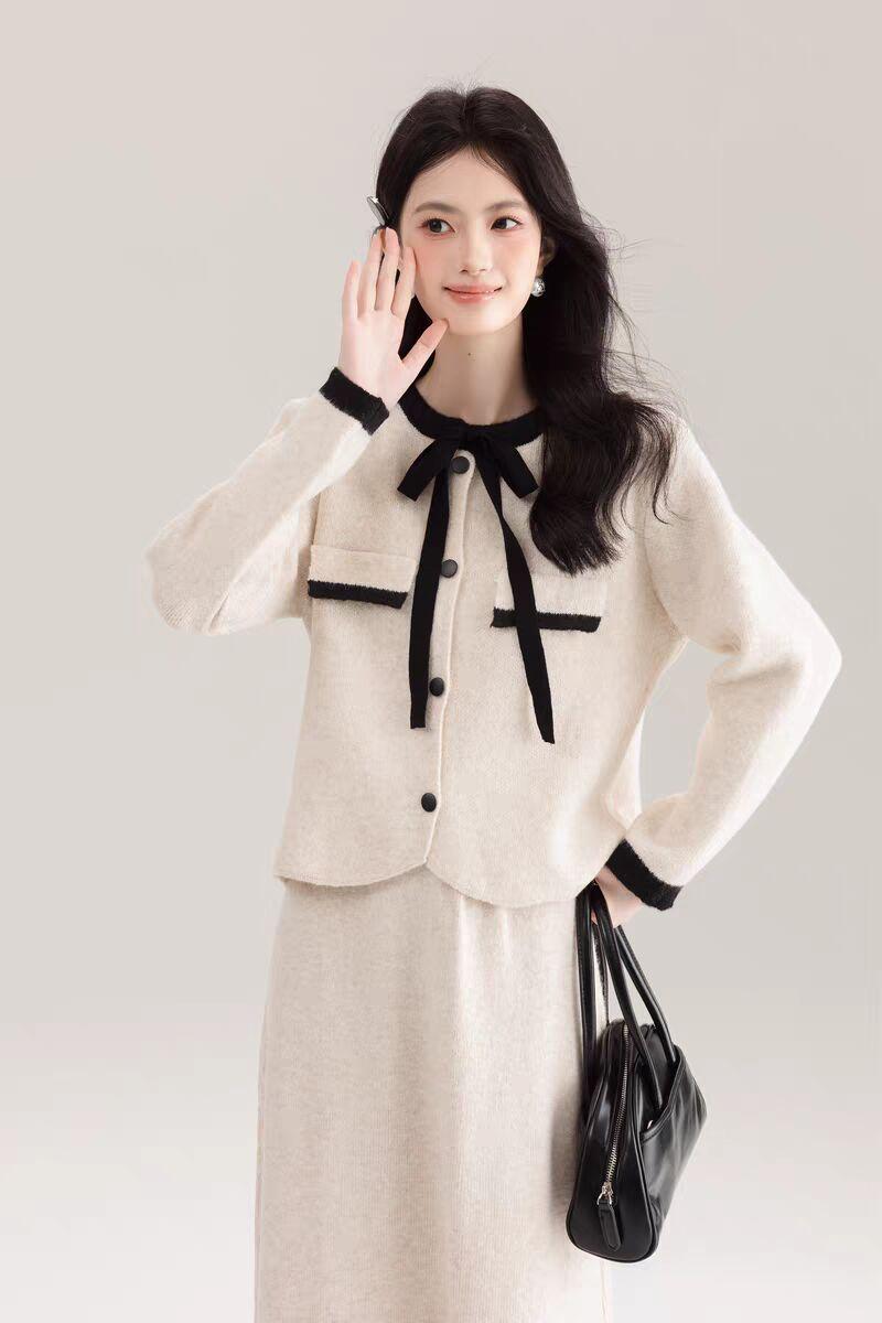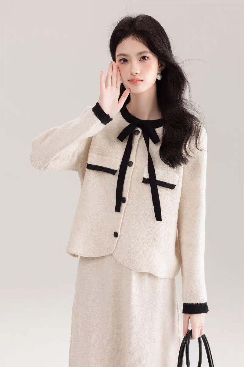Traje Cárdigan de Punto Suave Estilo Francés para Mujer Nuevo de Principios de Primavera Falda de Cintura Alta Conjunto de Dos Piezas