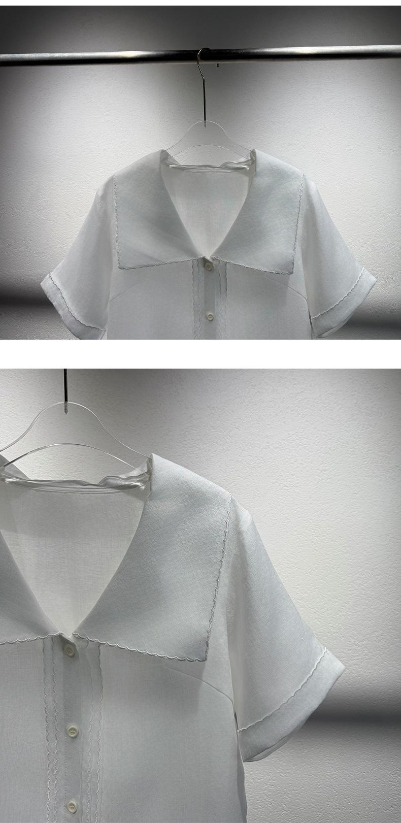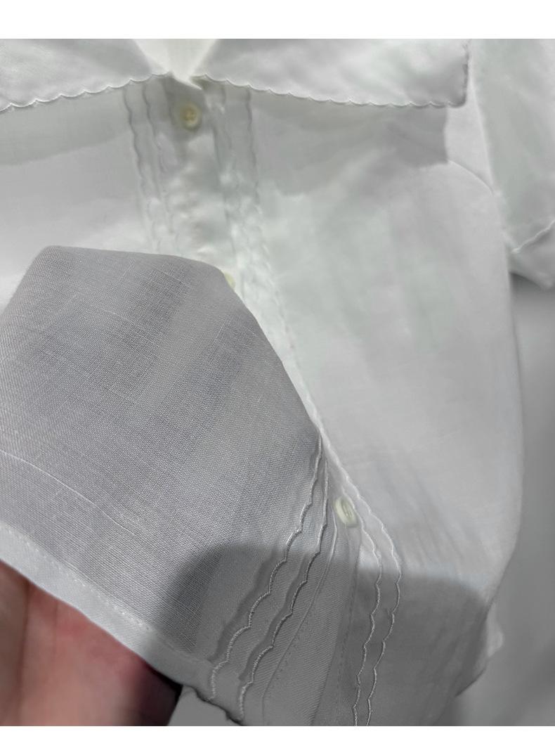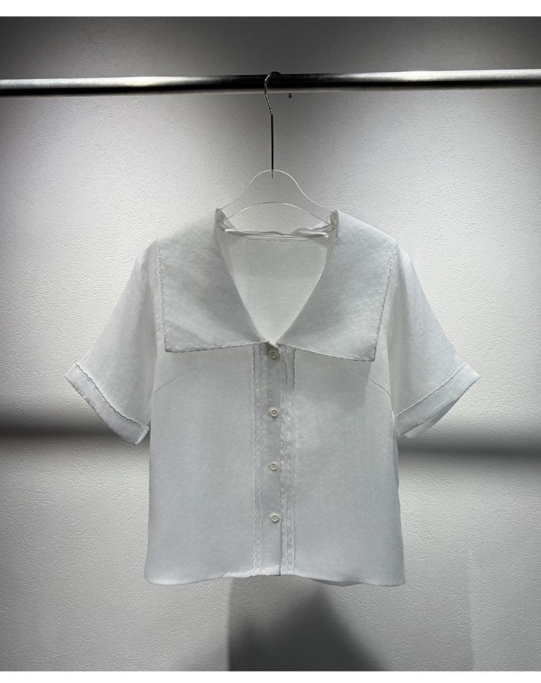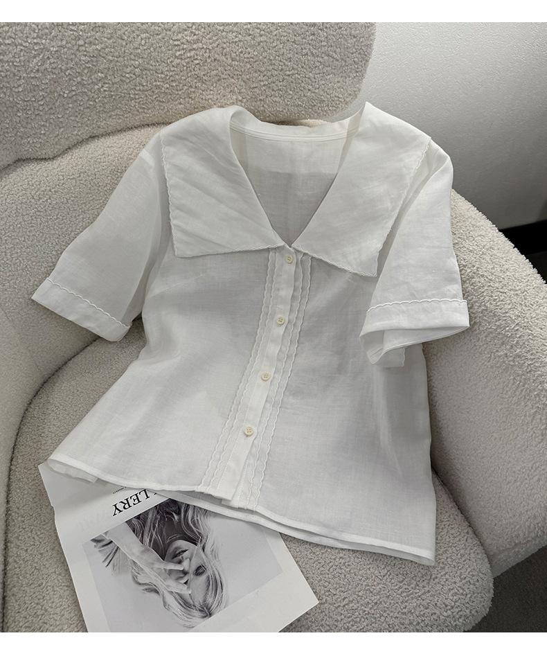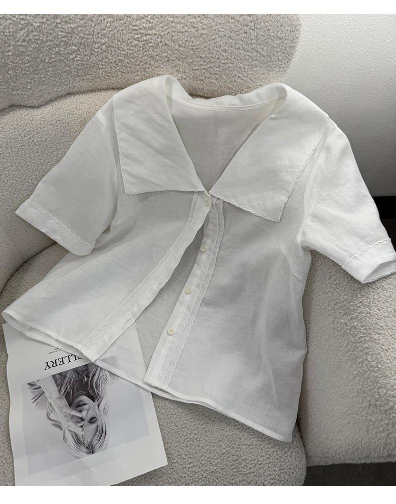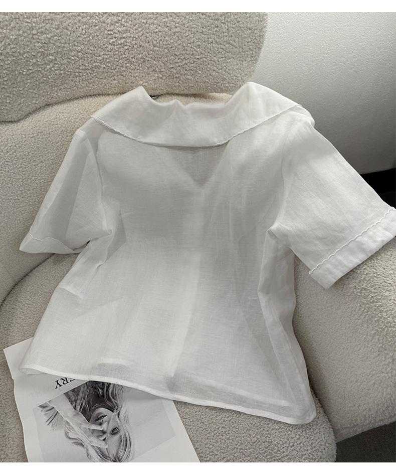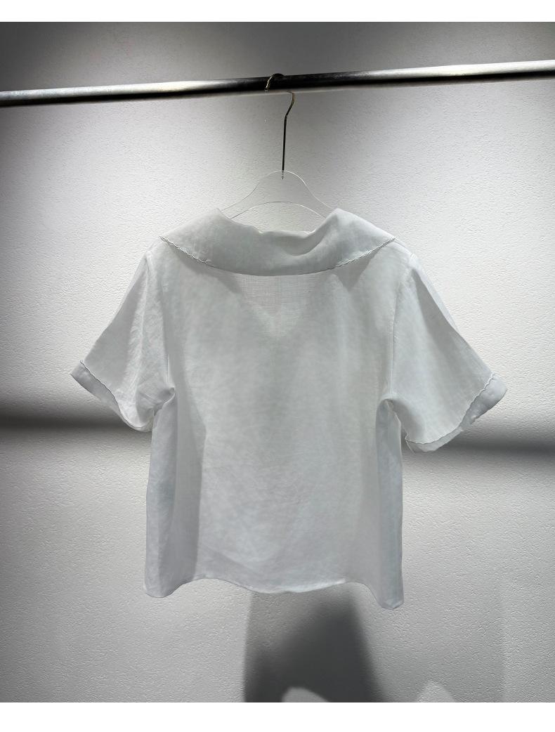 2025 Nuevo Estilo de Verano Blanco Solapa Grande Abotonada Camisa de Manga Corta Top Casual Suelto y Versátil para Mujer