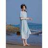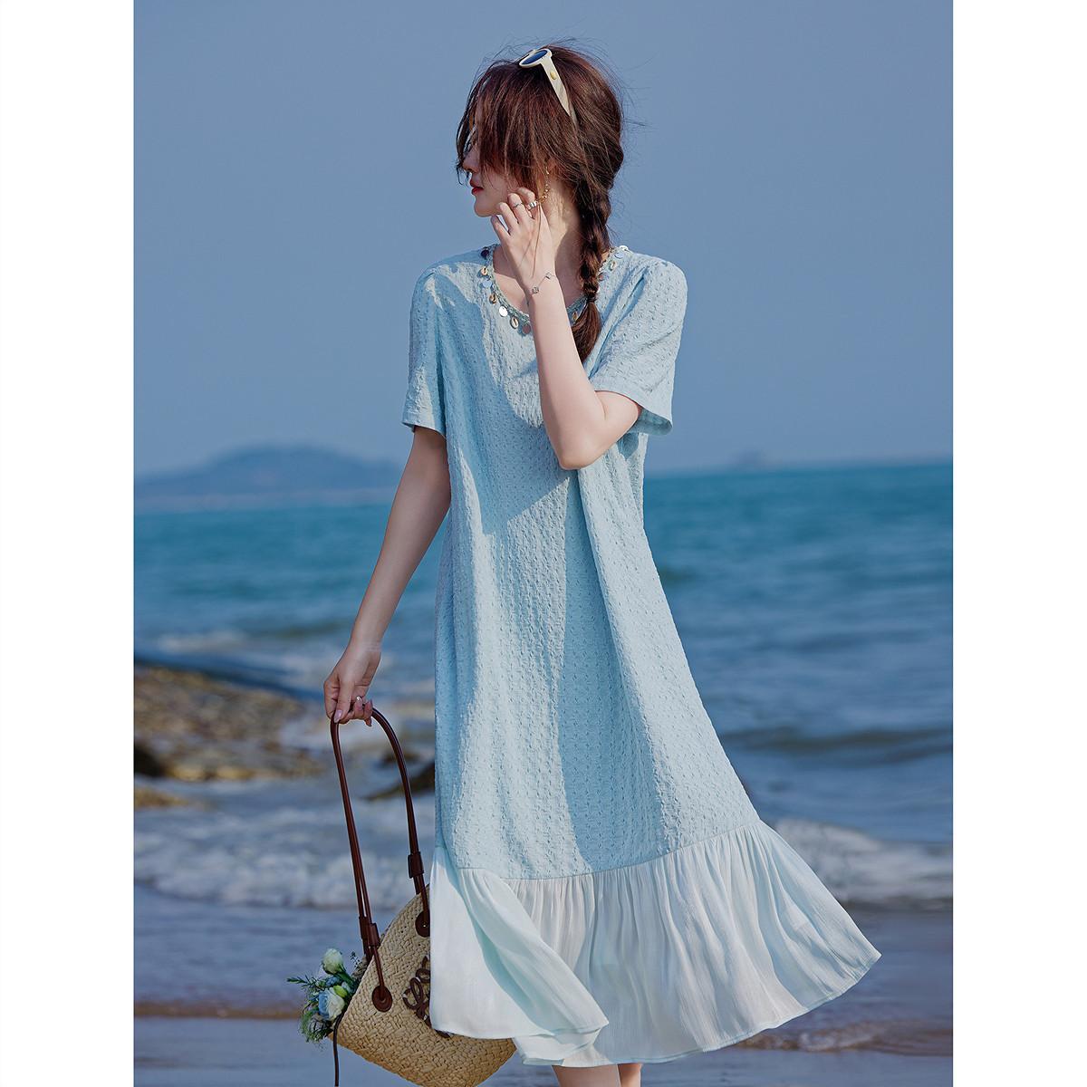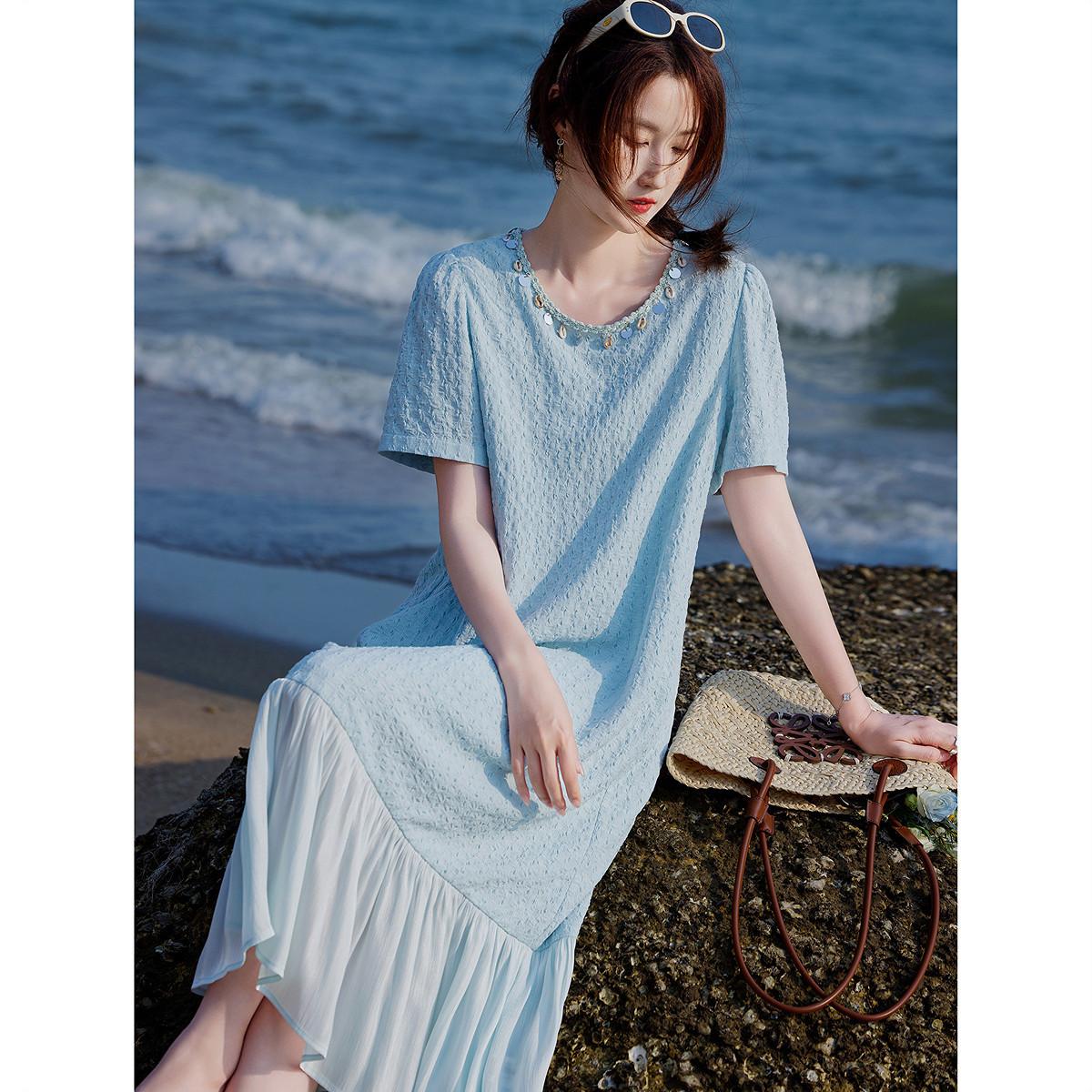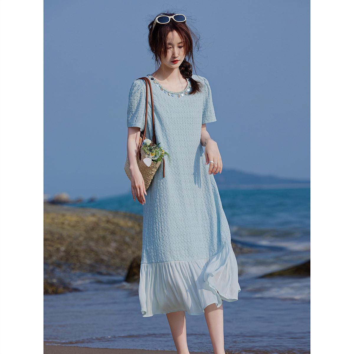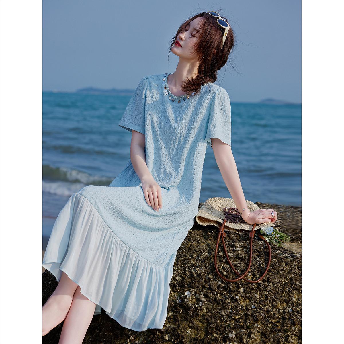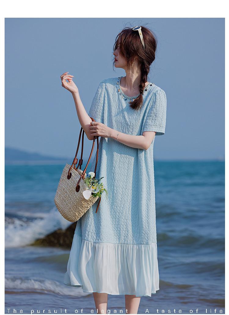 Verano Estilo Francés Pequeño Estilo Chanel Costuras Cuello Redondo Decoración Manga Corta Suelto Falda Recta Larga