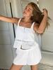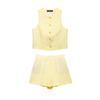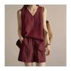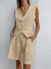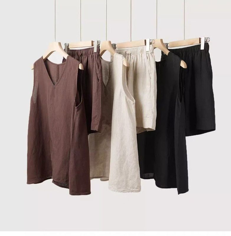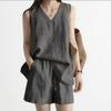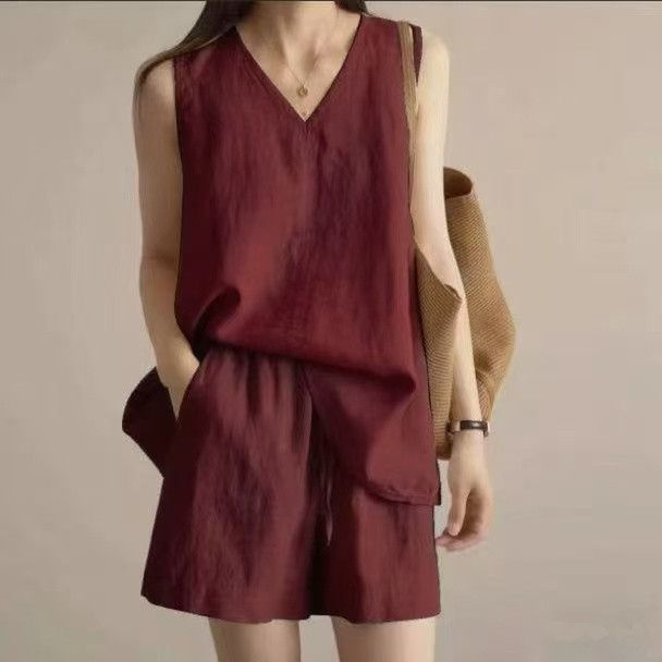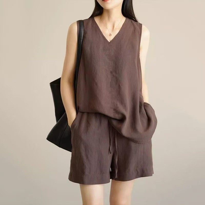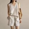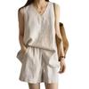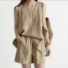 Americano Simple para Mujer Nuevo Estilo Algodón y Lino Modernos Tops sin Mangas Color Sólido Shorts de Cintura Alta Traje Casual de Dos Piezas
