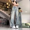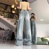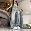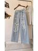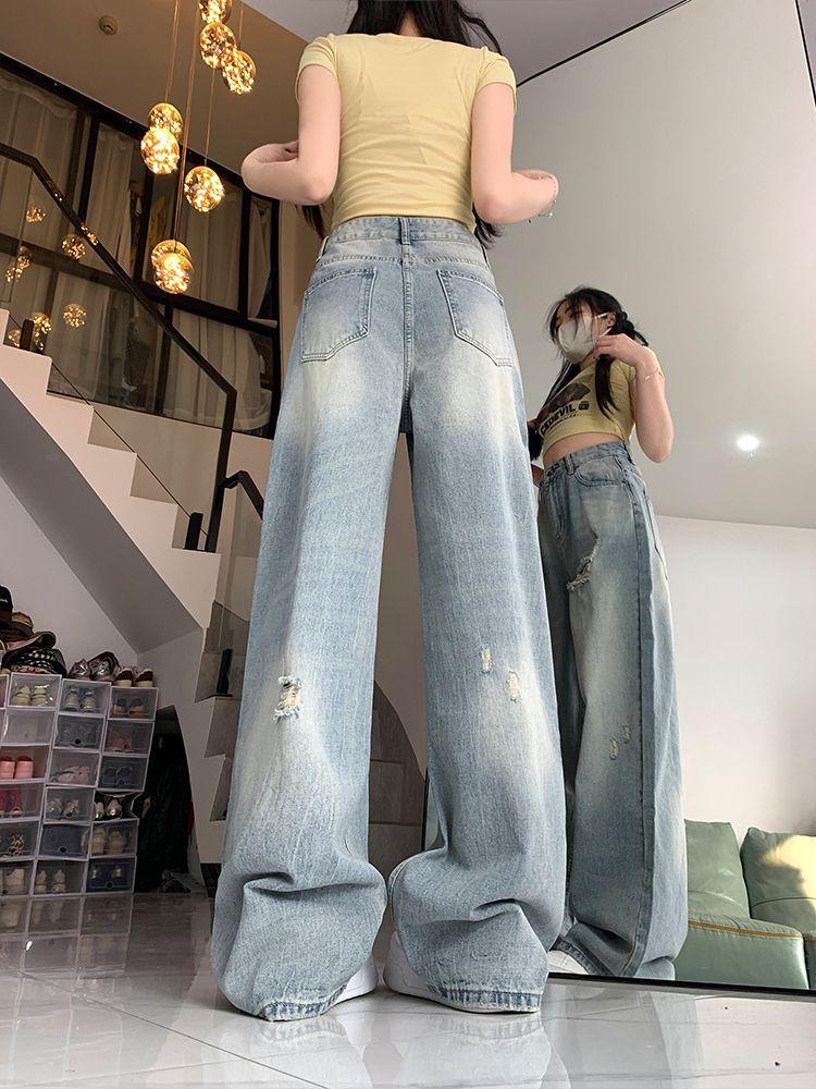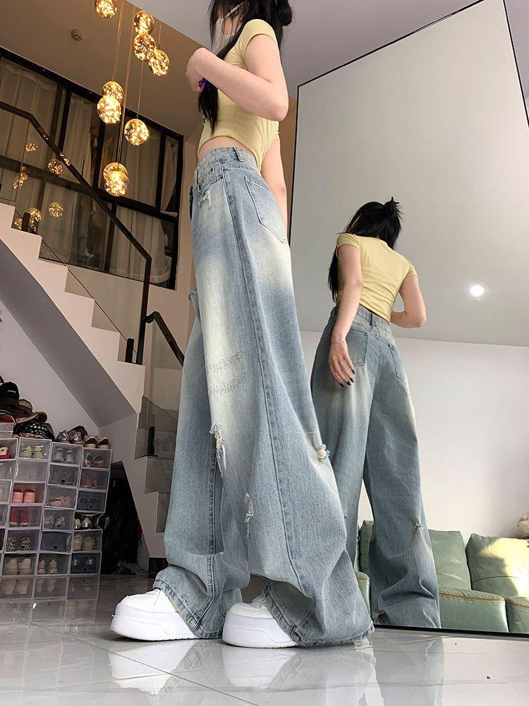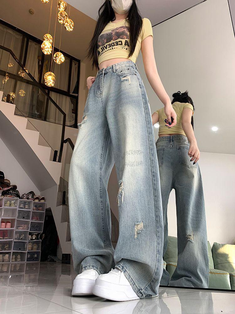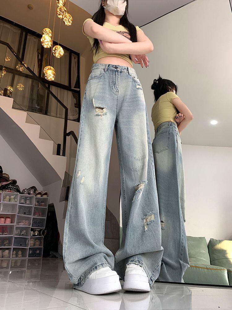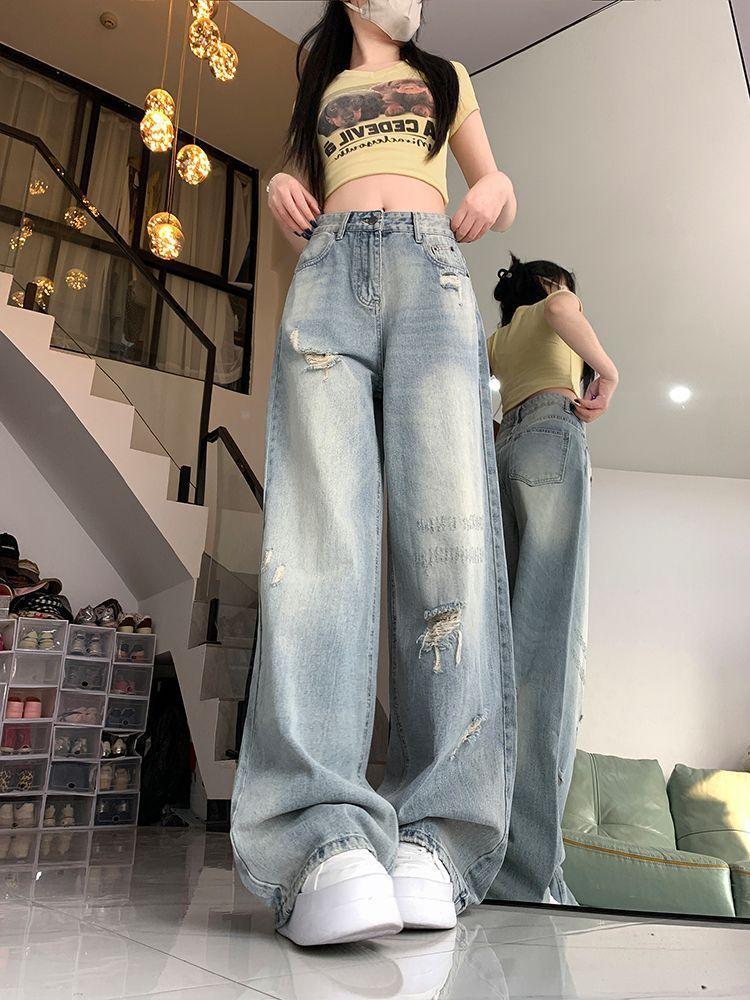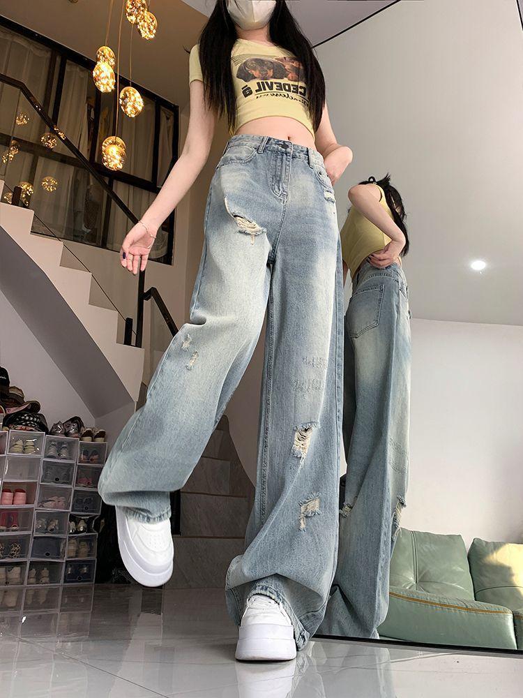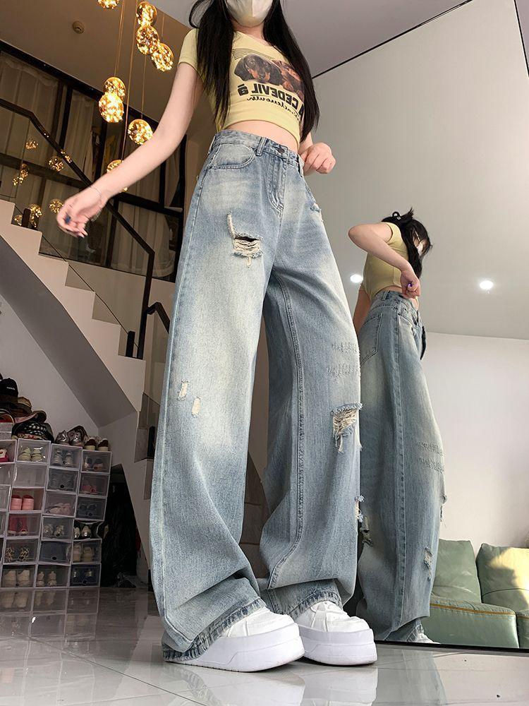 Jeans Rectos Talla Grande Rotos para Mujer 2025 Nuevo Verano Delgados Estilo Americano Largo Hasta el Piso Petite Pantalones de Pierna Ancha