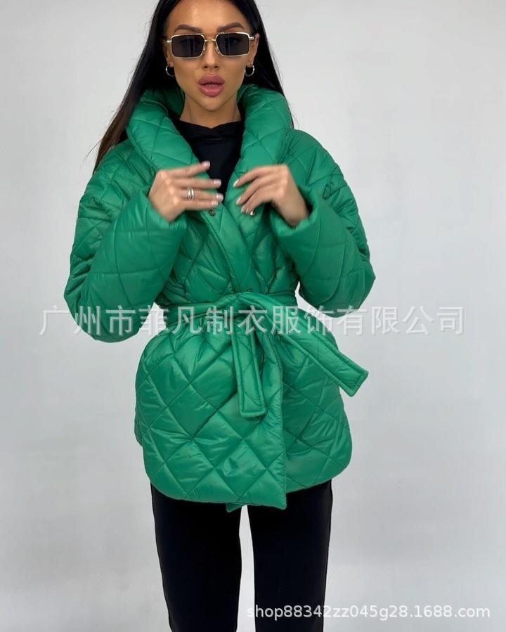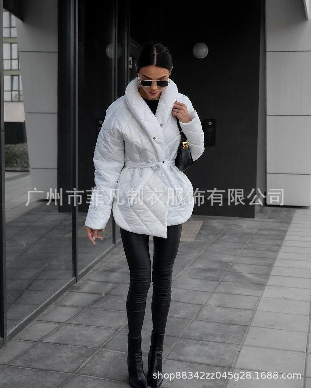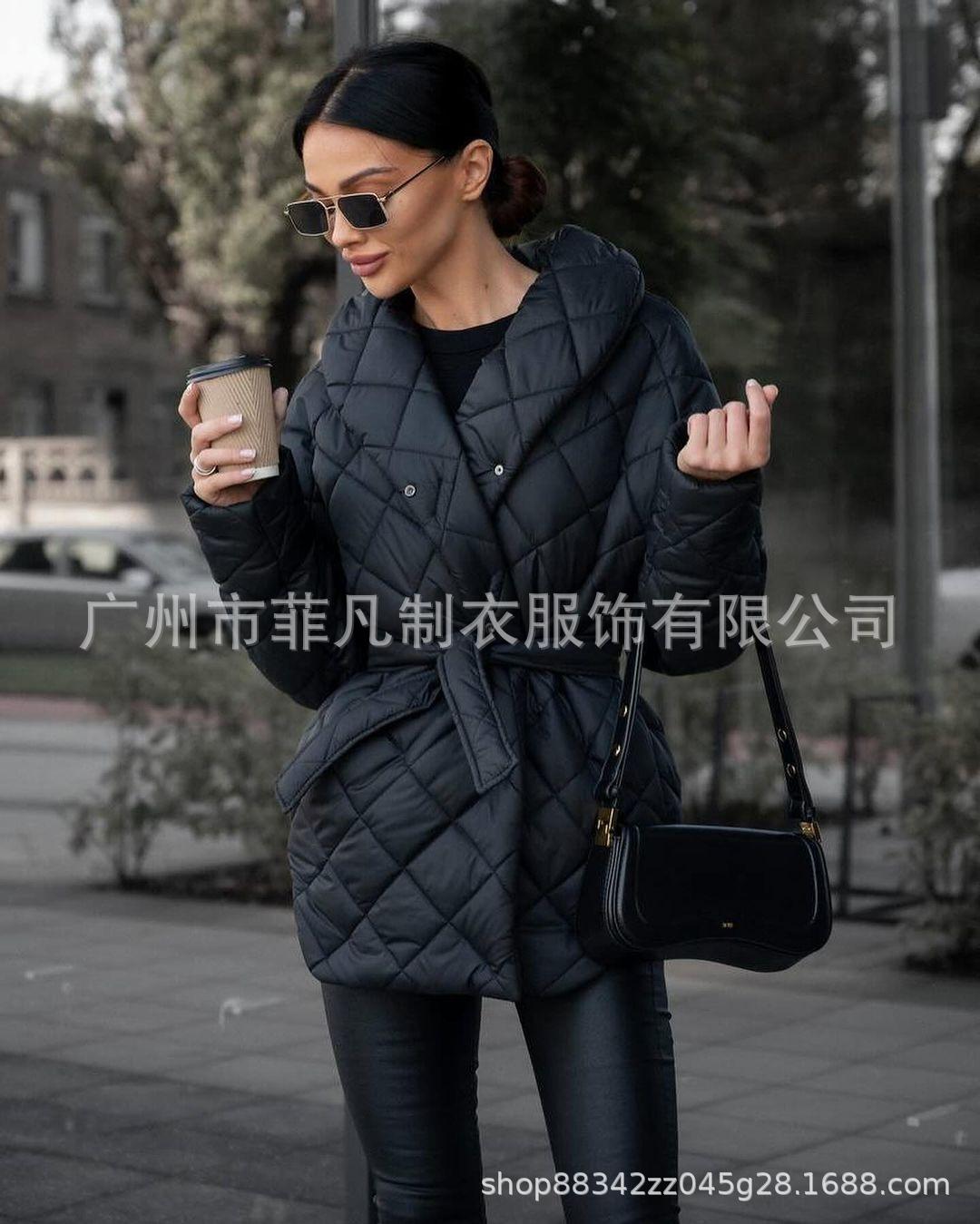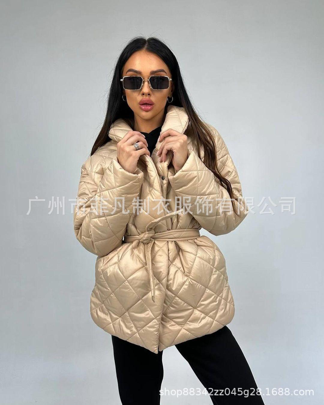 Abrigo de Algodón con Solapa de Cuadros Diamante Transfronterizo Europeo y Americano Amazon 2025 Chaqueta de Moda con Cinturón para Mujer