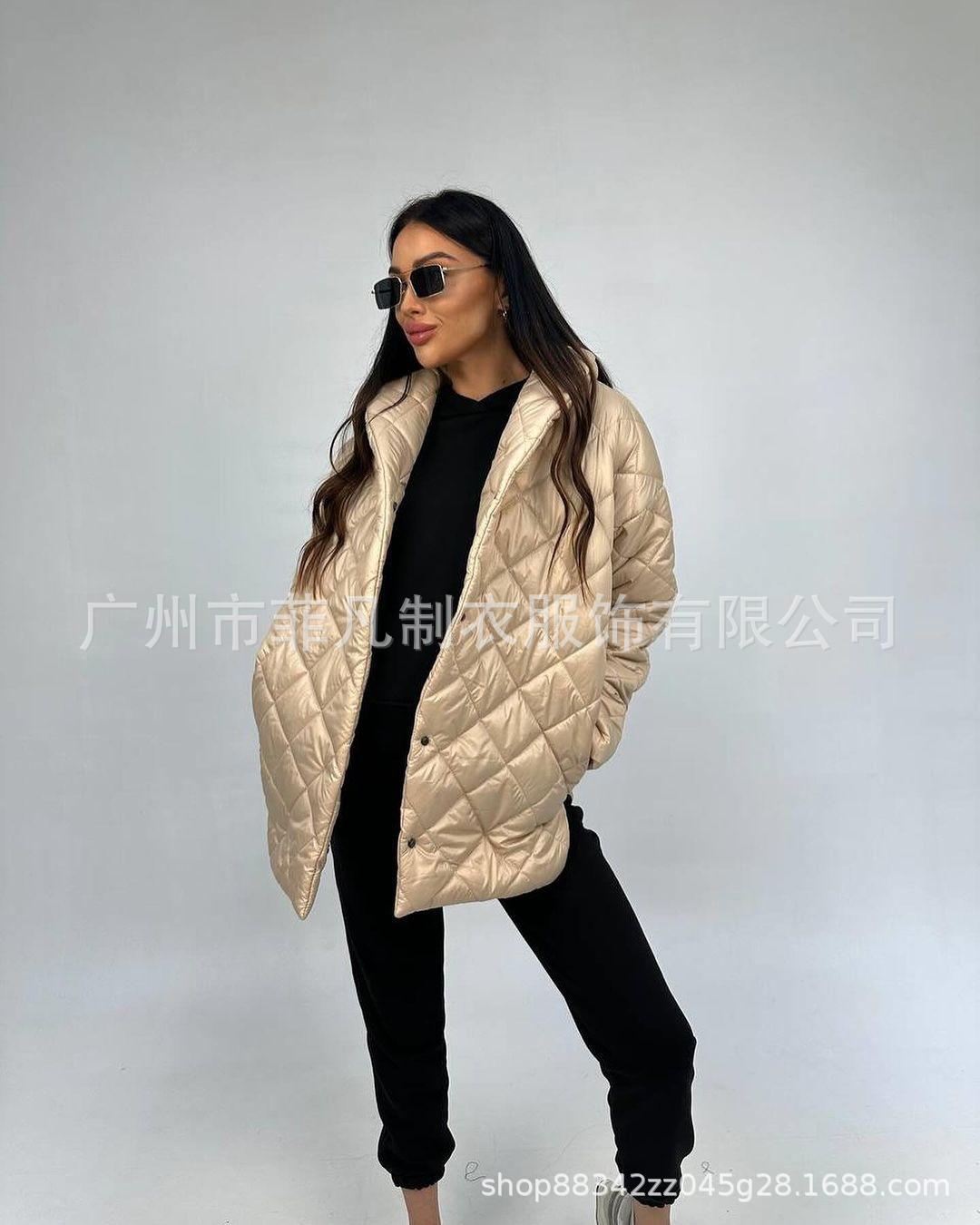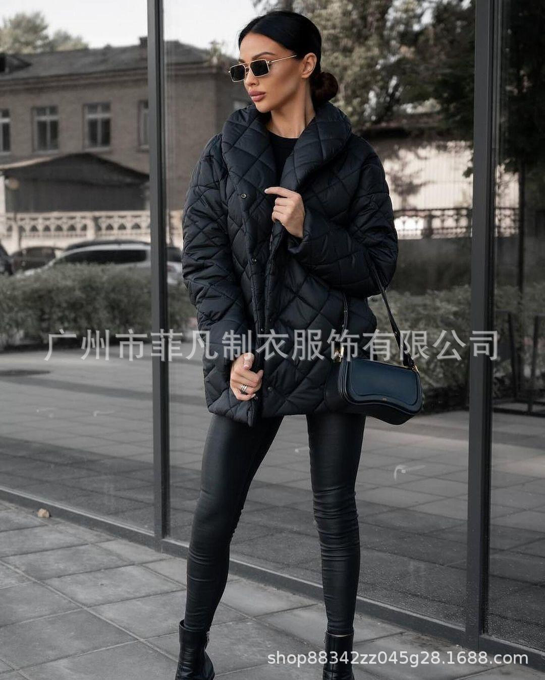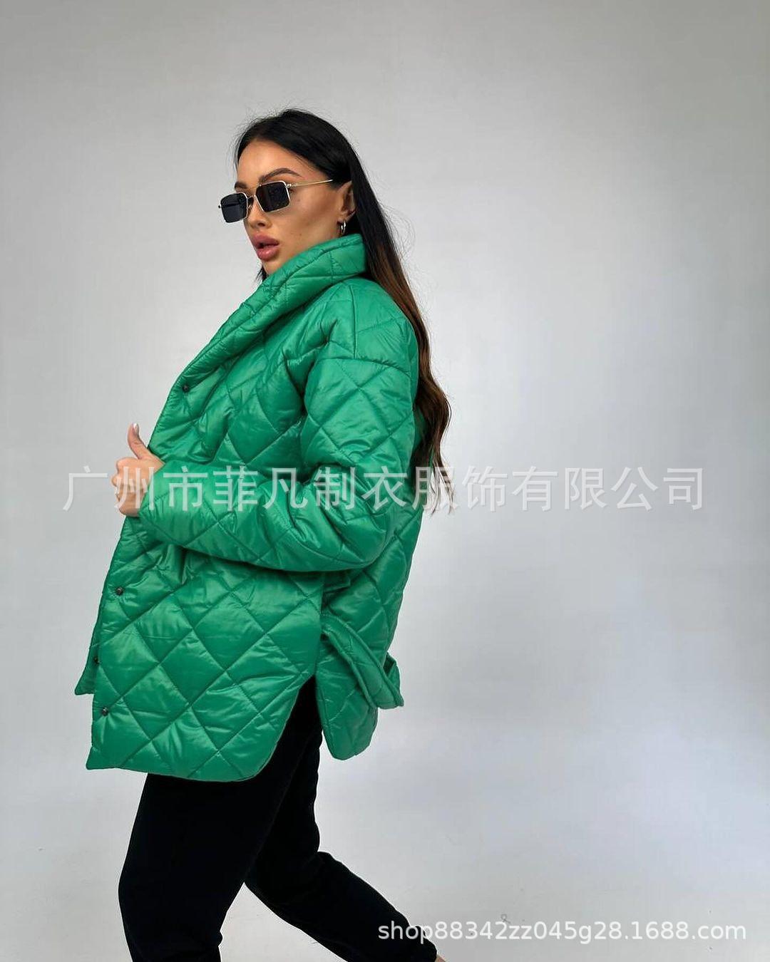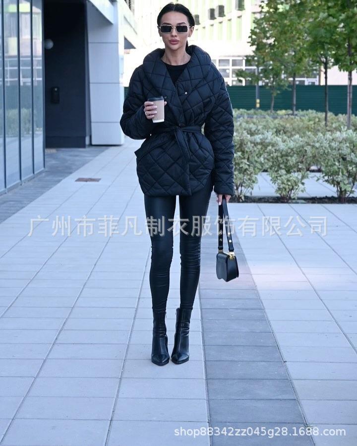 Abrigo de Algodón con Solapa de Cuadros Diamante Transfronterizo Europeo y Americano Amazon 2025 Chaqueta de Moda con Cinturón para Mujer