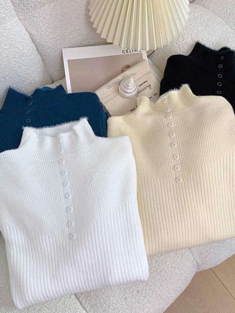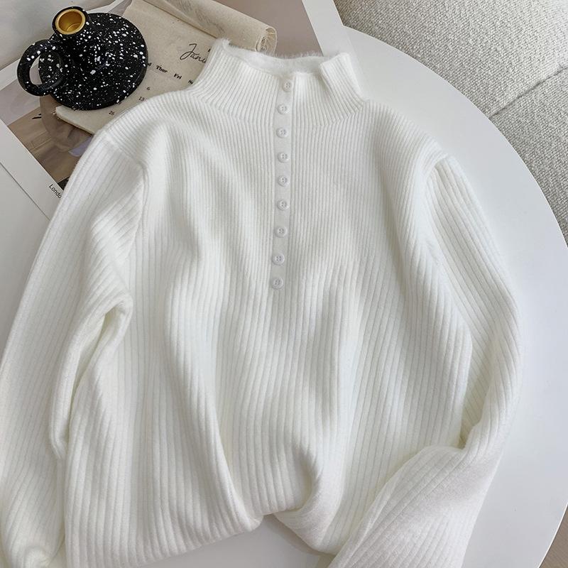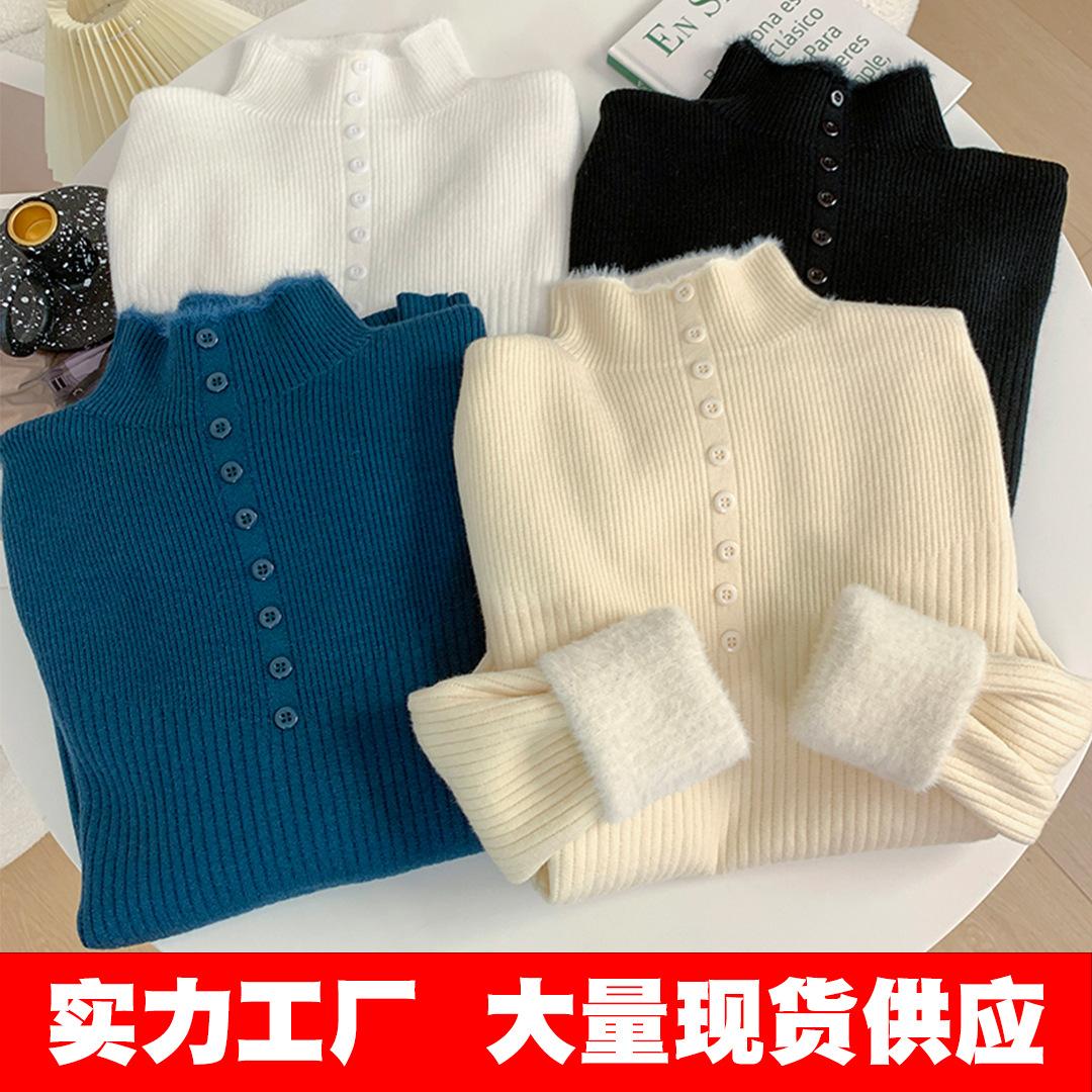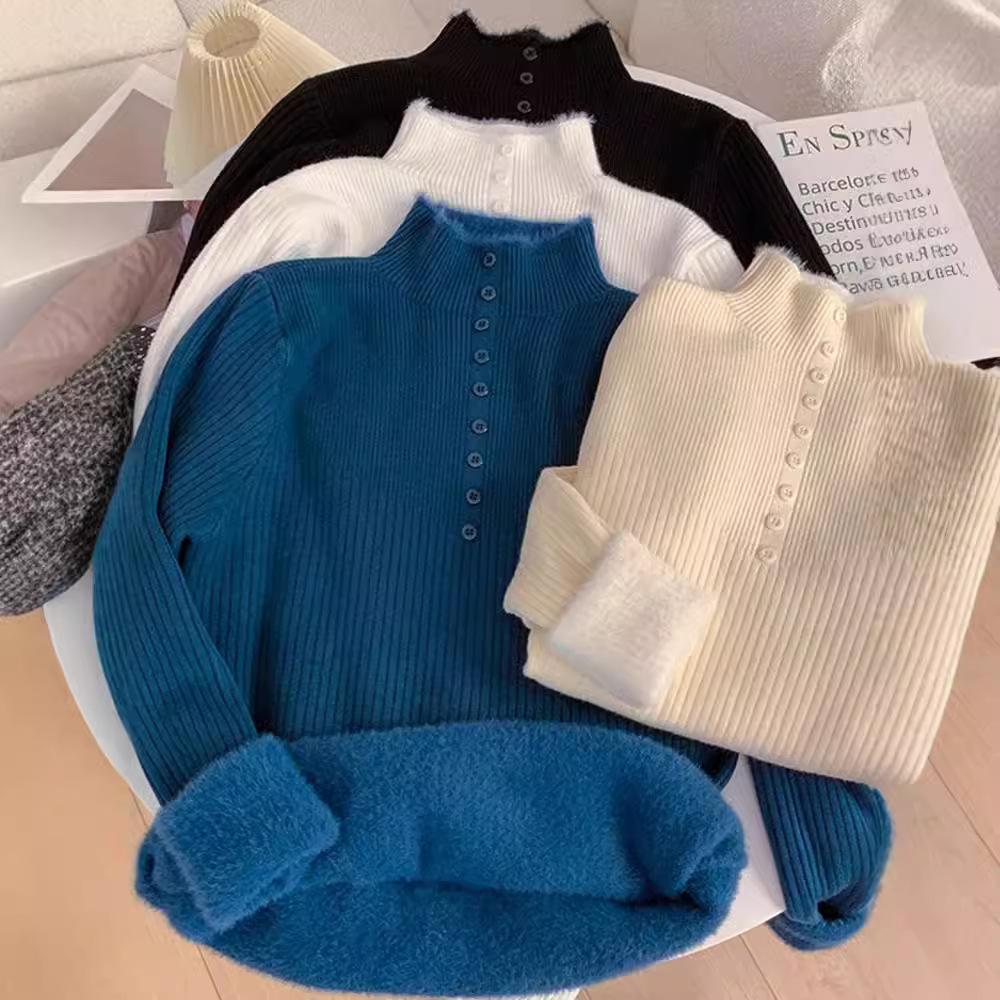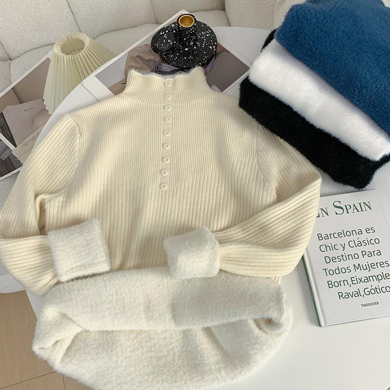 Tejido de Terciopelo de Una Pieza Cuello Medio Alto Manga Larga Tejido de Punto Otoño e Invierno Estilo Coreano Terciopelo Grueso Camiseta Top para Fondo