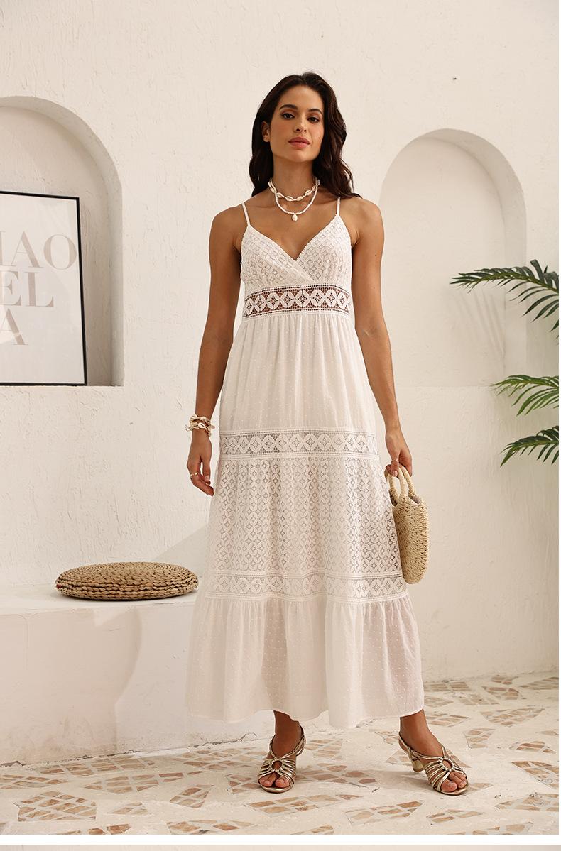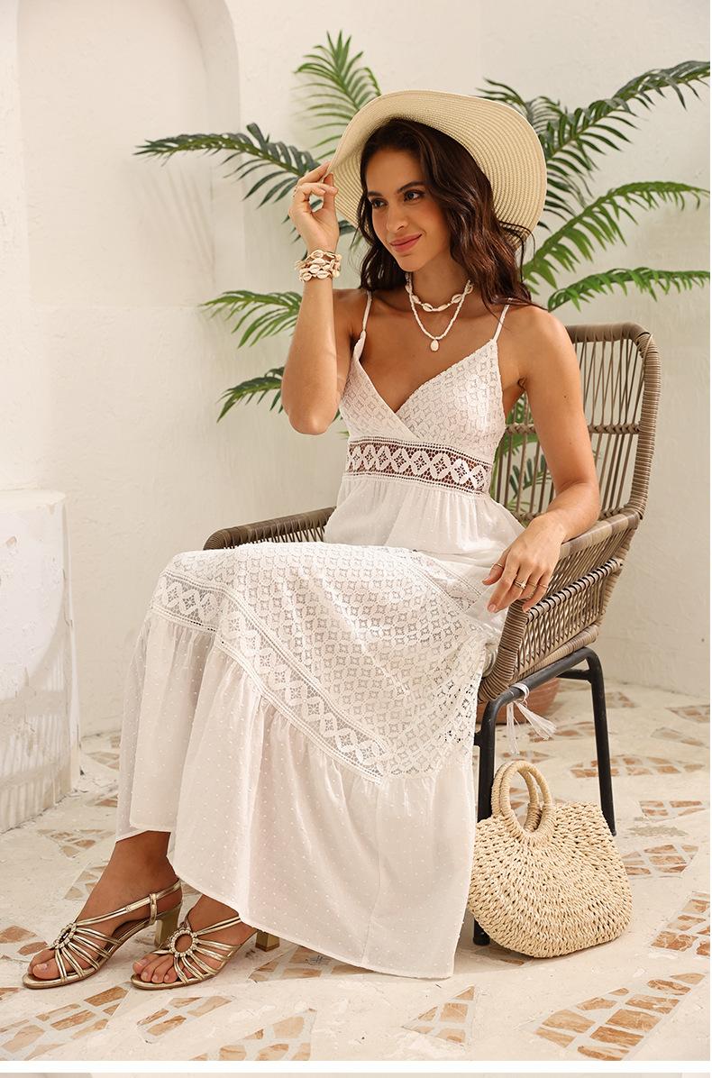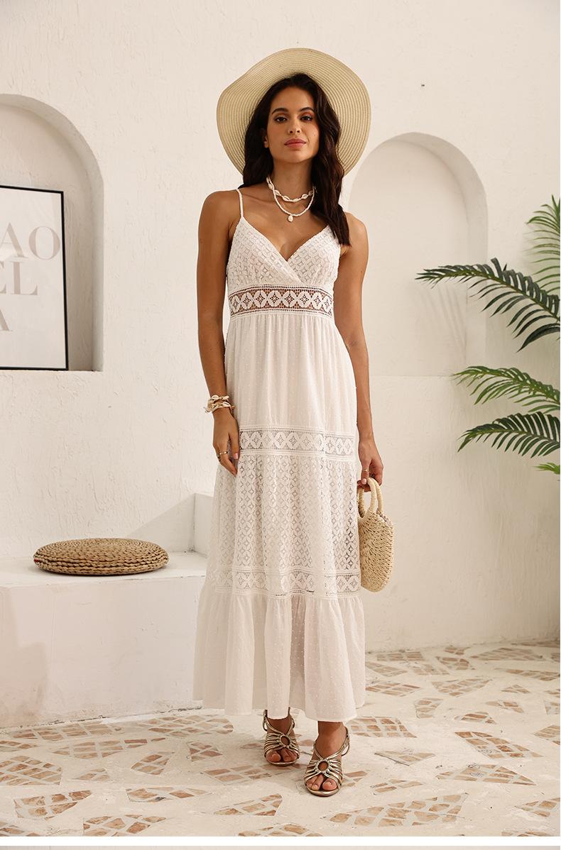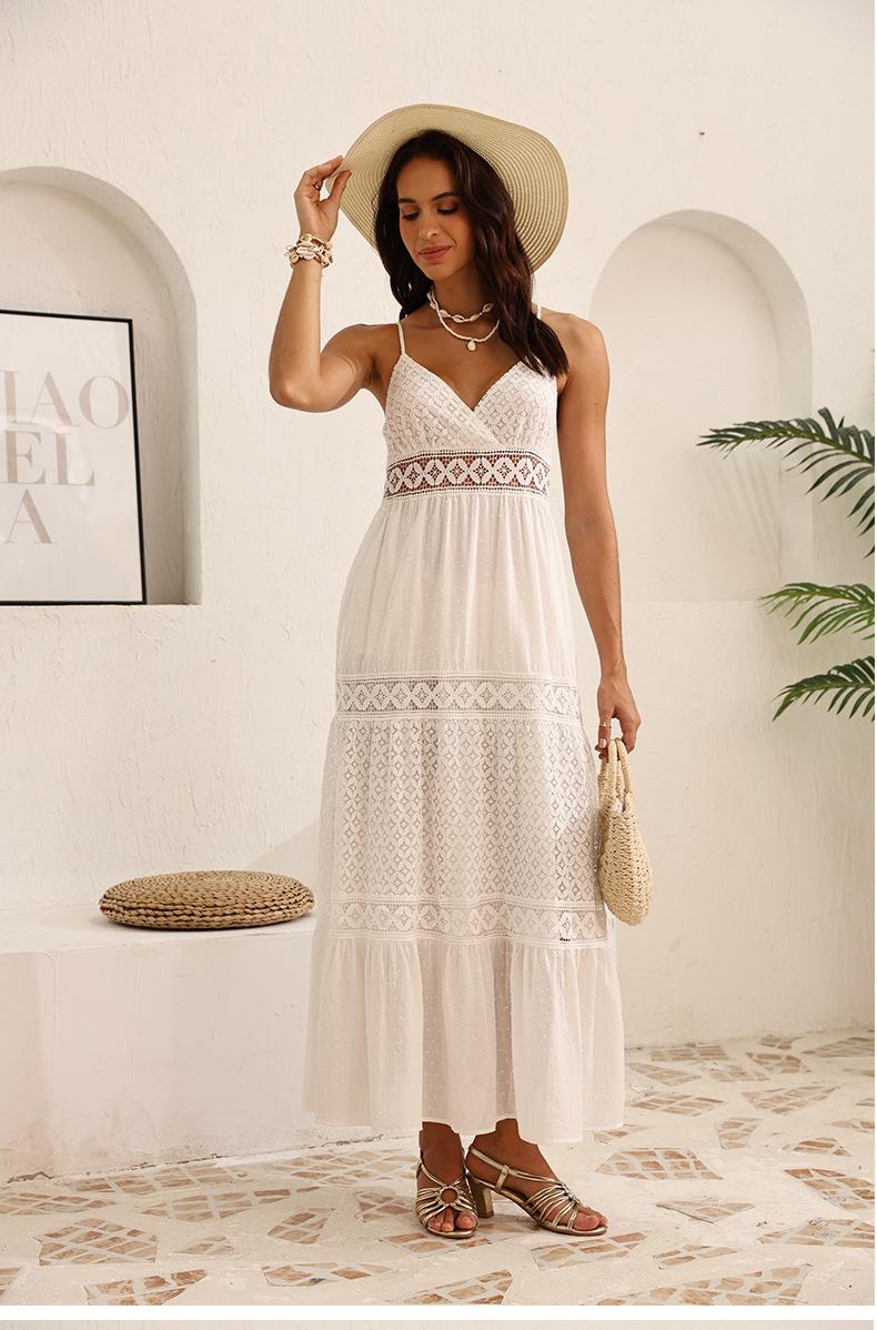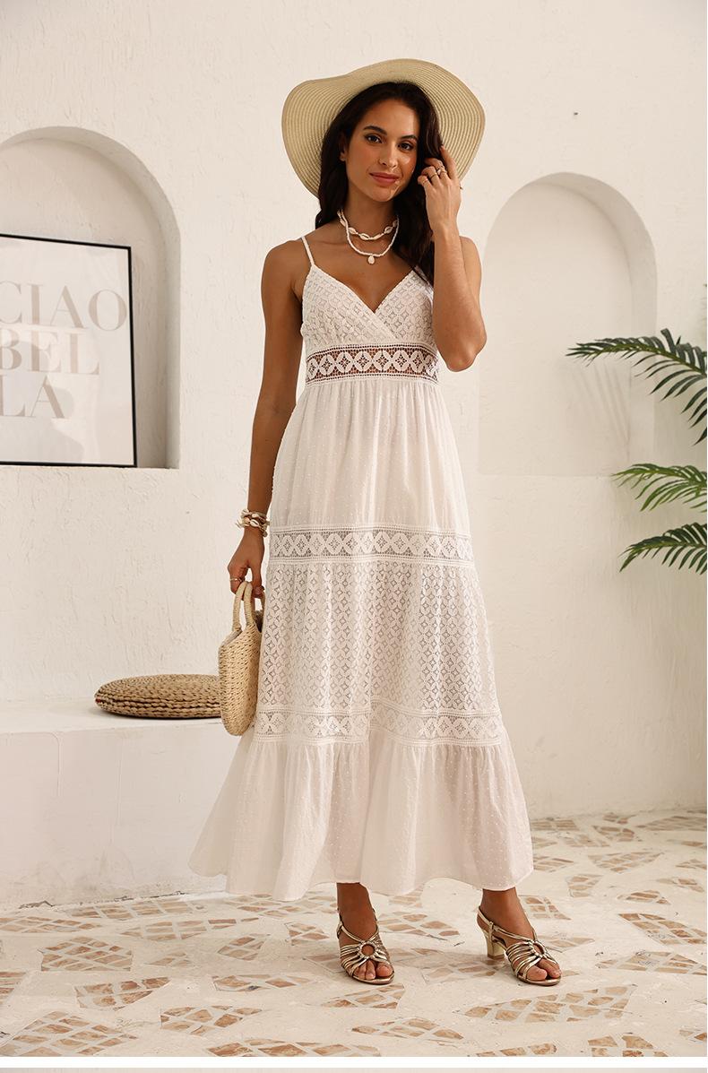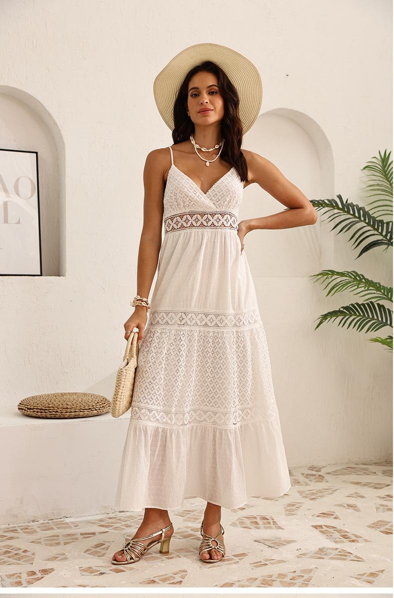 25 Nuevo Verano Francés Tirantes Cuello en V Cintura Alta Vestido Largo Vacaciones Europeas y Americanas Vestido de Playa Entallado Hueco Vestido Largo