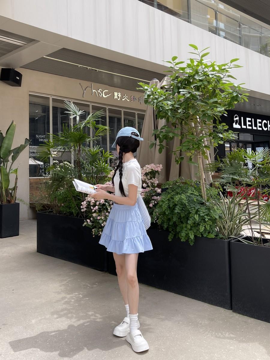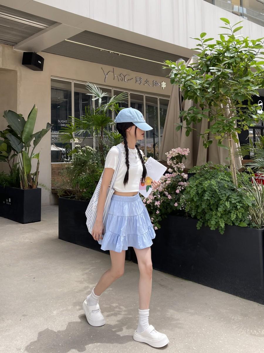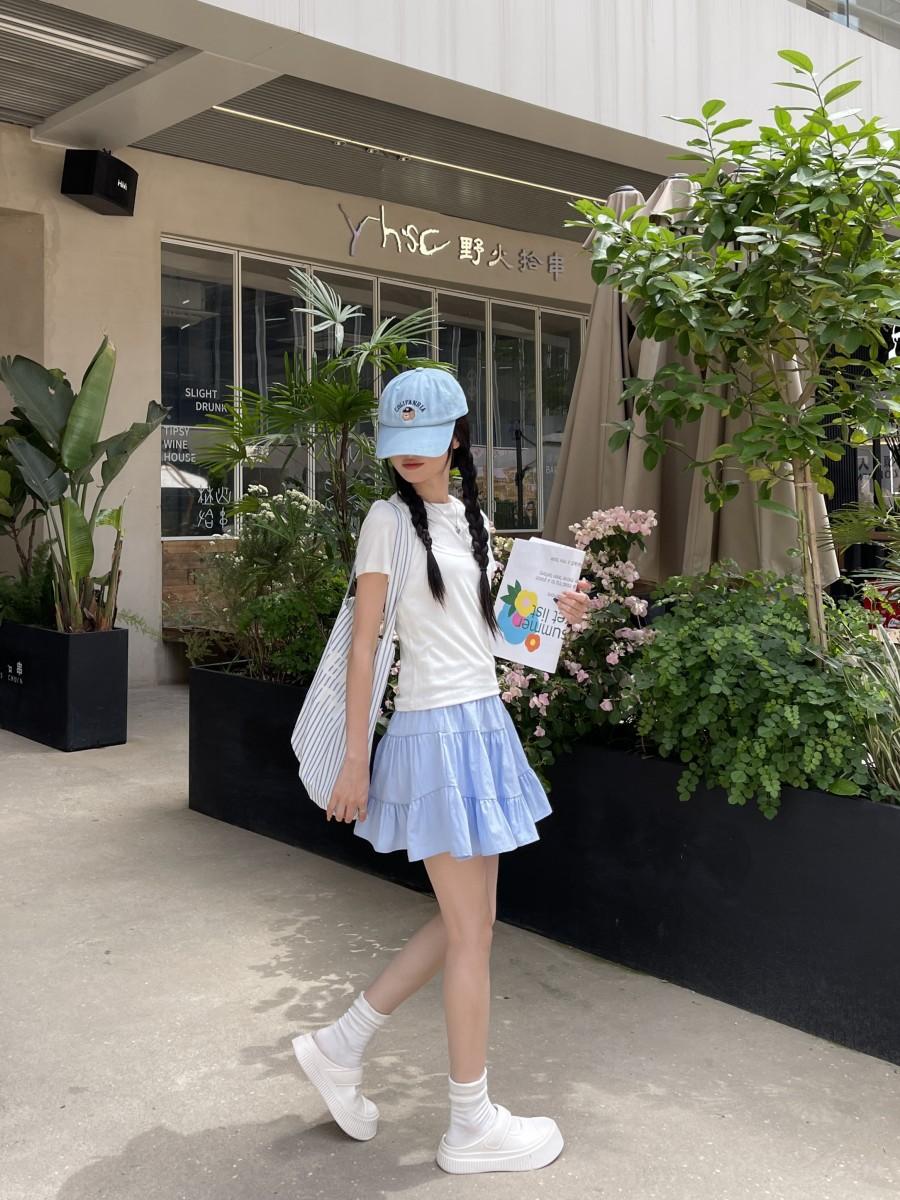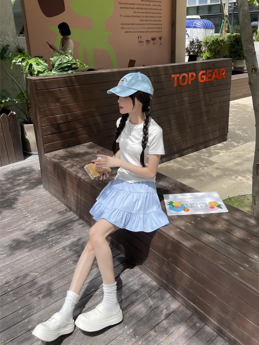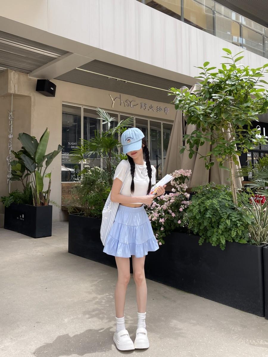 Falda Azul de Cintura Alta para Mujer Corte A Anti-Exposición Primavera y Verano Estilo Preppy Sencilla Plisada Casual Pastel Falda Corta