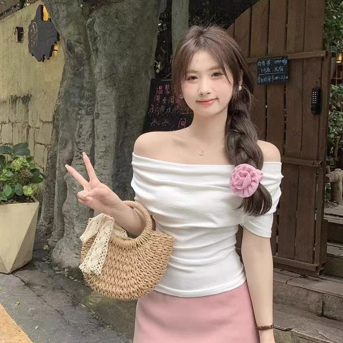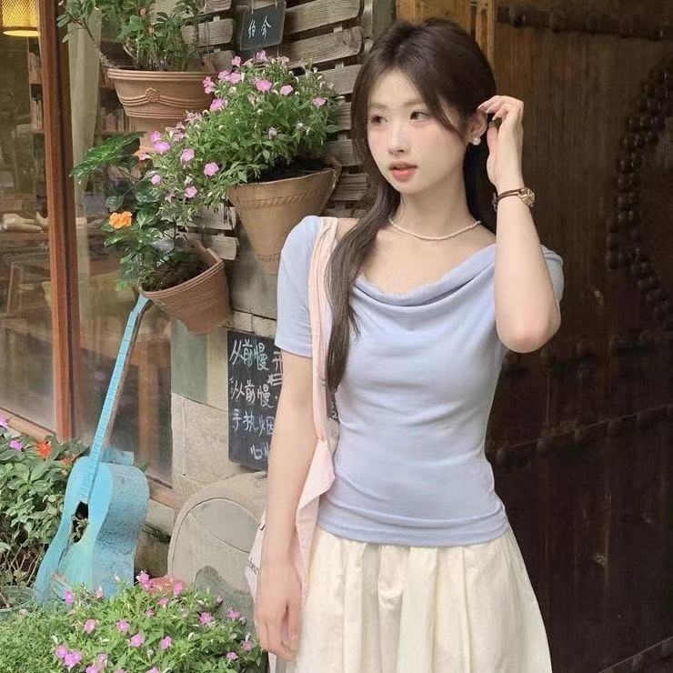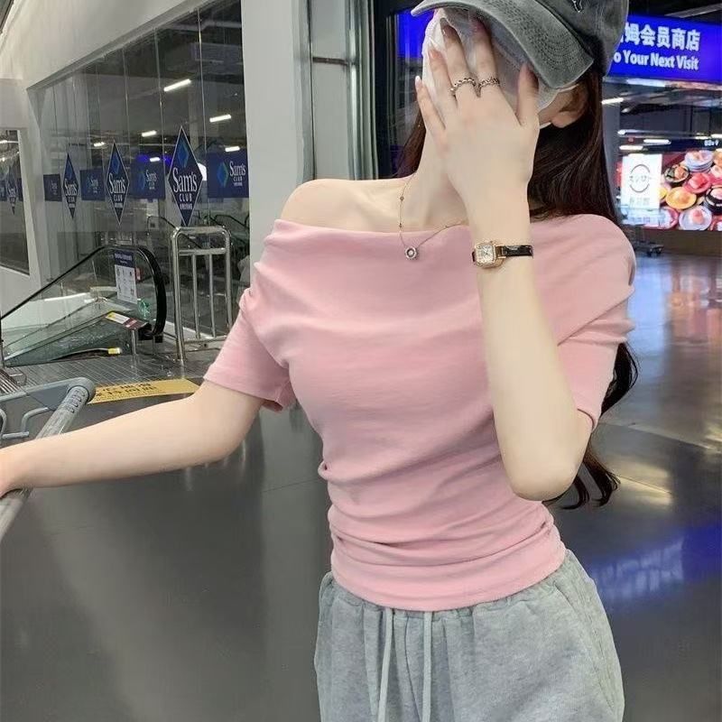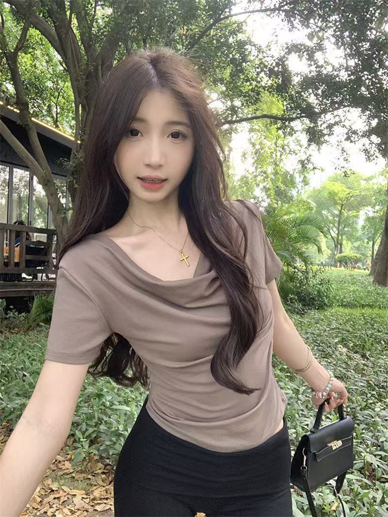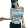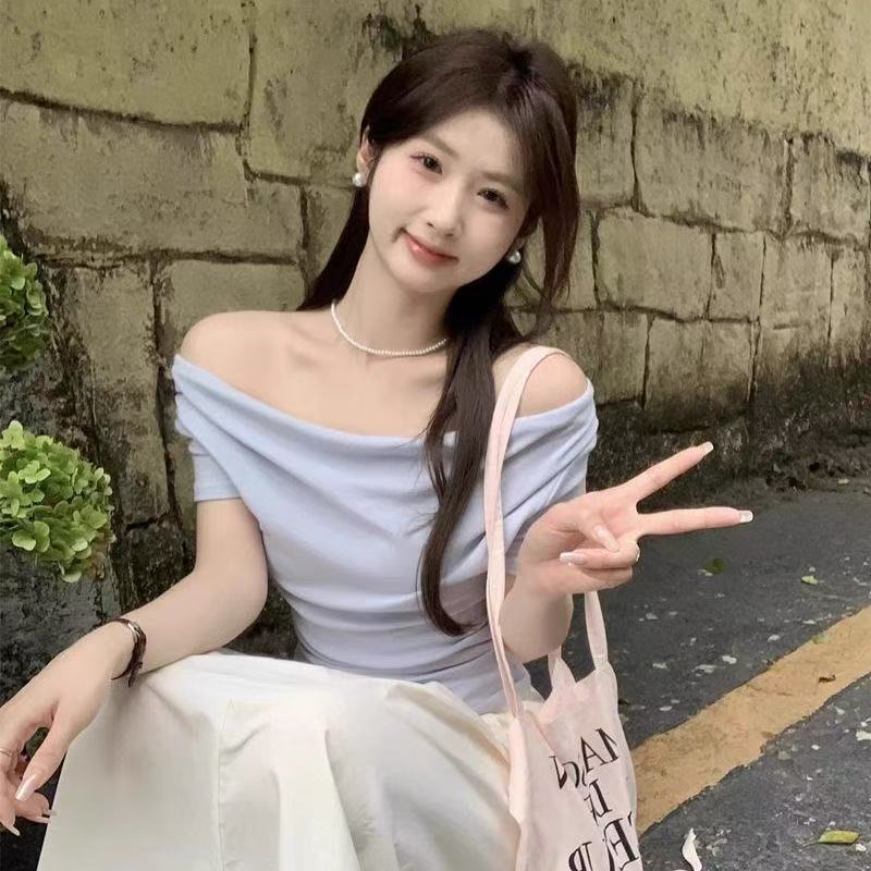Playera de un hombro estilo francés dulce y picante para mujer, verano, plisada, look adelgazante, top corto