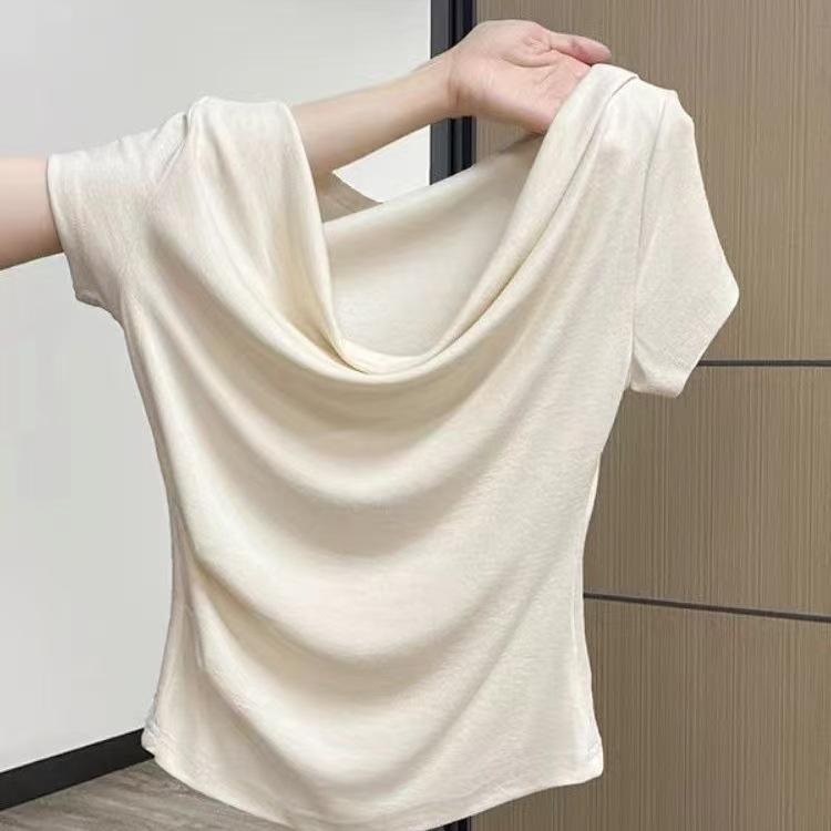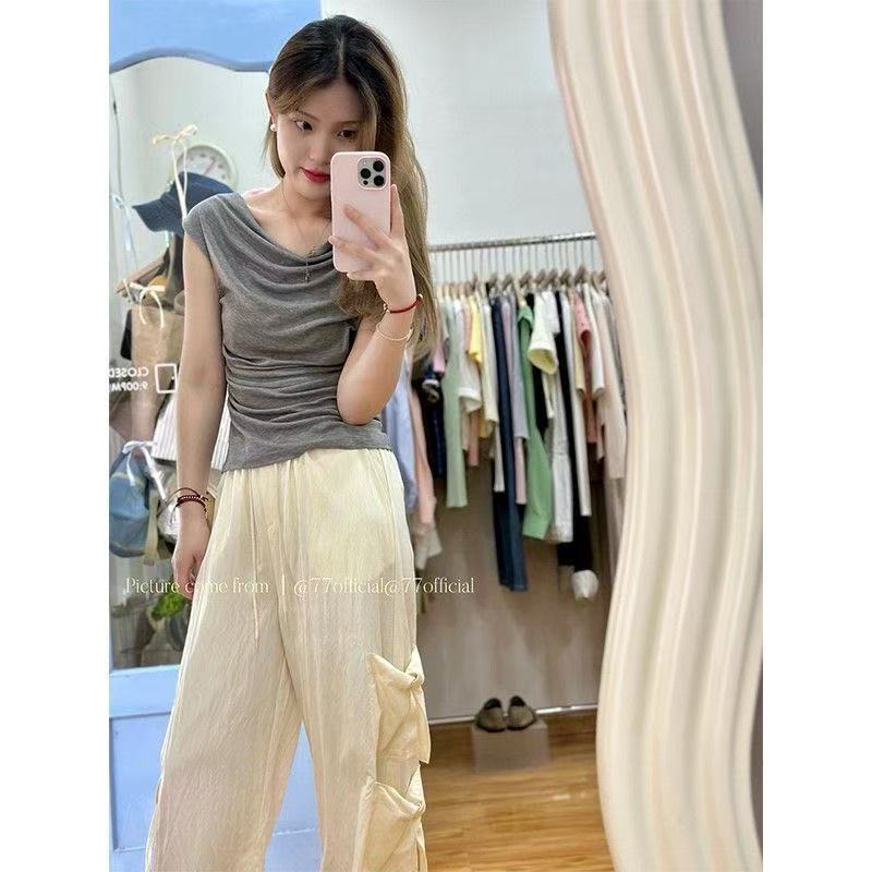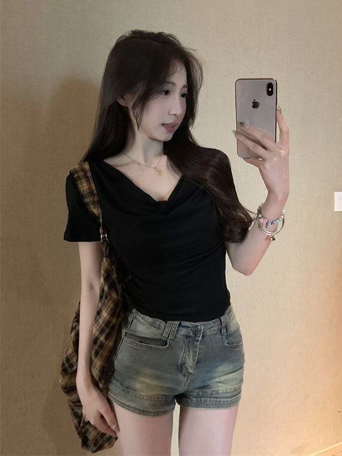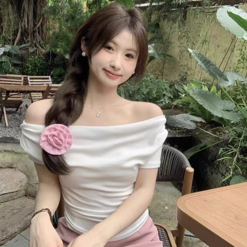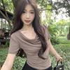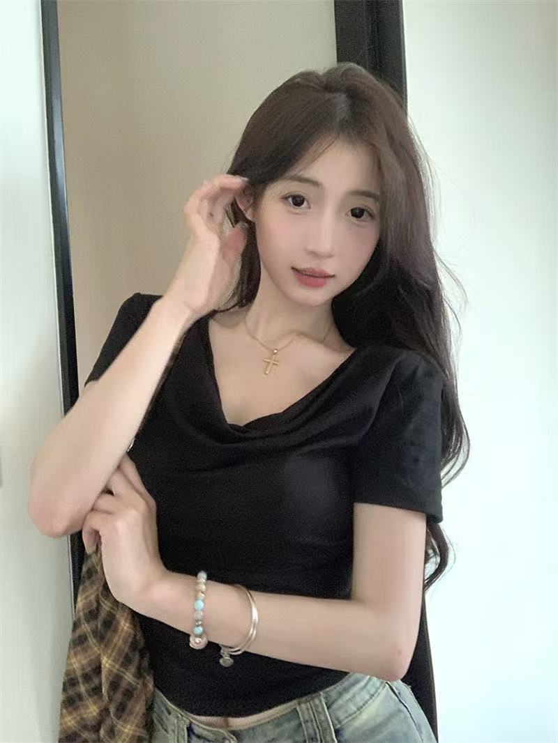 Playera de un hombro estilo francés dulce y picante para mujer, verano, plisada, look adelgazante, top corto