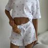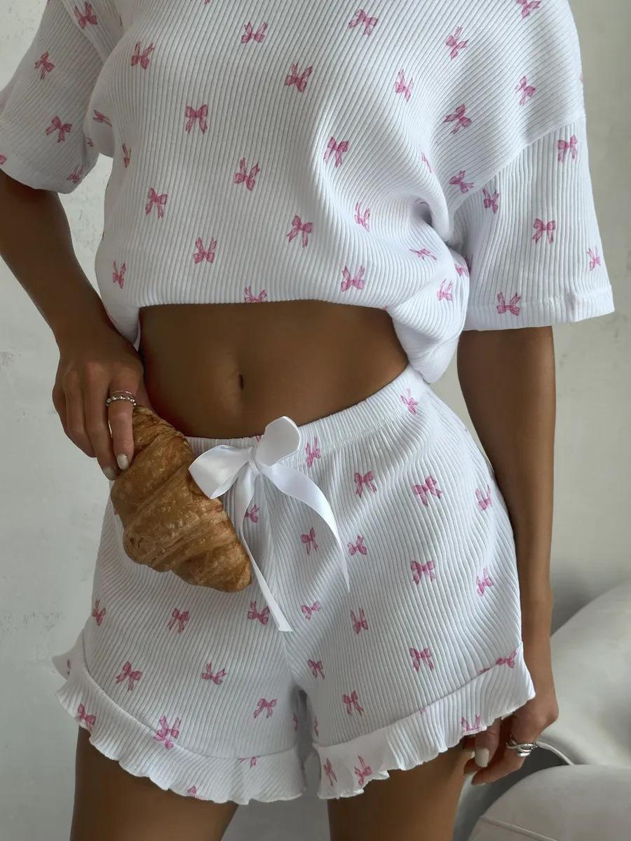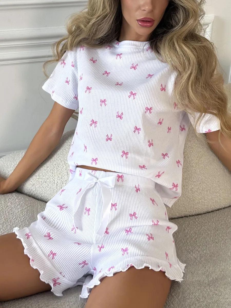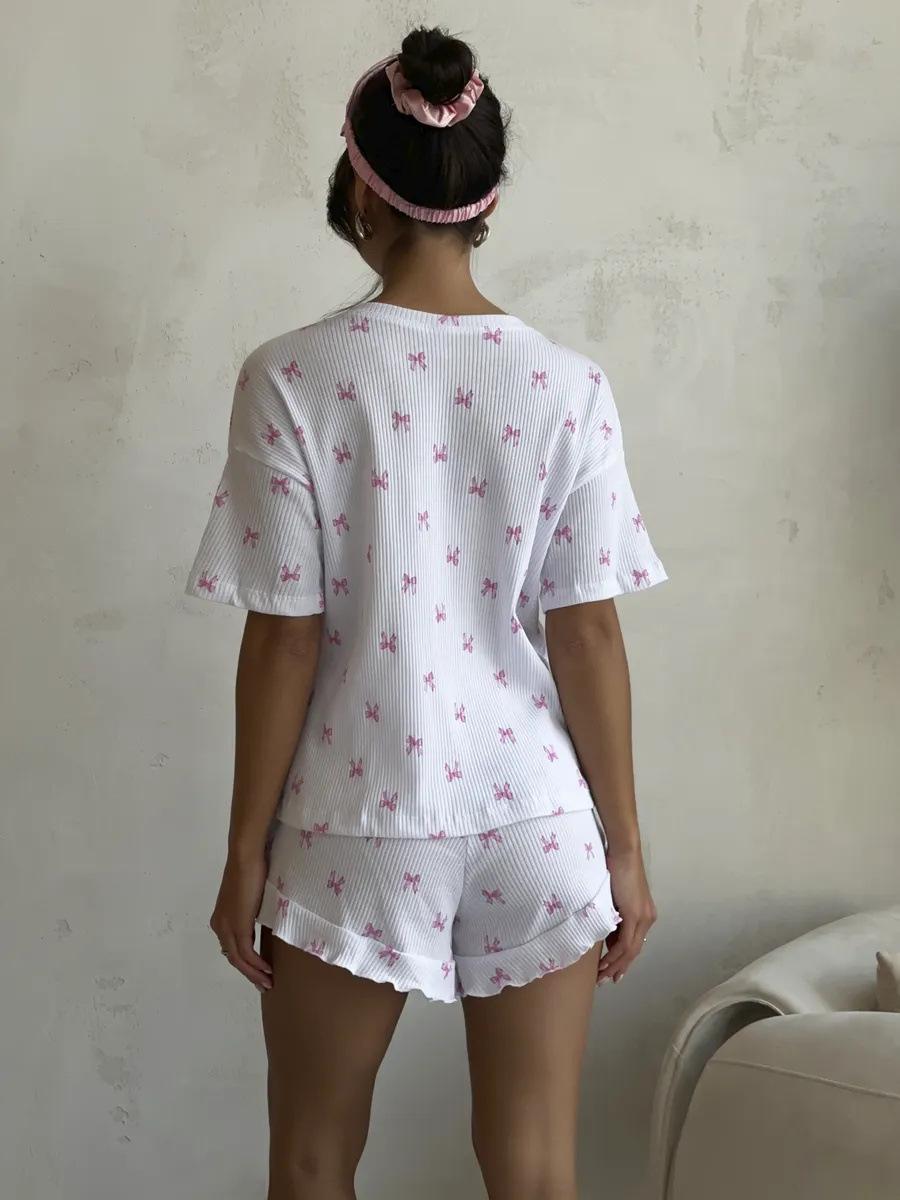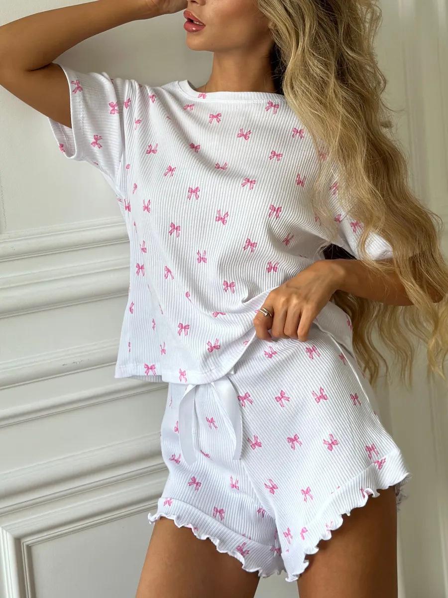 Moda de Verano para Mujer Transfronteriza Europea y Americana Estampado de Lazo Cuello Redondo Jersey Top Shorts Conjunto de Pijama para Casa para Mujer