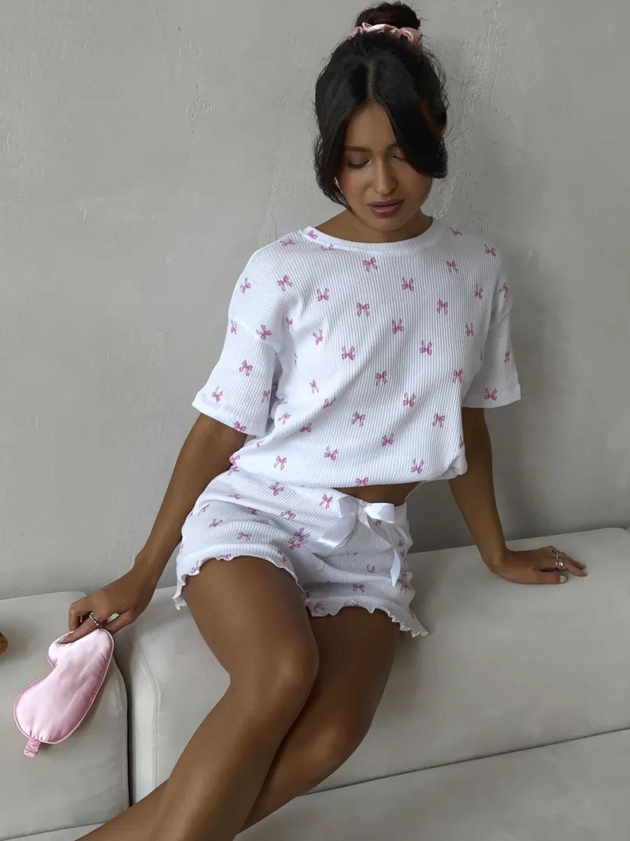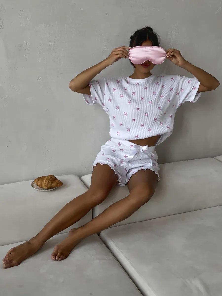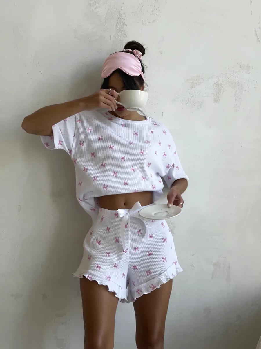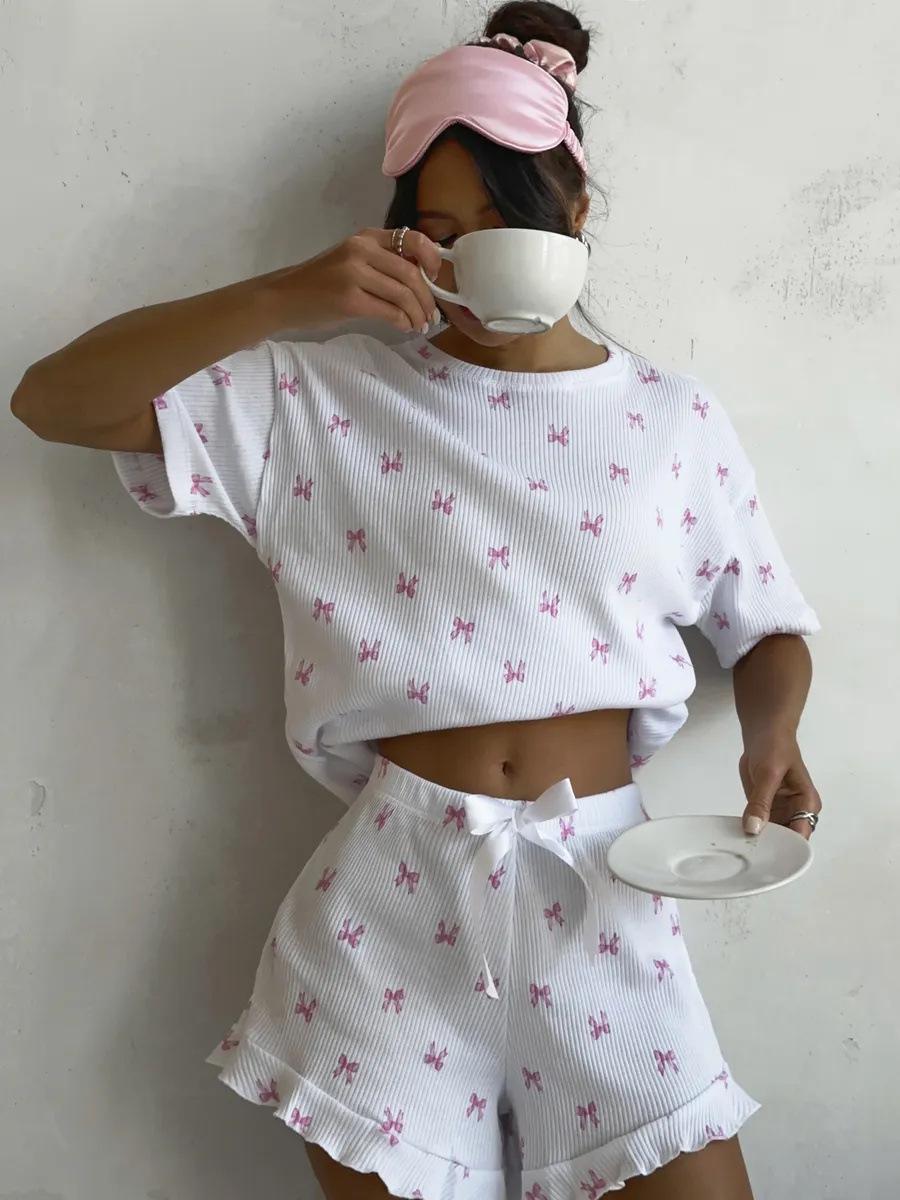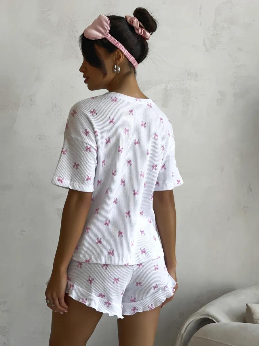 Moda de Verano para Mujer Transfronteriza Europea y Americana Estampado de Lazo Cuello Redondo Jersey Top Shorts Conjunto de Pijama para Casa para Mujer