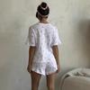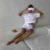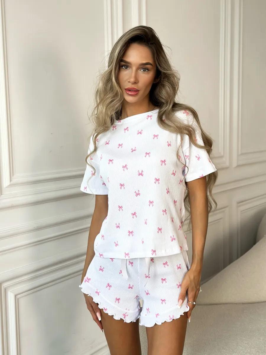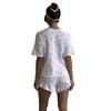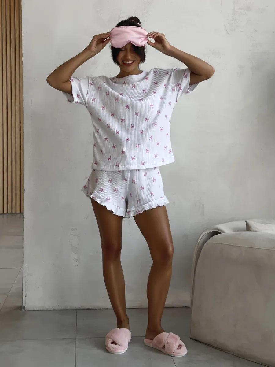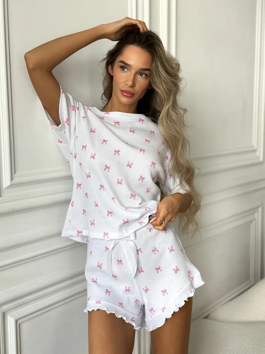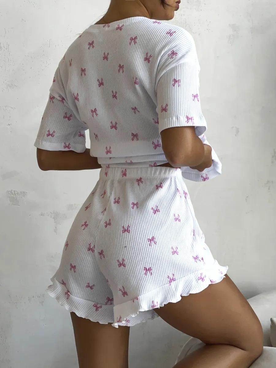 Moda de Verano para Mujer Transfronteriza Europea y Americana Estampado de Lazo Cuello Redondo Jersey Top Shorts Conjunto de Pijama para Casa para Mujer