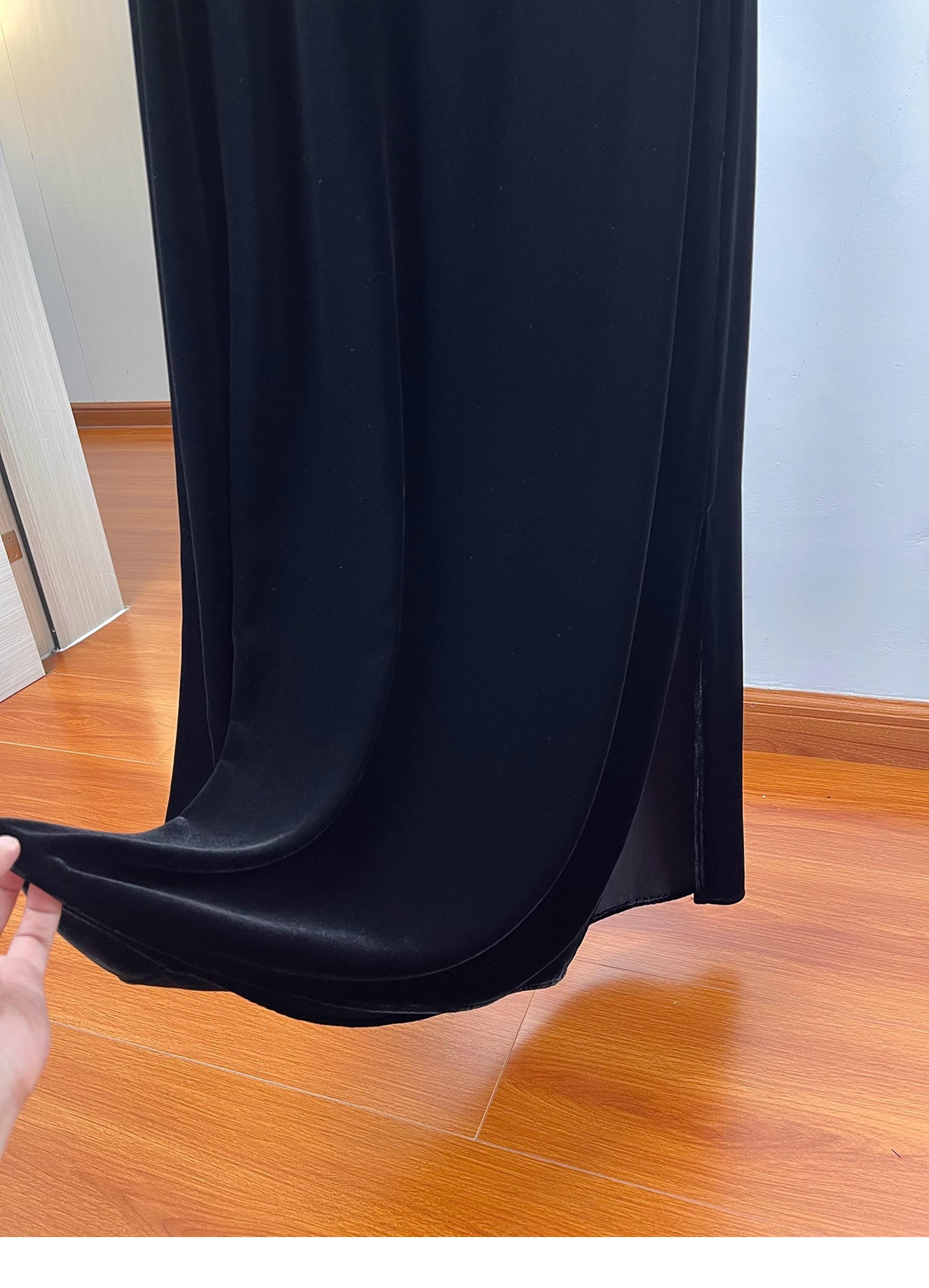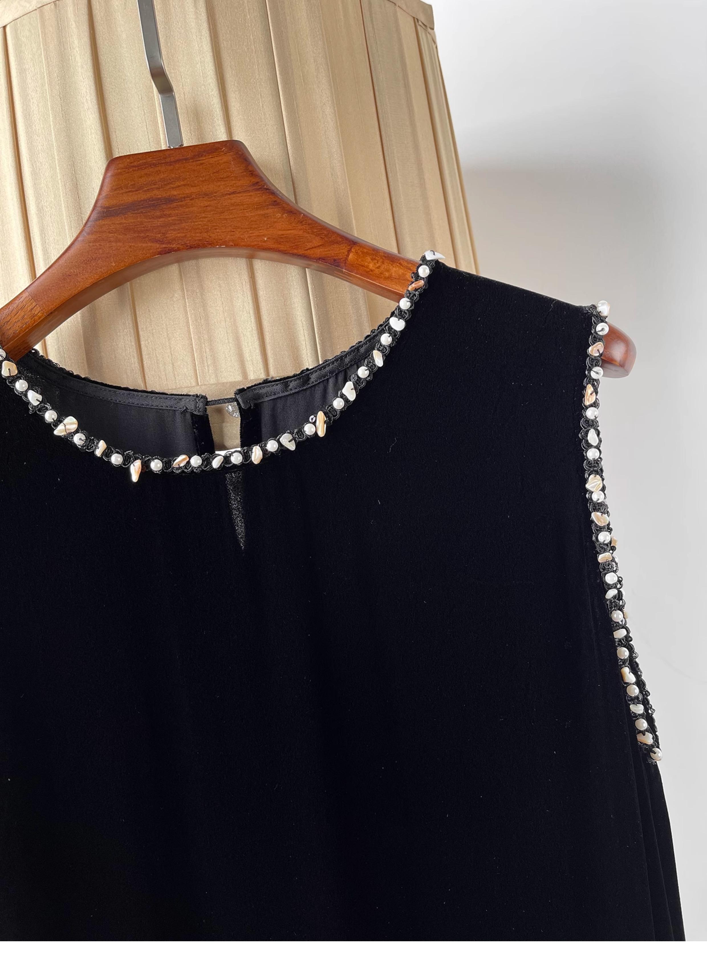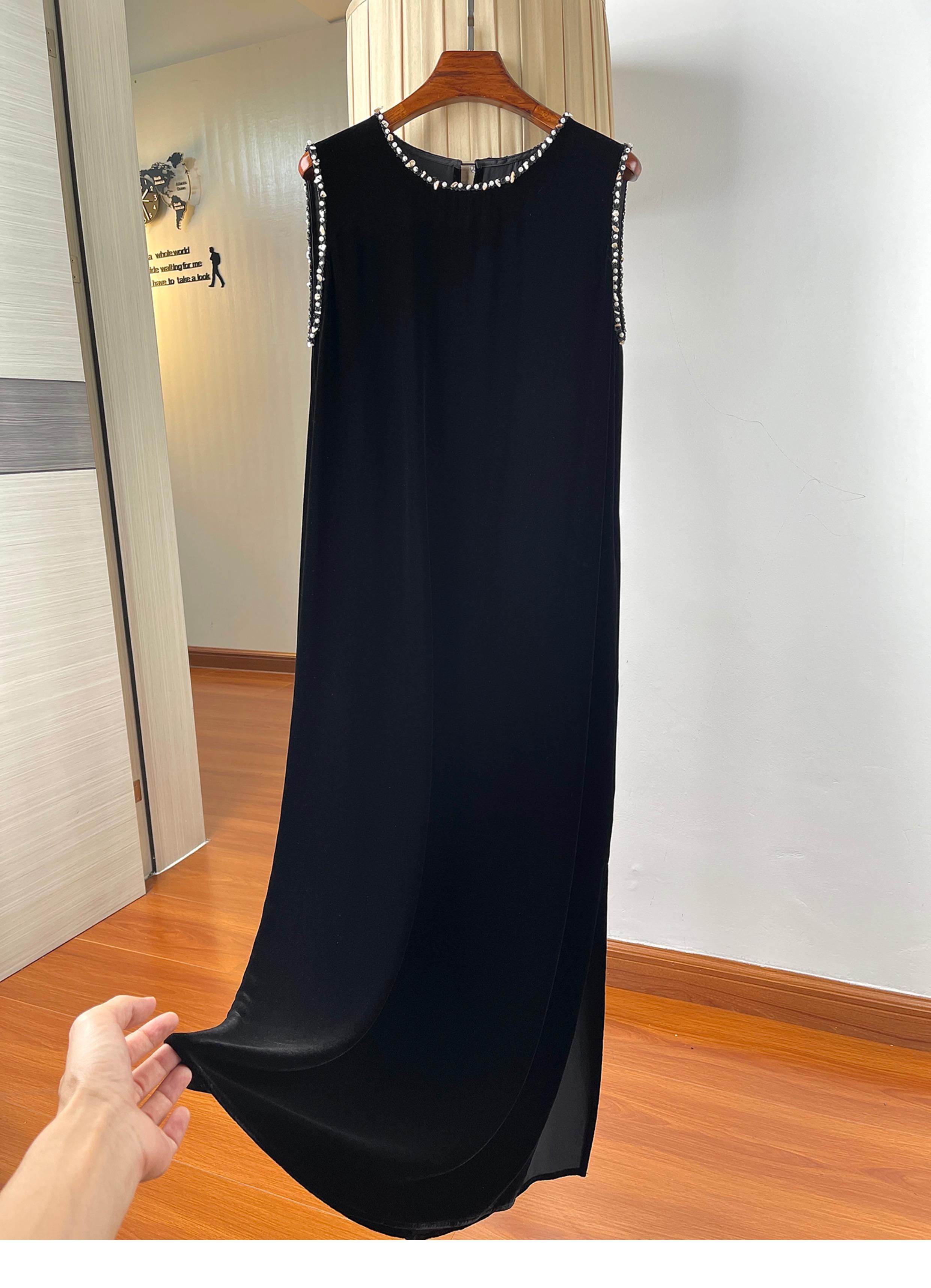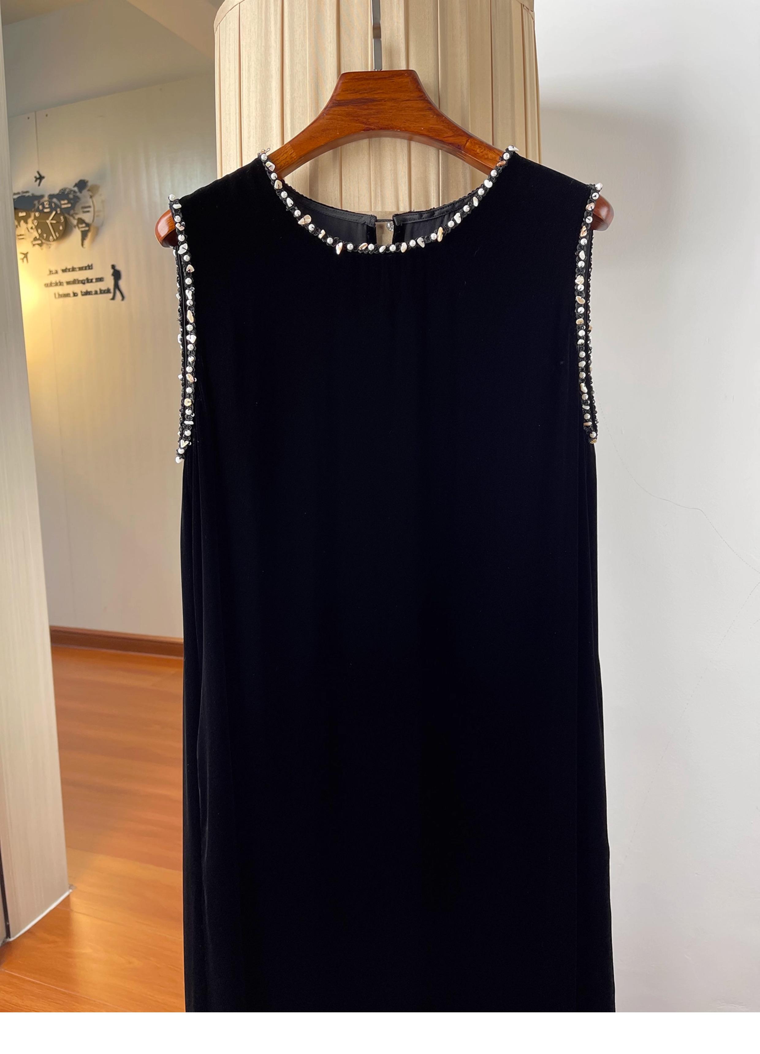 Vestido Chaleco sin Mangas de Terciopelo de Seda con Cuentas para Mujer Verano Drapeado Forma H Recto Adelgazante Abertura Lateral Vestido Falda Larga