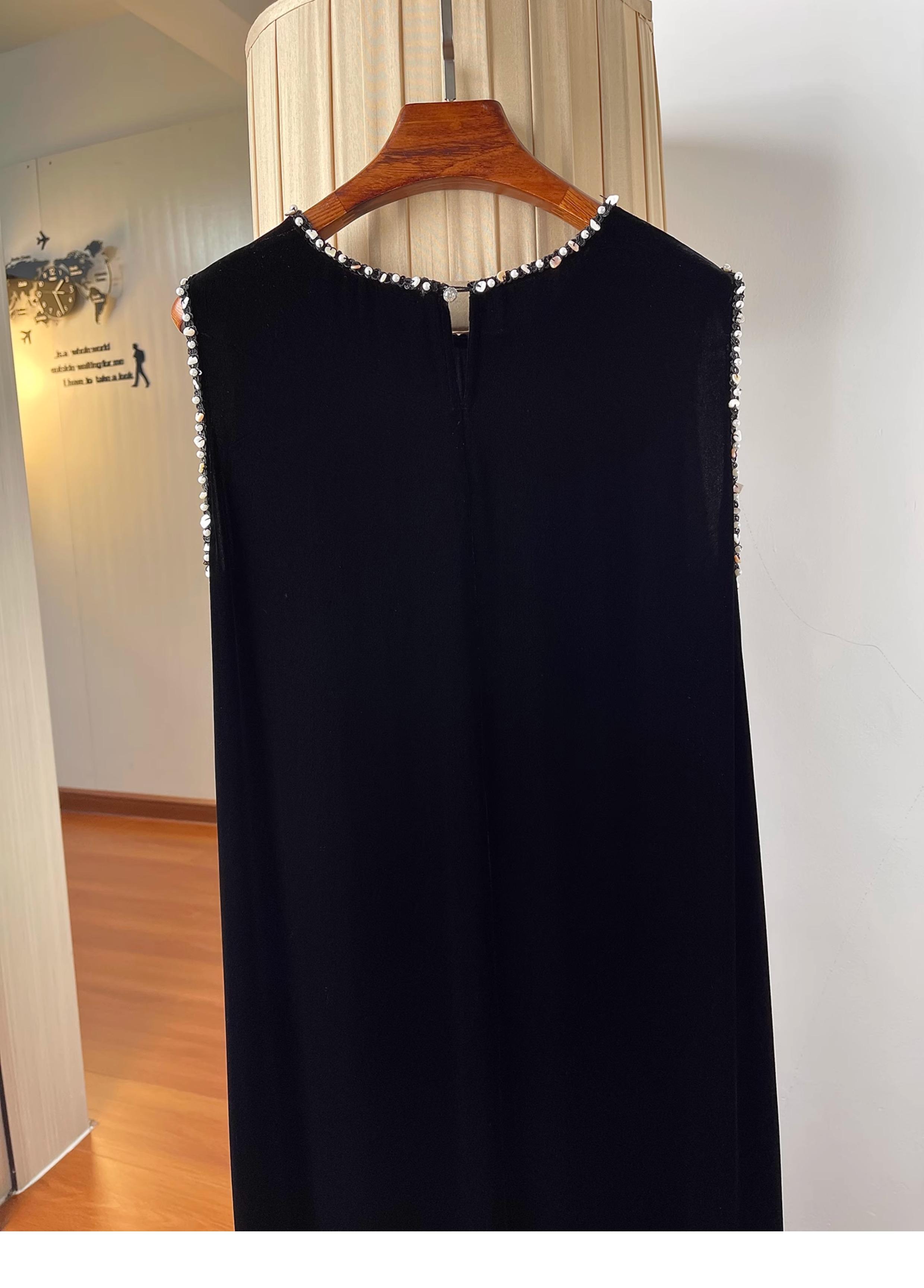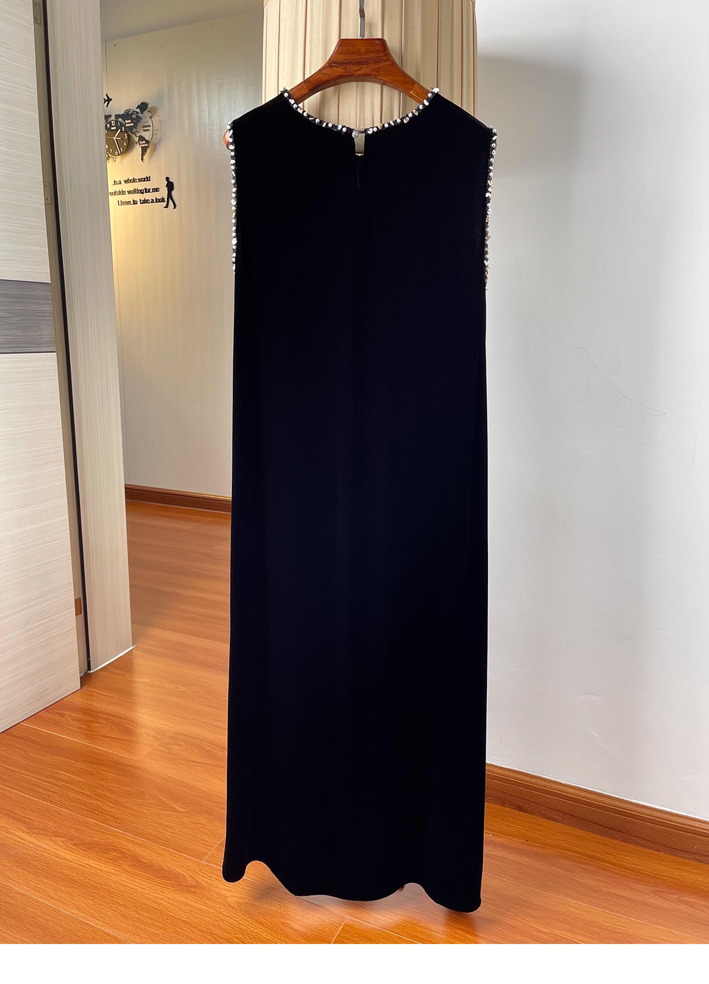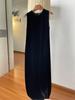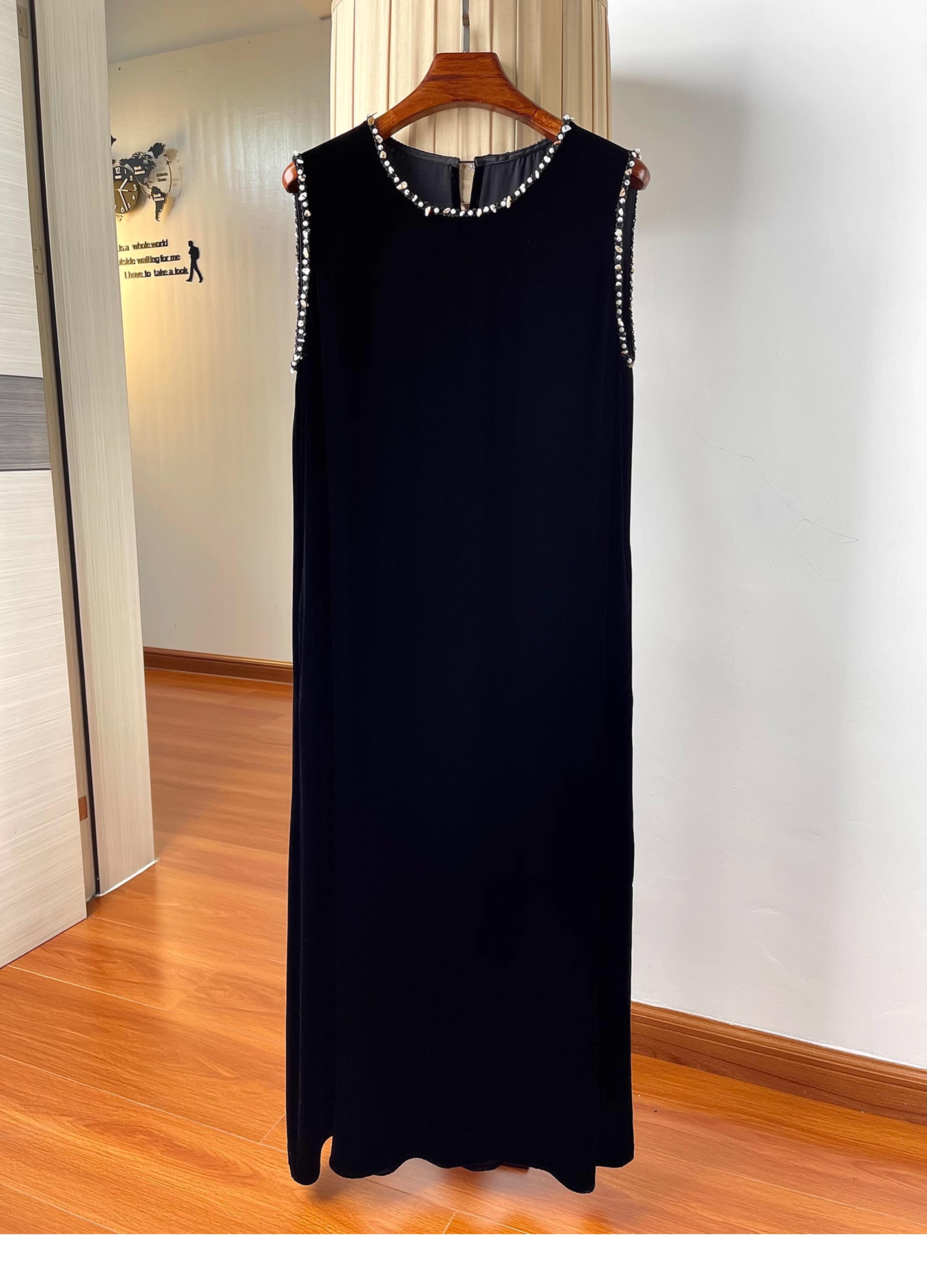 Vestido Chaleco sin Mangas de Terciopelo de Seda con Cuentas para Mujer Verano Drapeado Forma H Recto Adelgazante Abertura Lateral Vestido Falda Larga