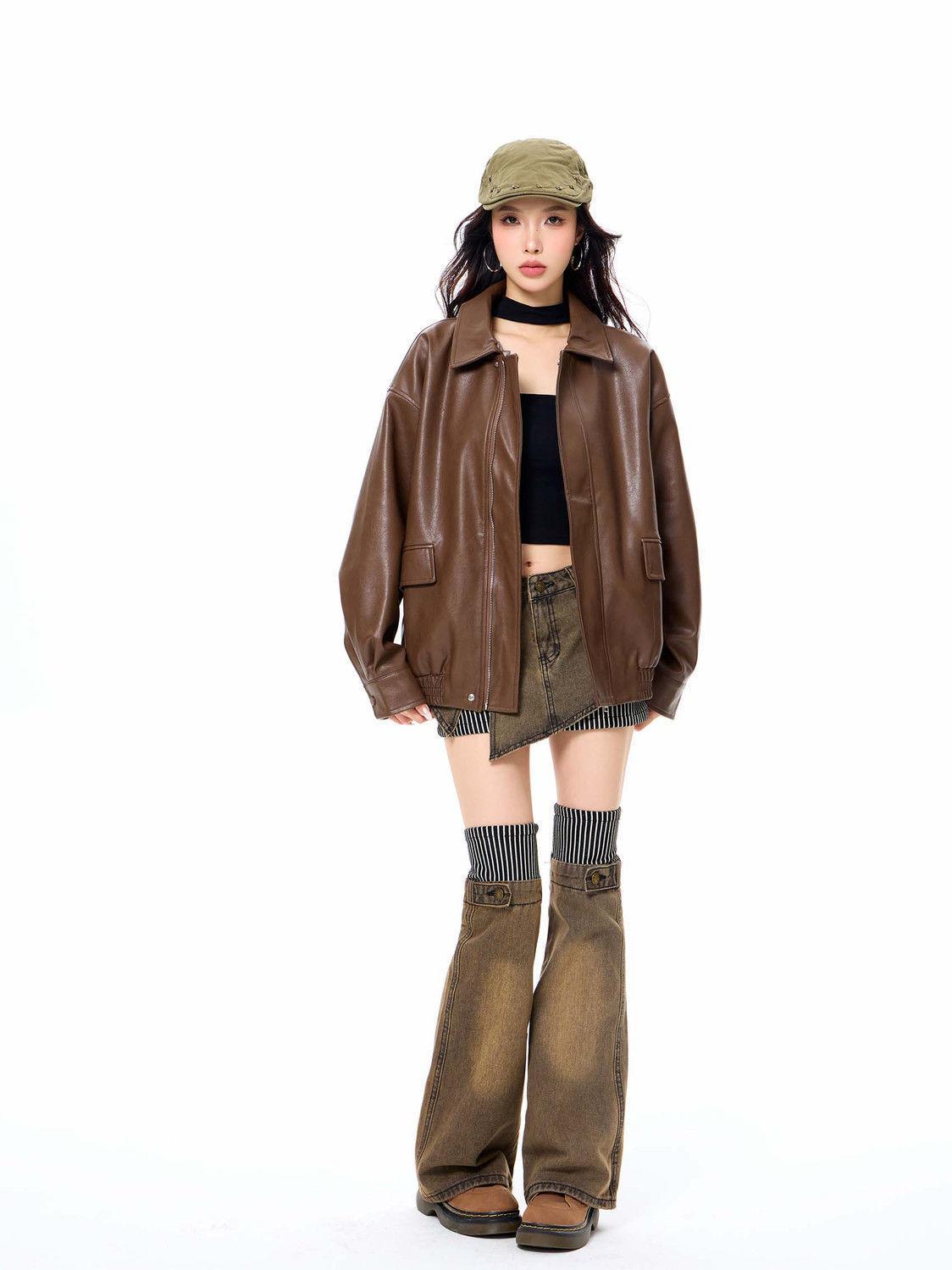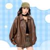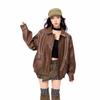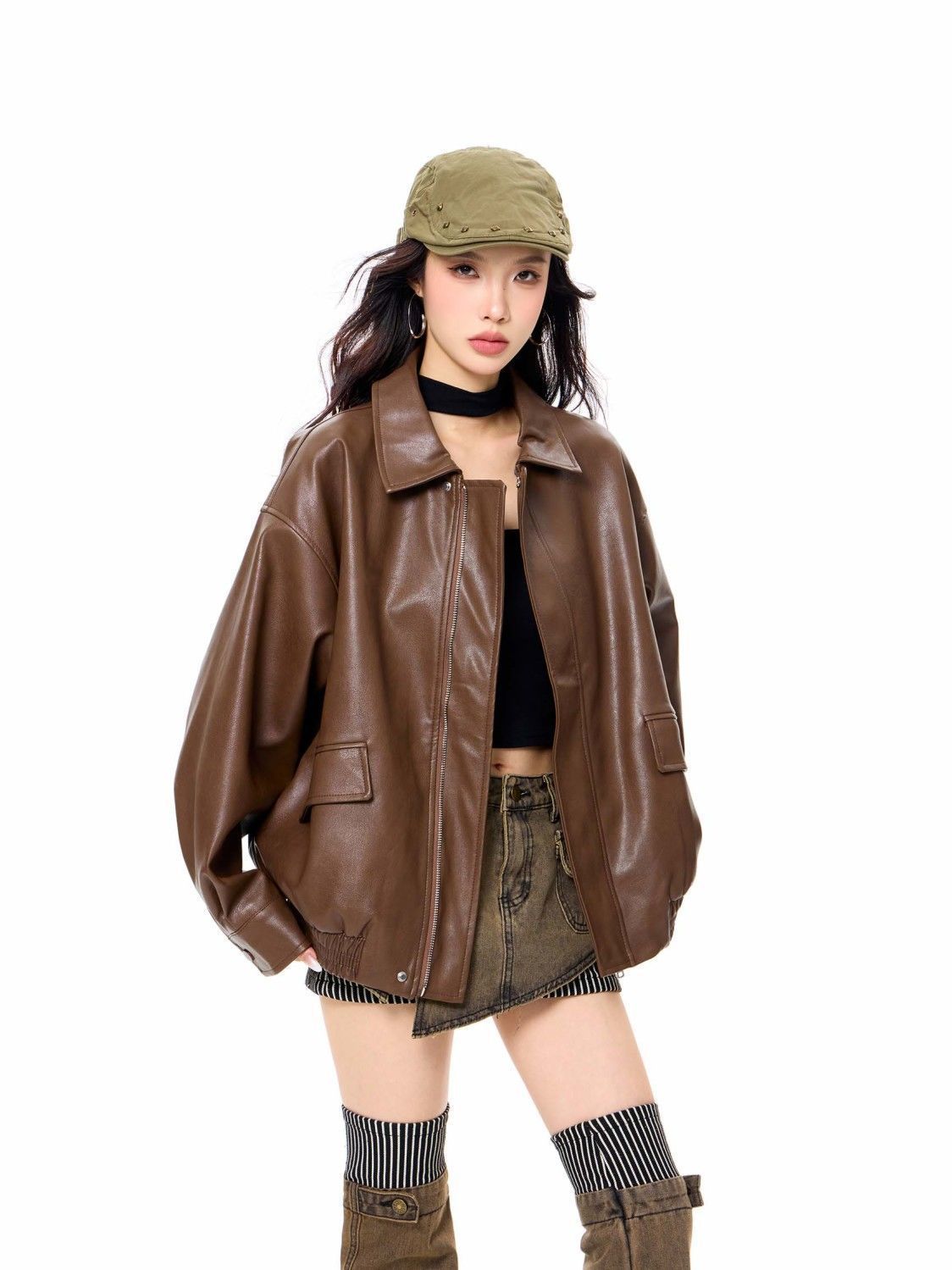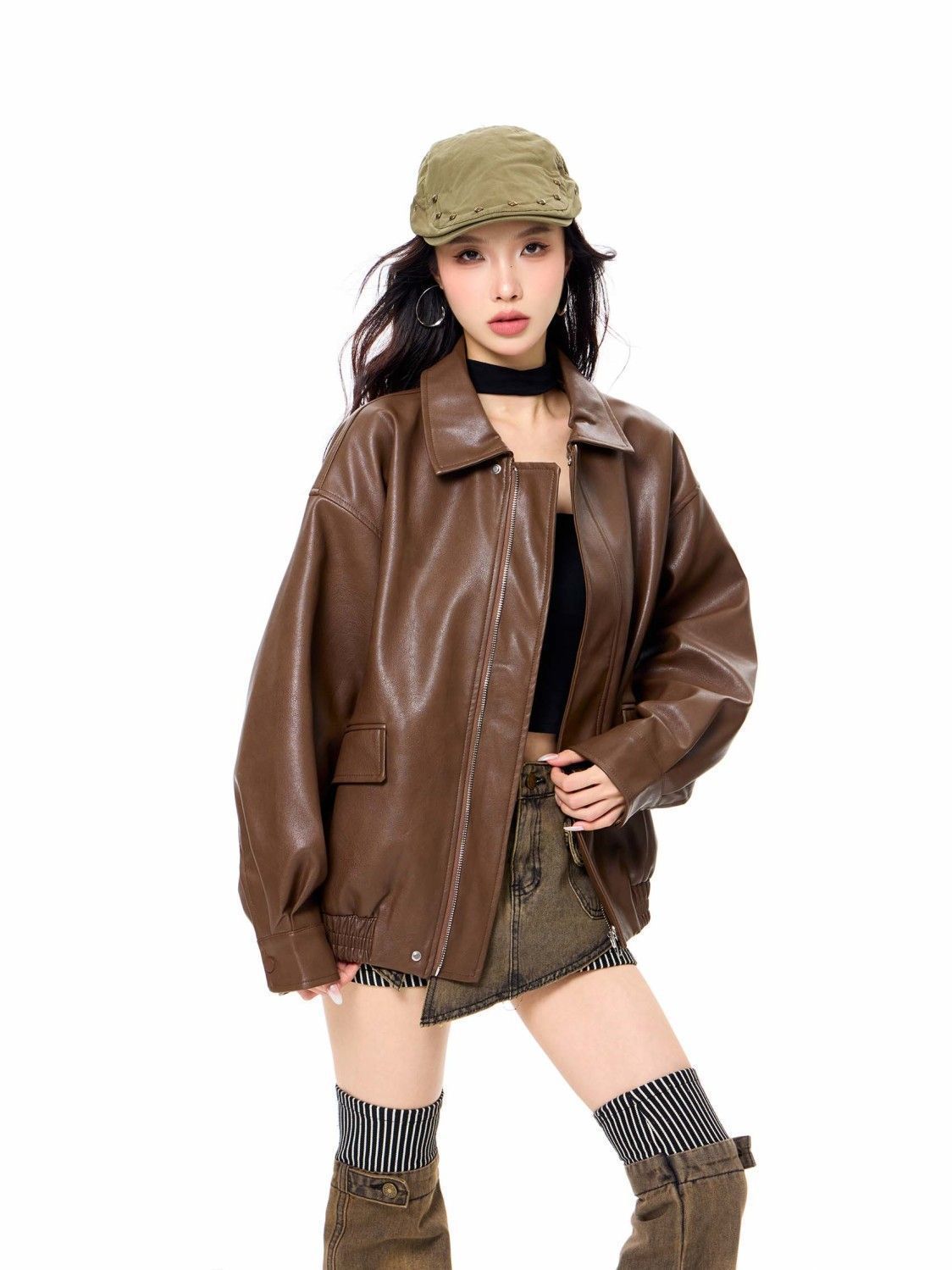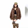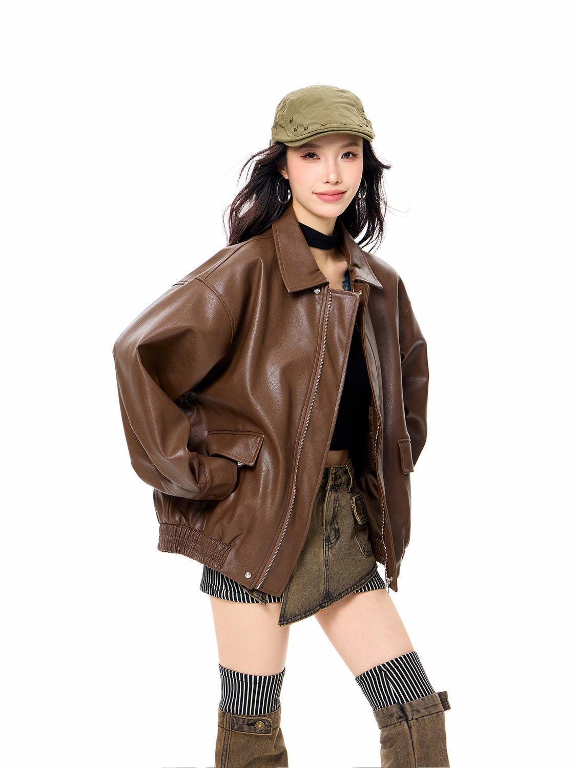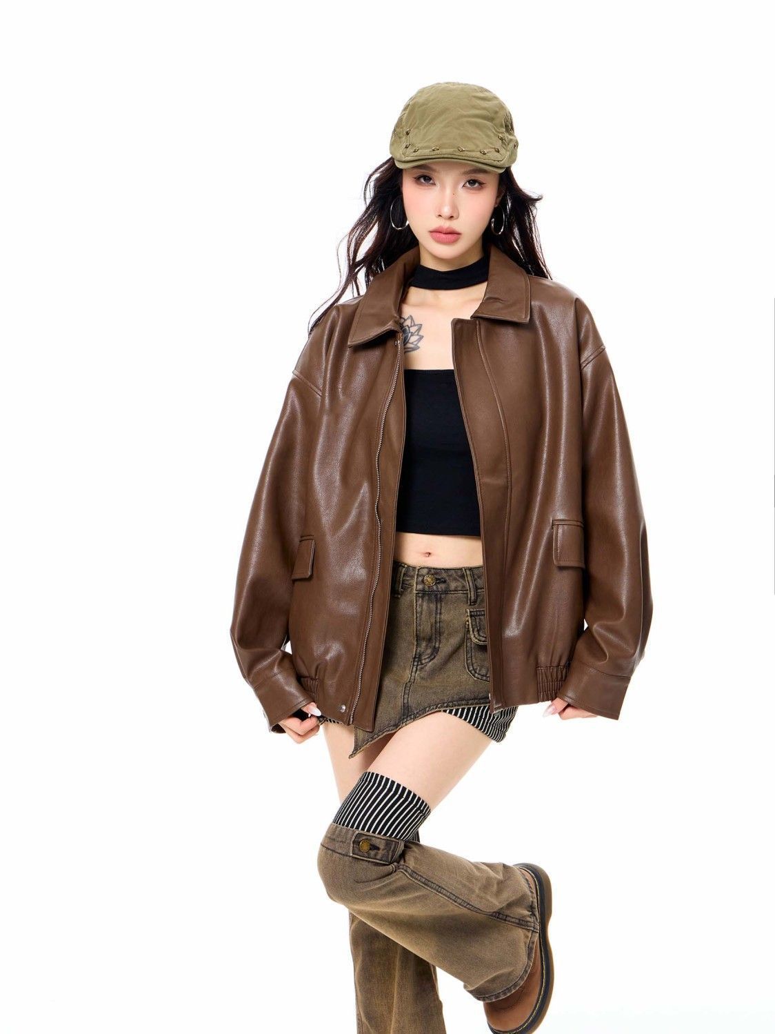 Chaqueta de Cuero Marrón Simple de Moda de Estilo Coreano de Alta Gama para Mujer Otoño 2025 Nuevo Estilo Motociclista Chaqueta de PU de Tendencia
