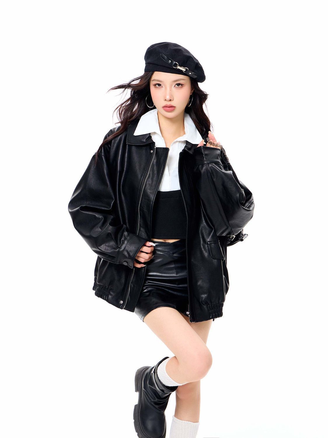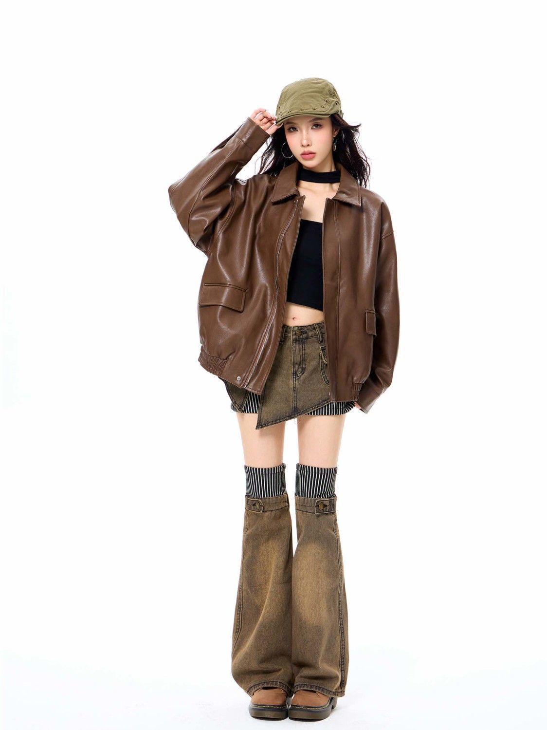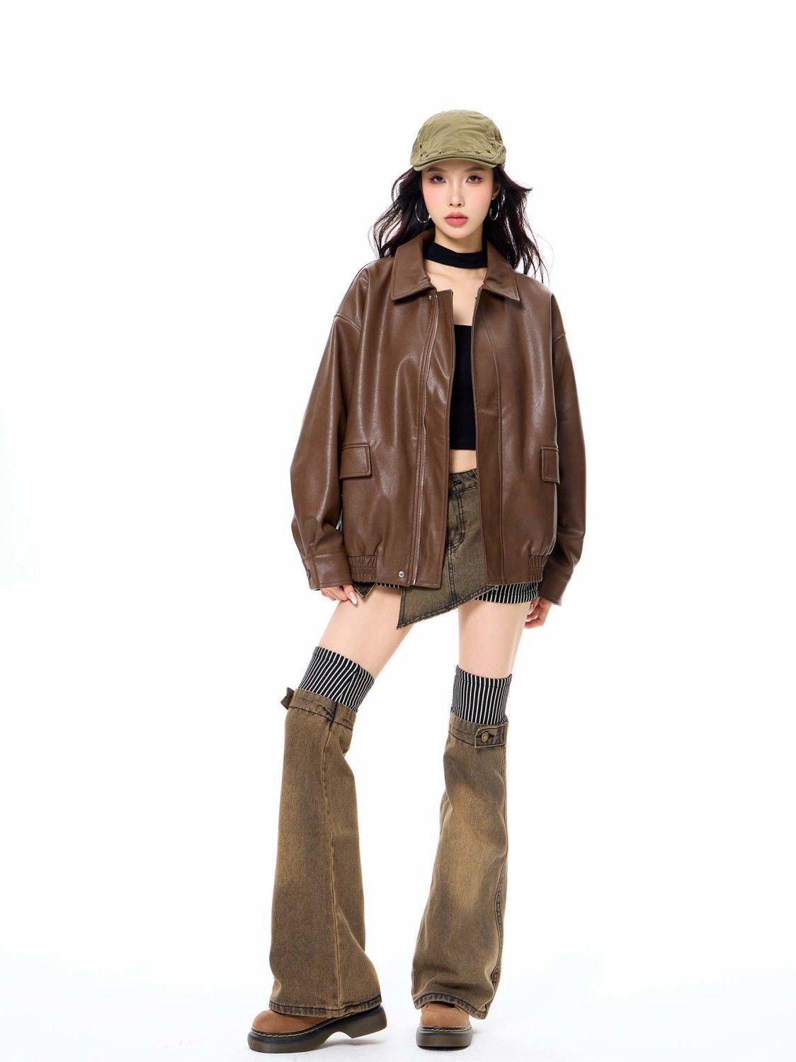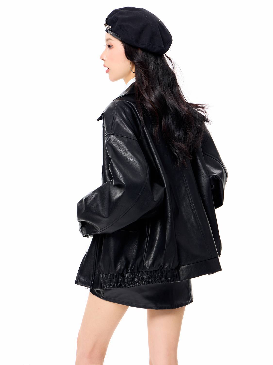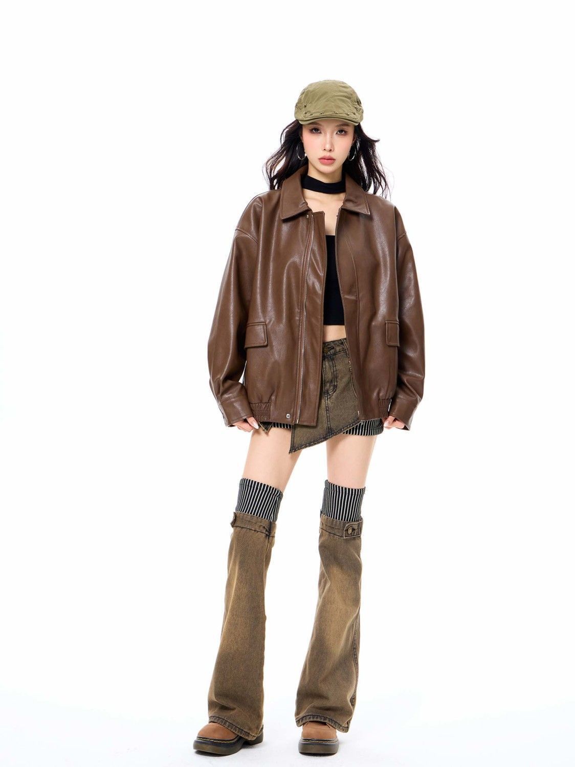 Chaqueta de Cuero Marrón Simple de Moda de Estilo Coreano de Alta Gama para Mujer Otoño 2025 Nuevo Estilo Motociclista Chaqueta de PU de Tendencia