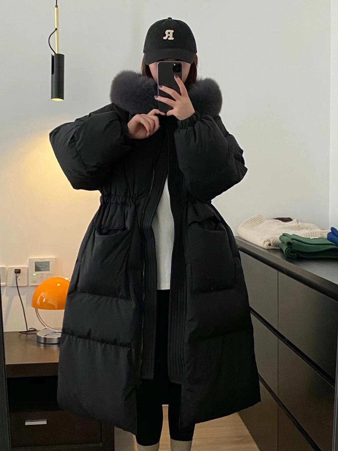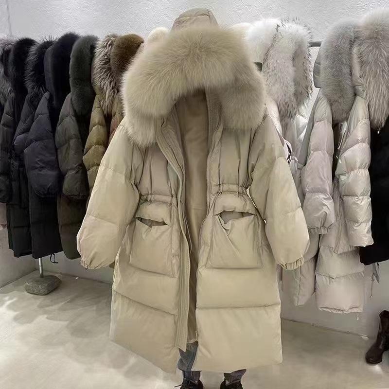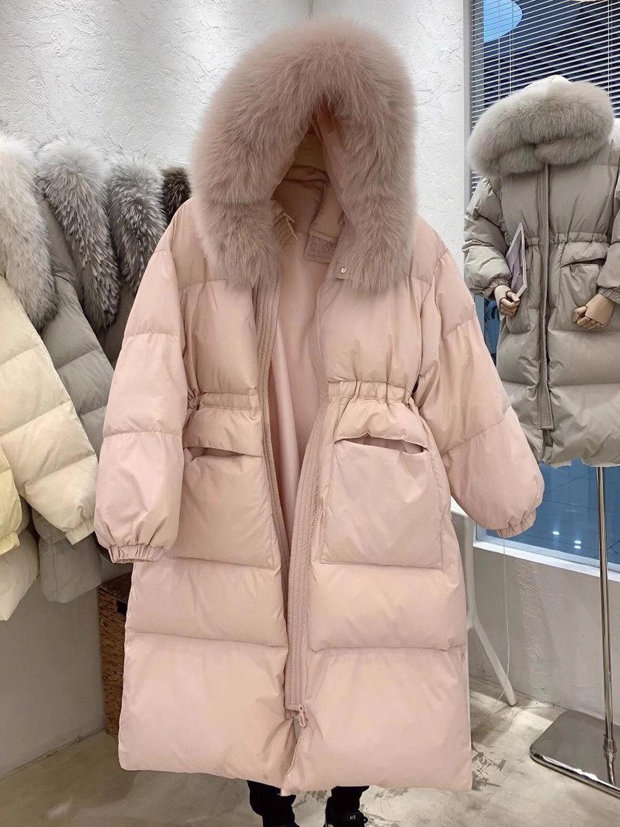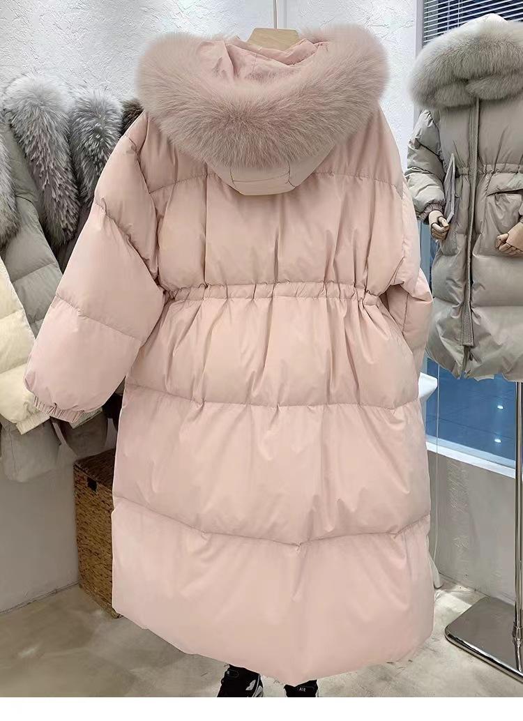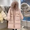 Abrigo Largo de Plumas con Cuello de Piel de Zorro para Mujer 2025 Invierno Engrosado Dulce Entallado en la Cintura Plumón de Pato Blanco Resistente al Frío Adelgazante