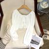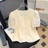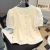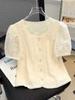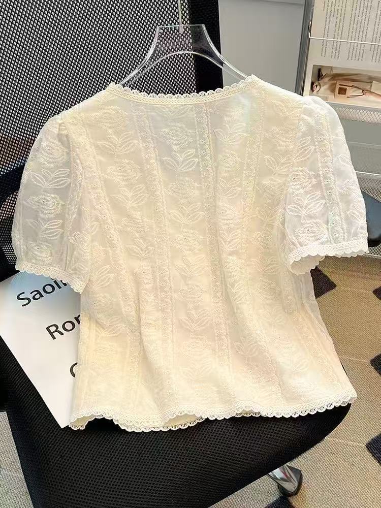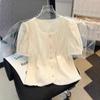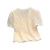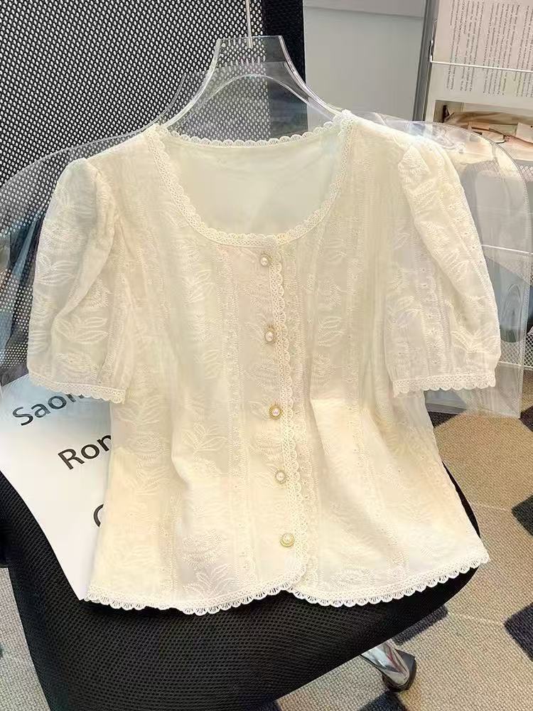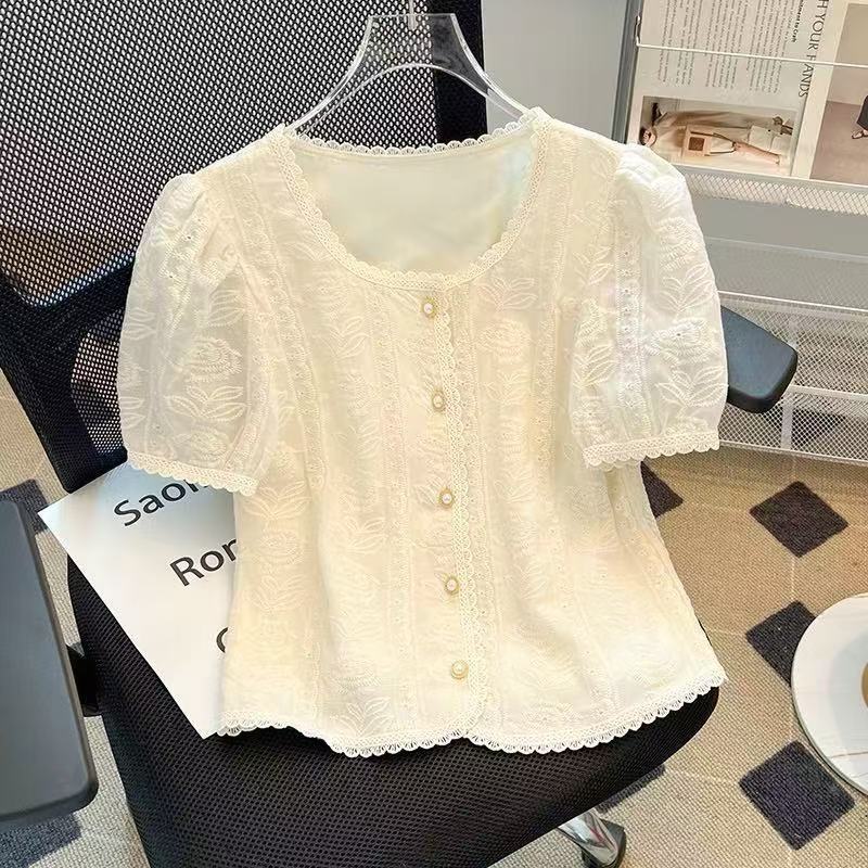 Blusa de Encaje de Manga Abullonada Francesa para Mujer Verano Nueva Elegante Camisa de Gasa Manga Corta Talla Grande Camisa Pequeña para Mujer