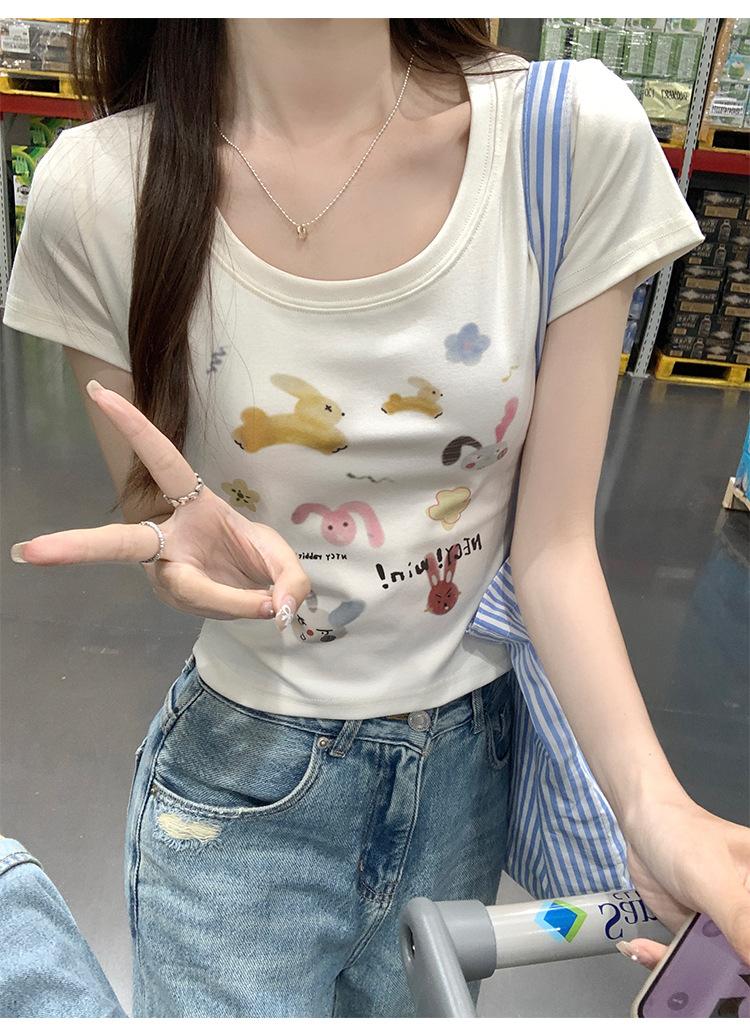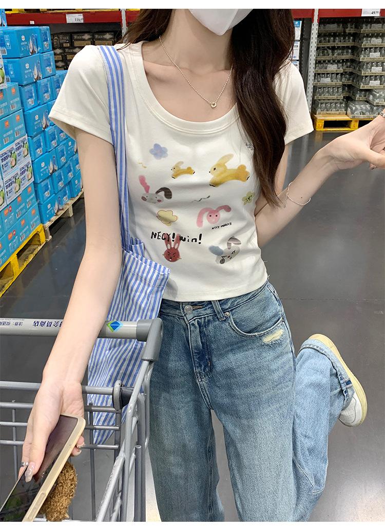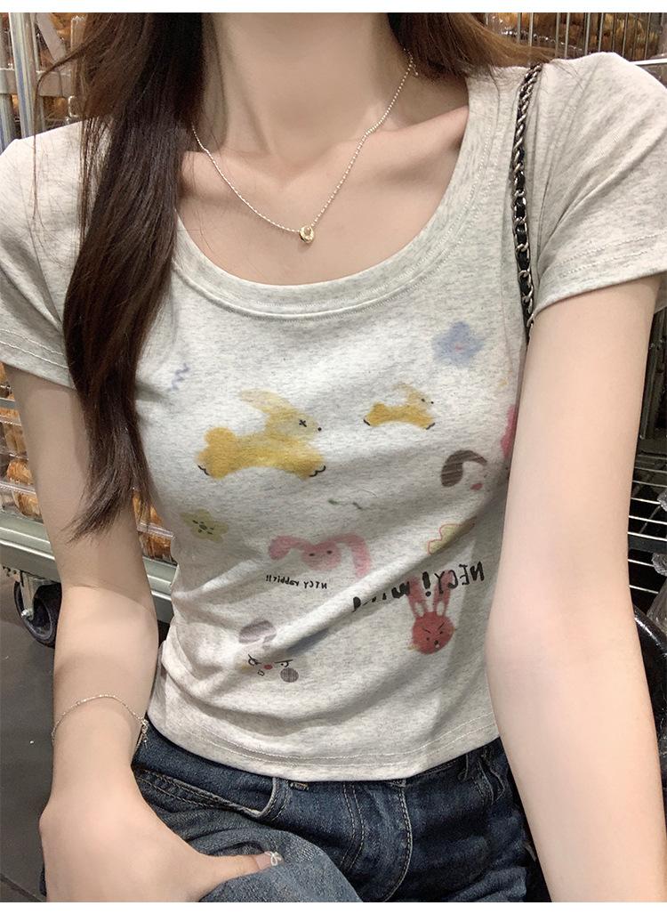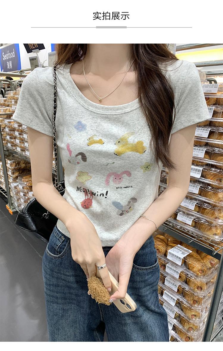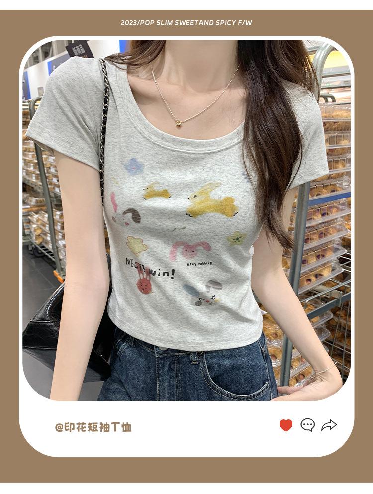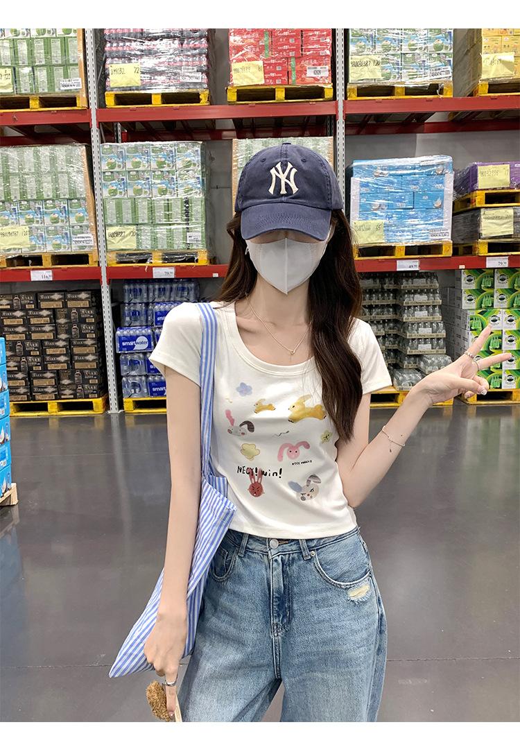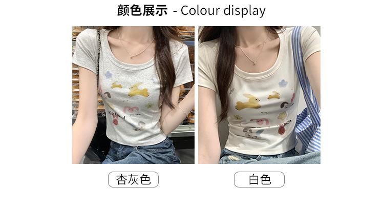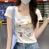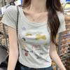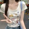 Foto Real de Camiseta de Manga Corta con Cuello en U y Hombro Derecho Descubierto para Mujer Verano 2025 Nuevo Diseño Niche de Estampado de Dibujos Animados Top Corto
