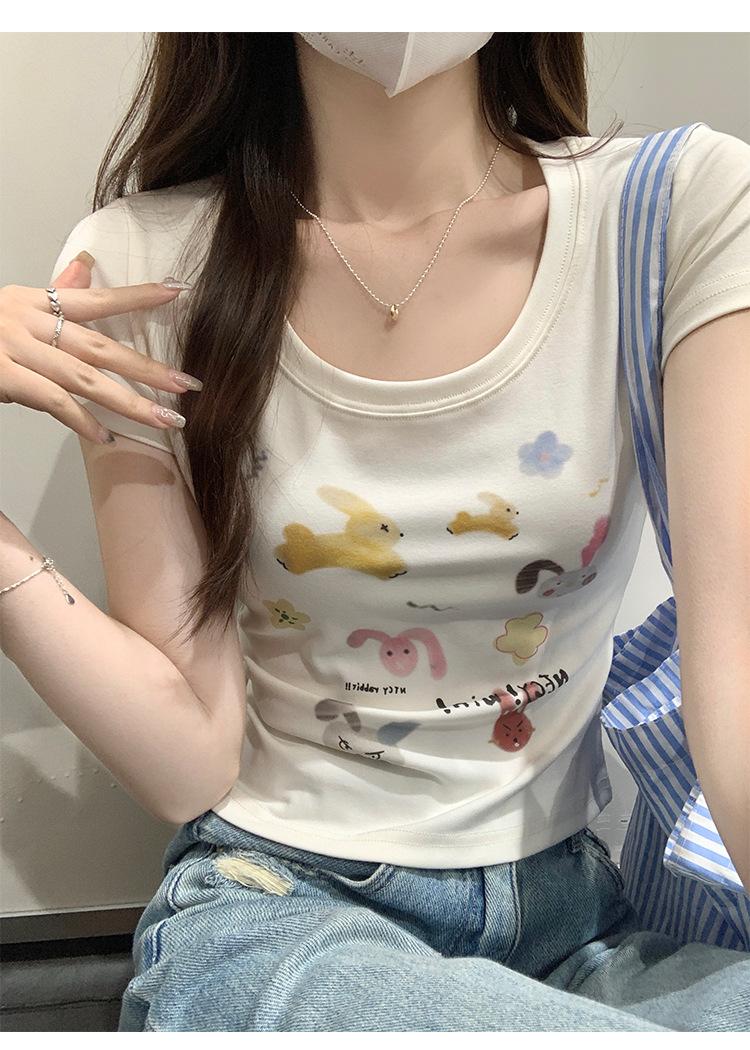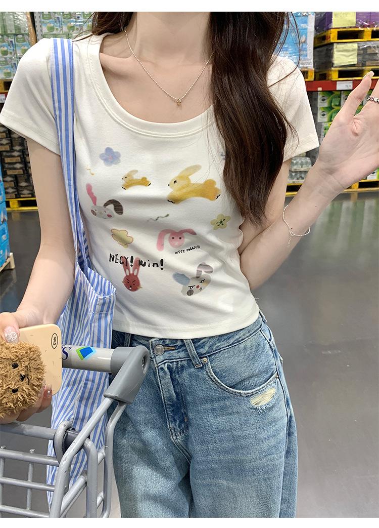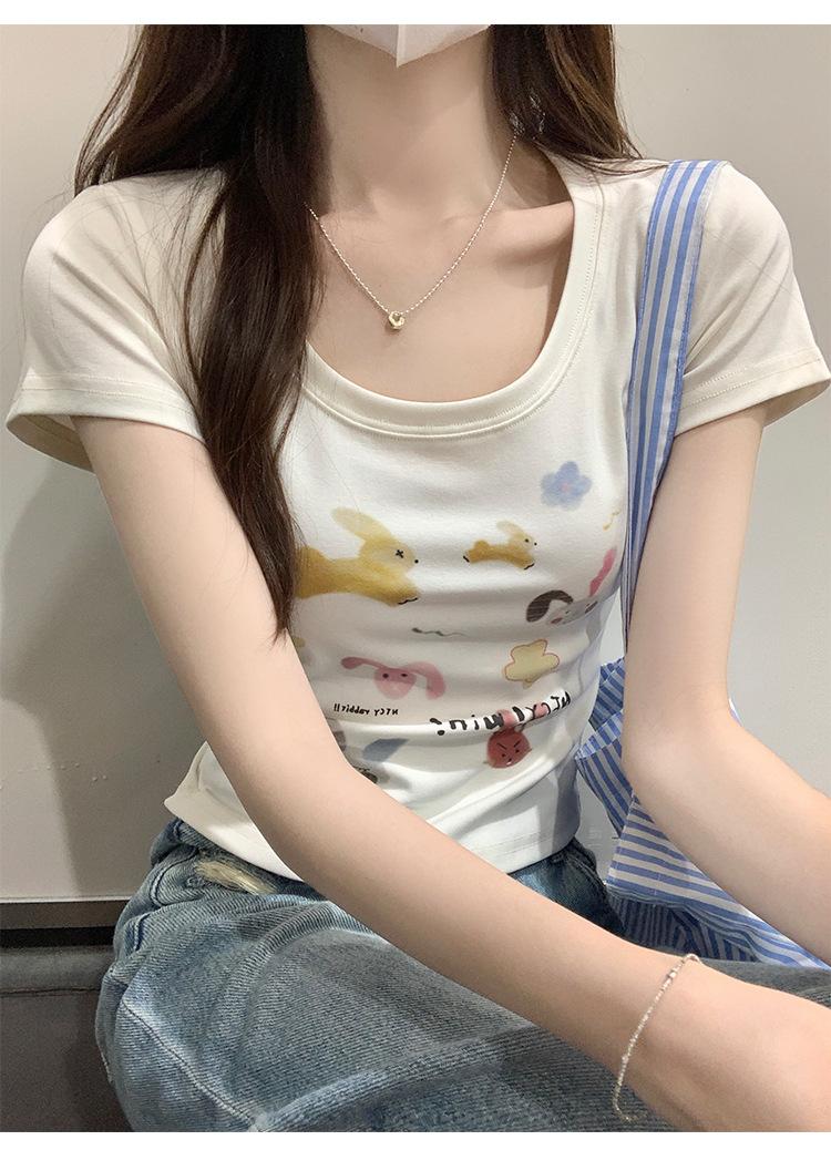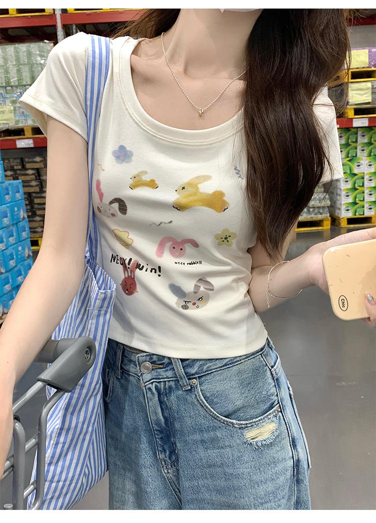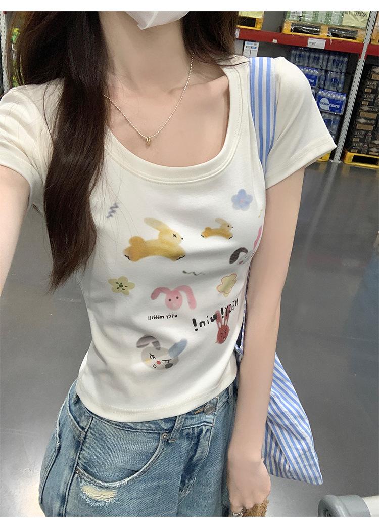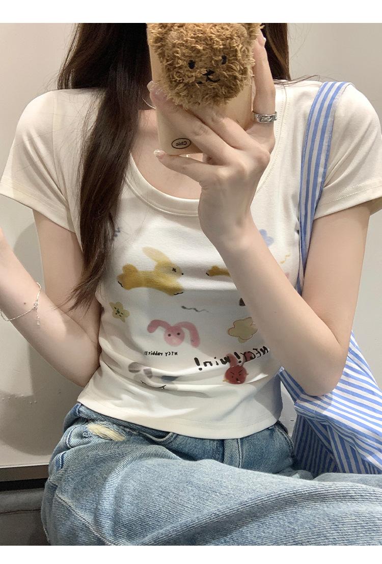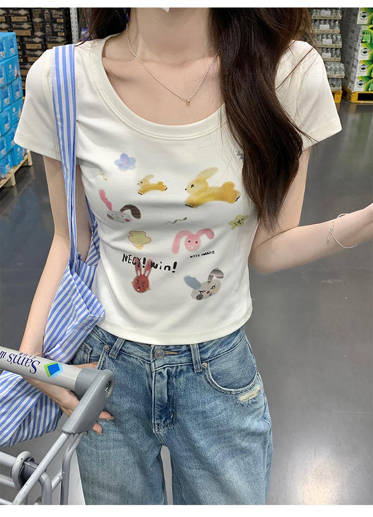Foto Real de Camiseta de Manga Corta con Cuello en U y Hombro Derecho Descubierto para Mujer Verano 2025 Nuevo Diseño Niche de Estampado de Dibujos Animados Top Corto
