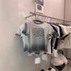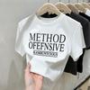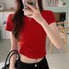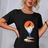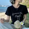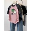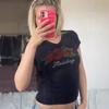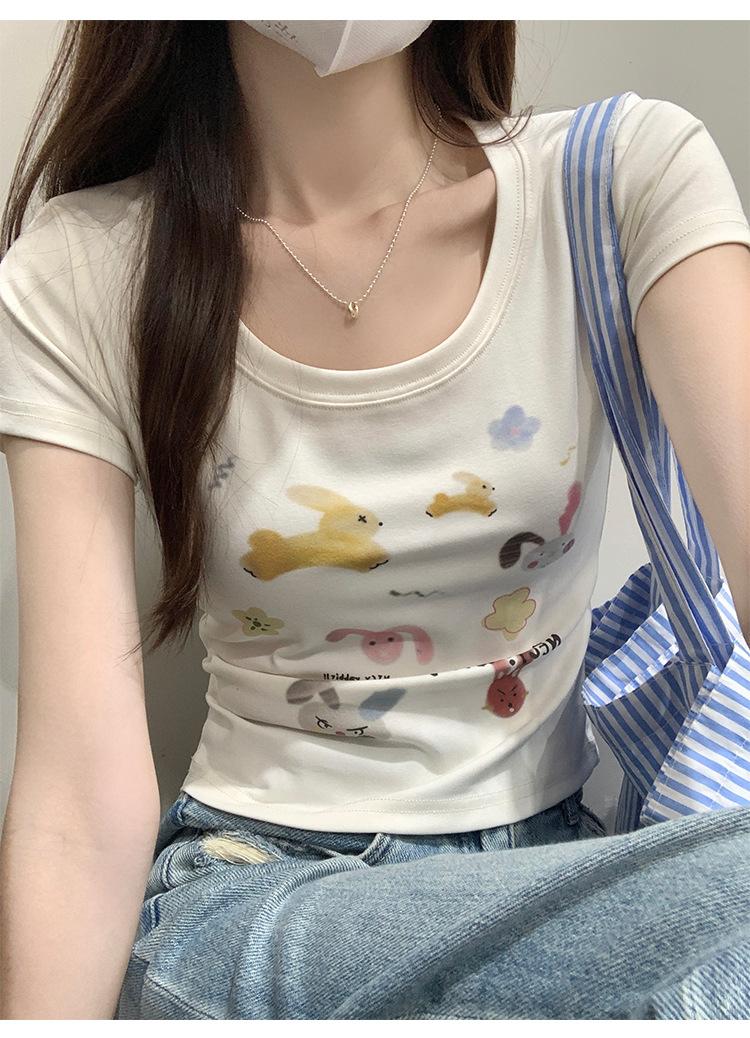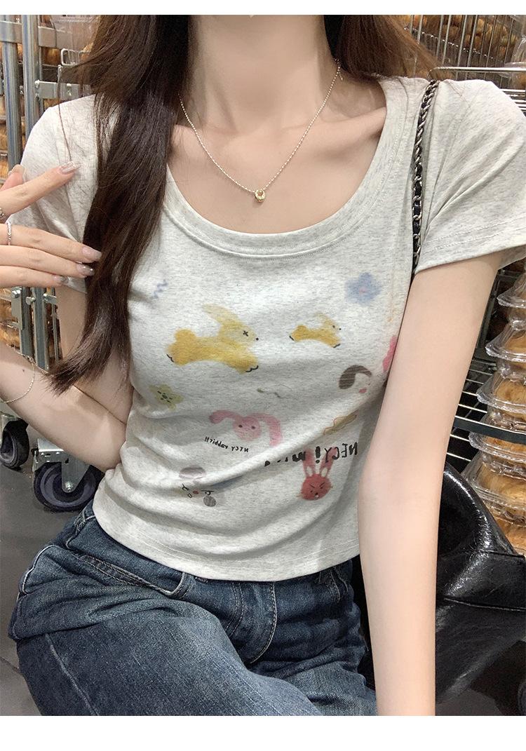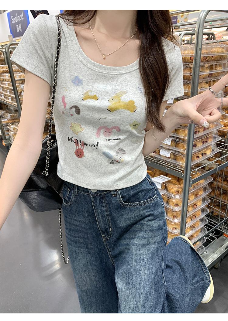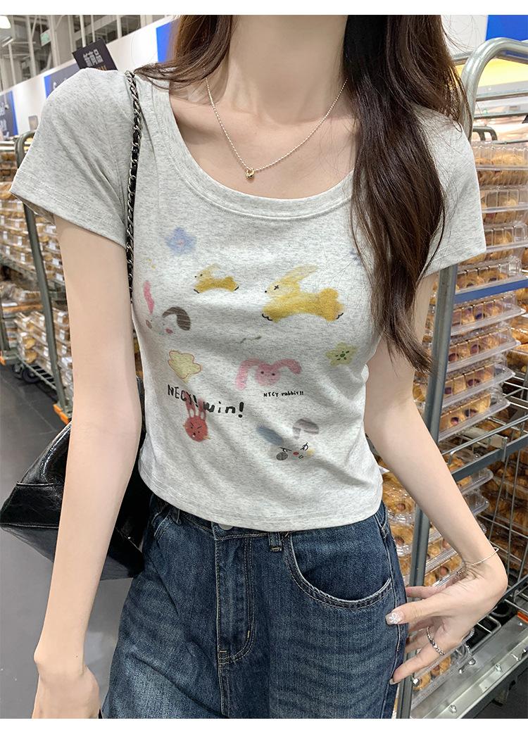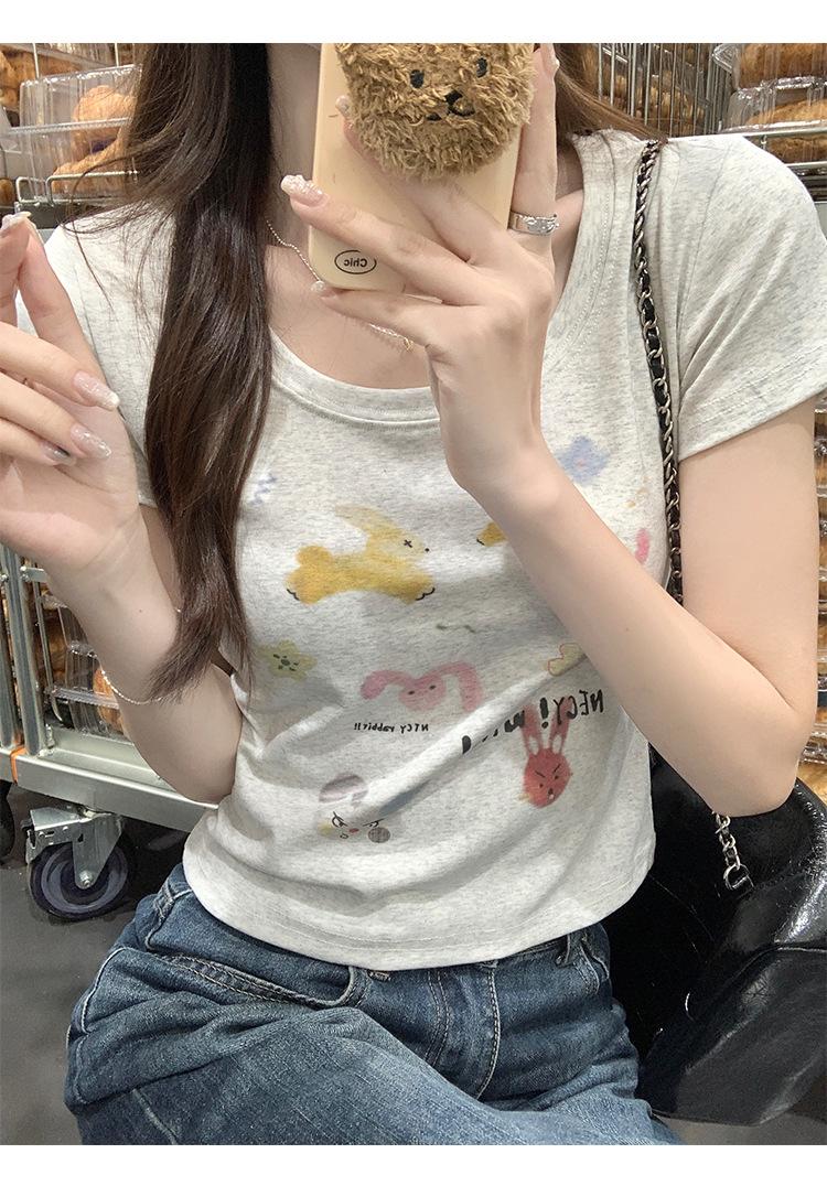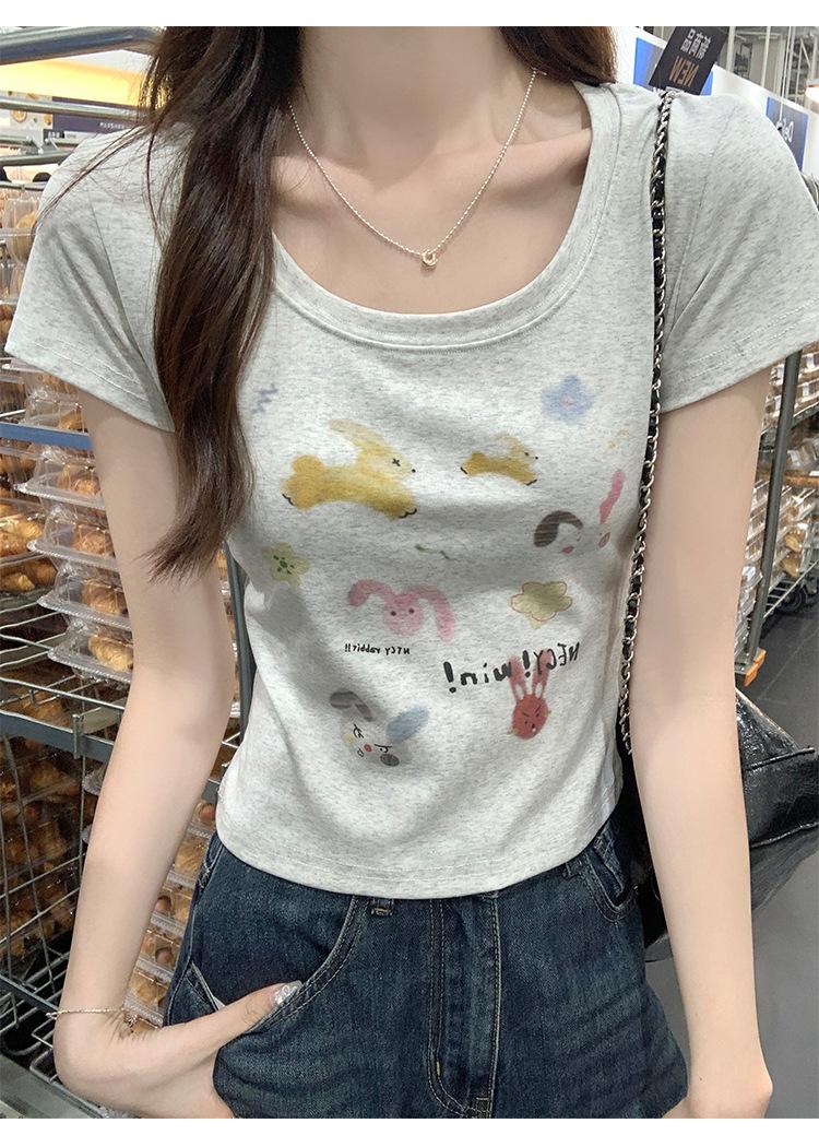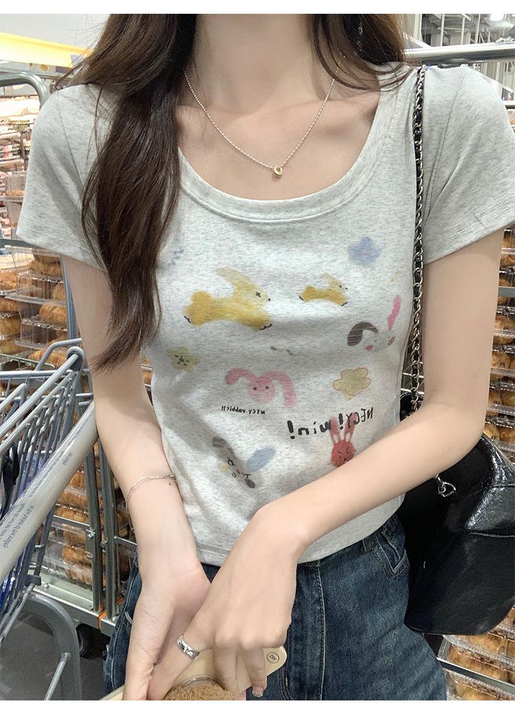 Foto Real de Camiseta de Manga Corta con Cuello en U y Hombro Derecho Descubierto para Mujer Verano 2025 Nuevo Diseño Niche de Estampado de Dibujos Animados Top Corto